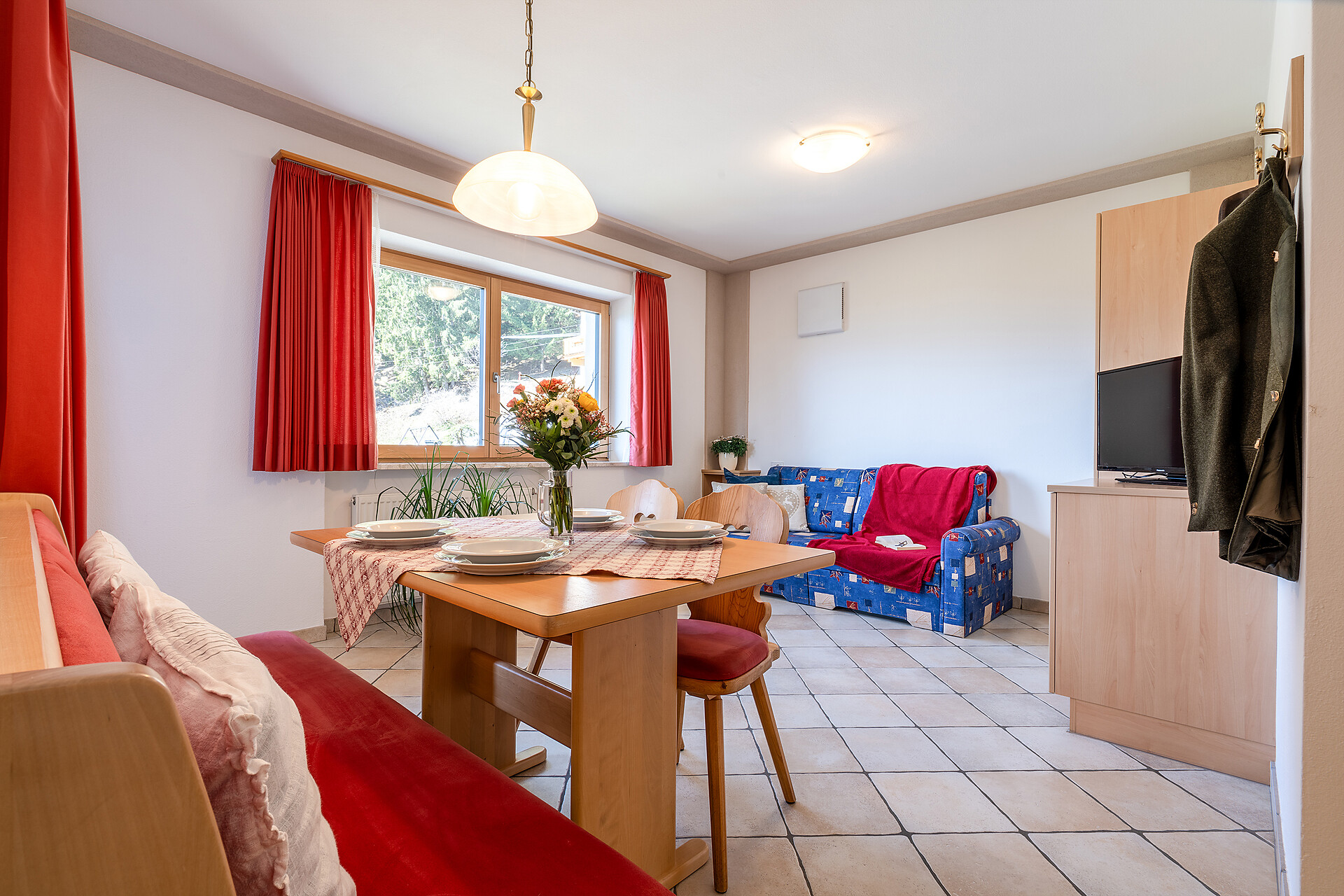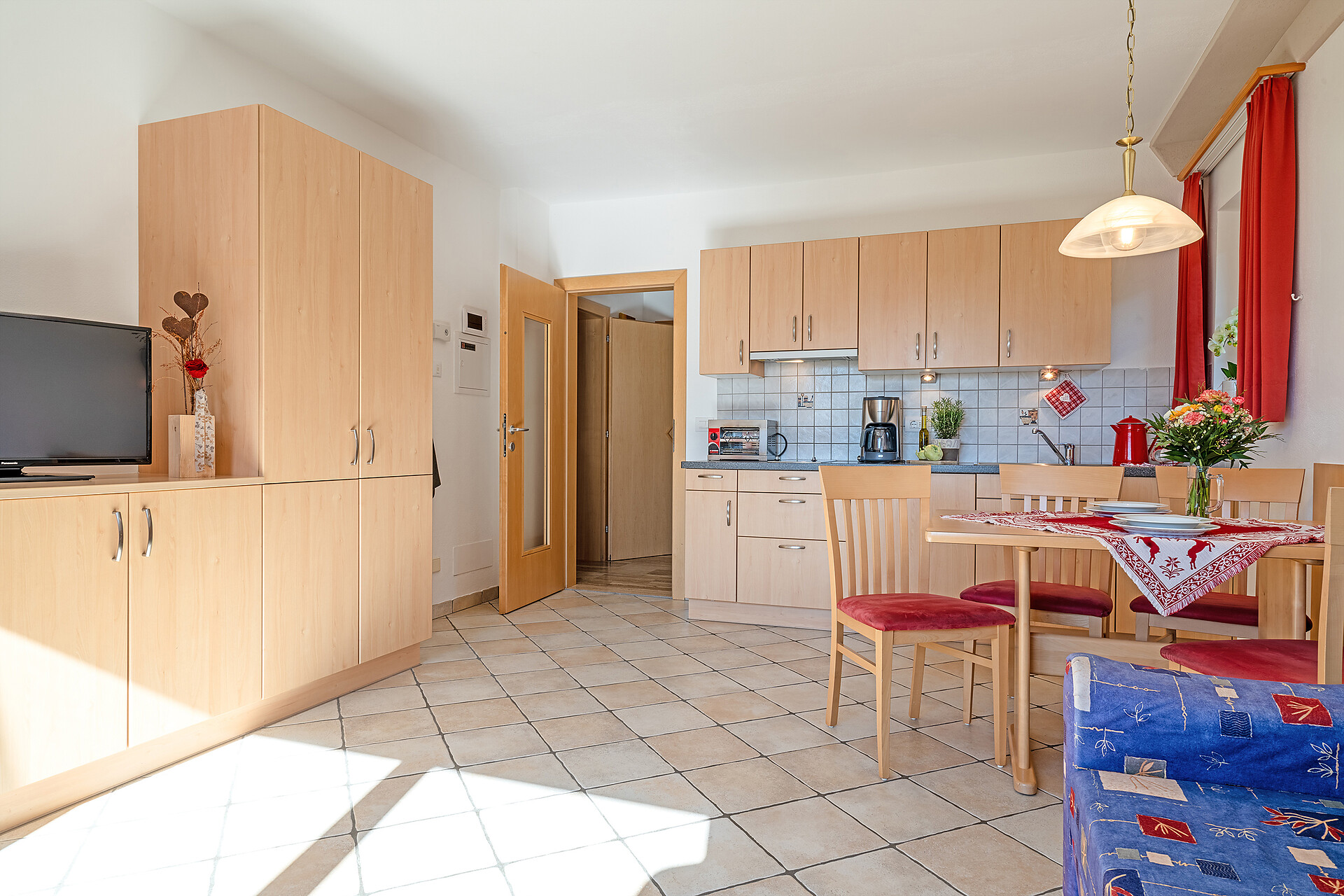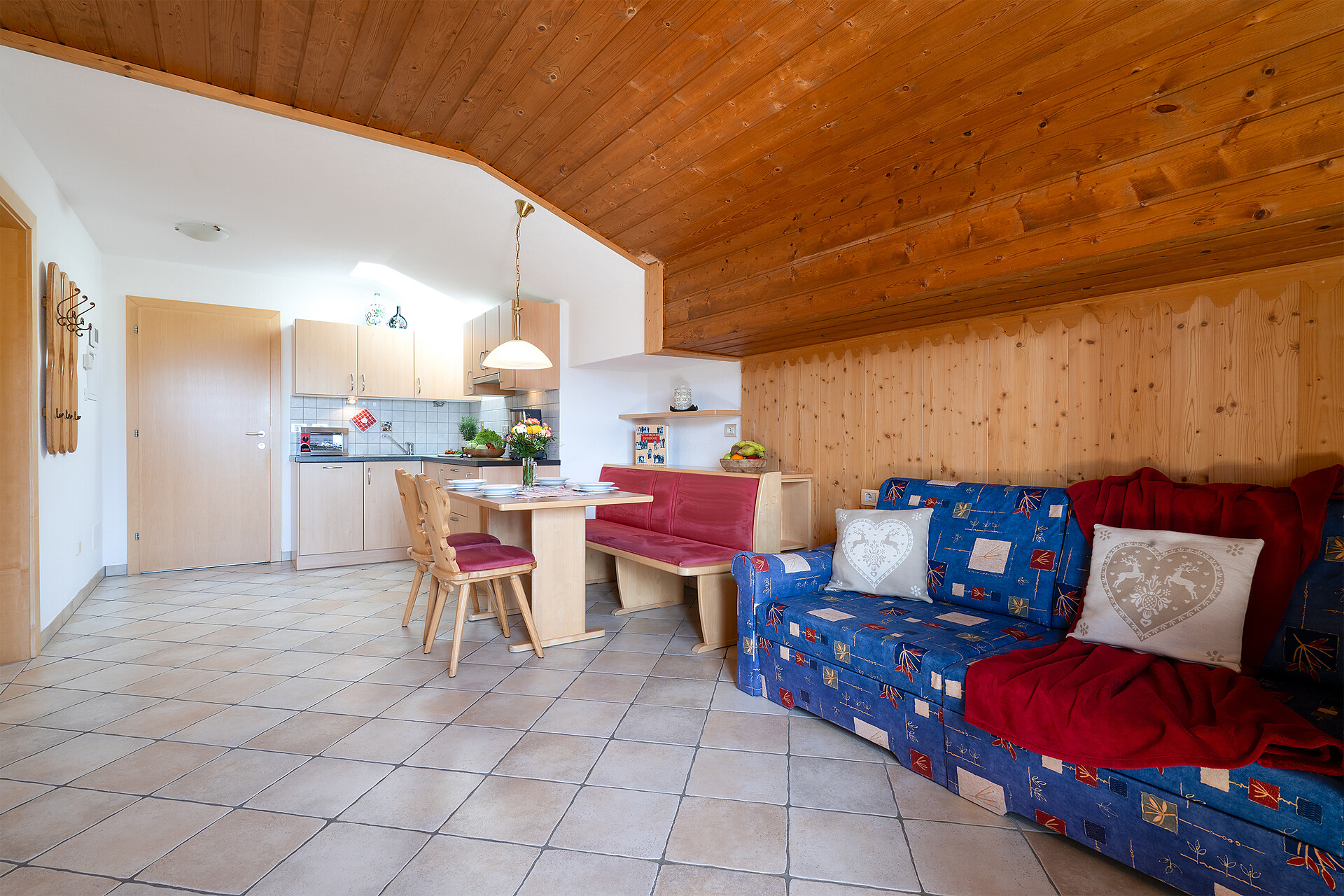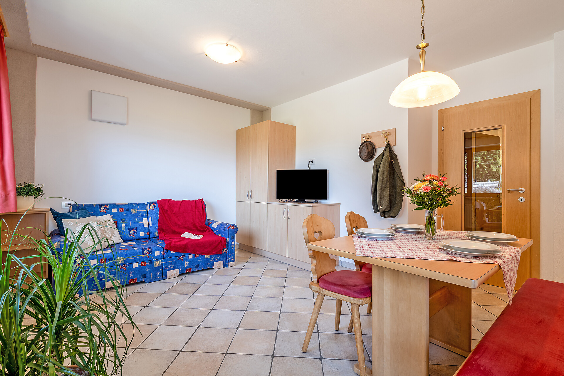 The apartment comes with dishes, towels, bed linen and free Wi-Fi. It features a bedroom with double bed and sofa bed, a living room with an additional sofa bed, wardrobe and satellite TV, as well as a bathroom with shower, toilet, bidet and hairdryer. The living area includes a dining table, sofa and seating area, while the kitchen is fully equipped with fridge, freezer, dishwasher, coffee machine, kettle, toaster and stove. A balcony with mountain views, a garden with playground, a storage room and a boot dryer add to the comfort. Free covered parking and an electric car charging station are also available.