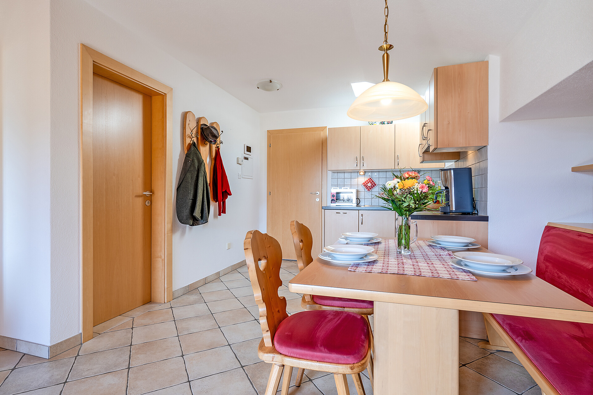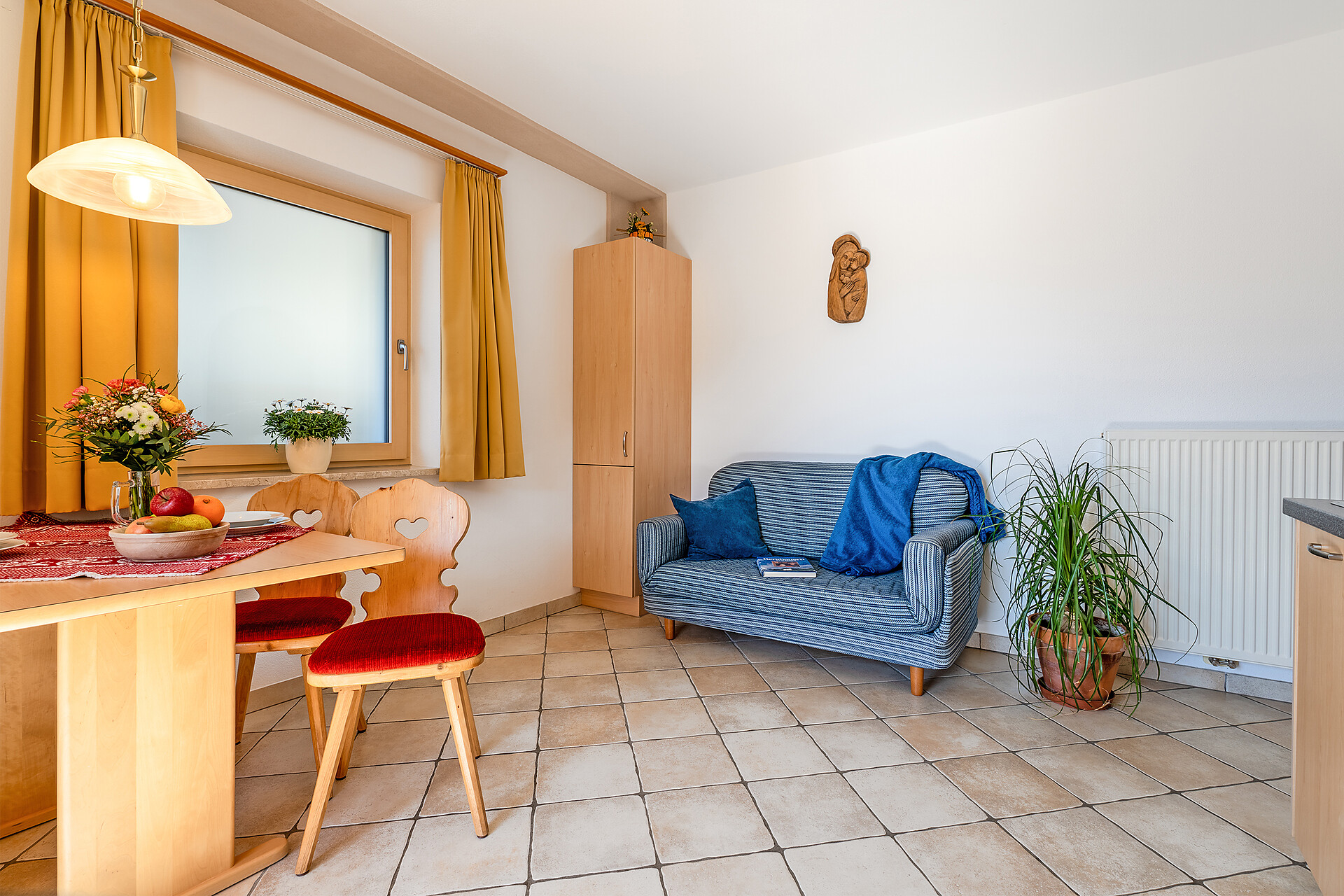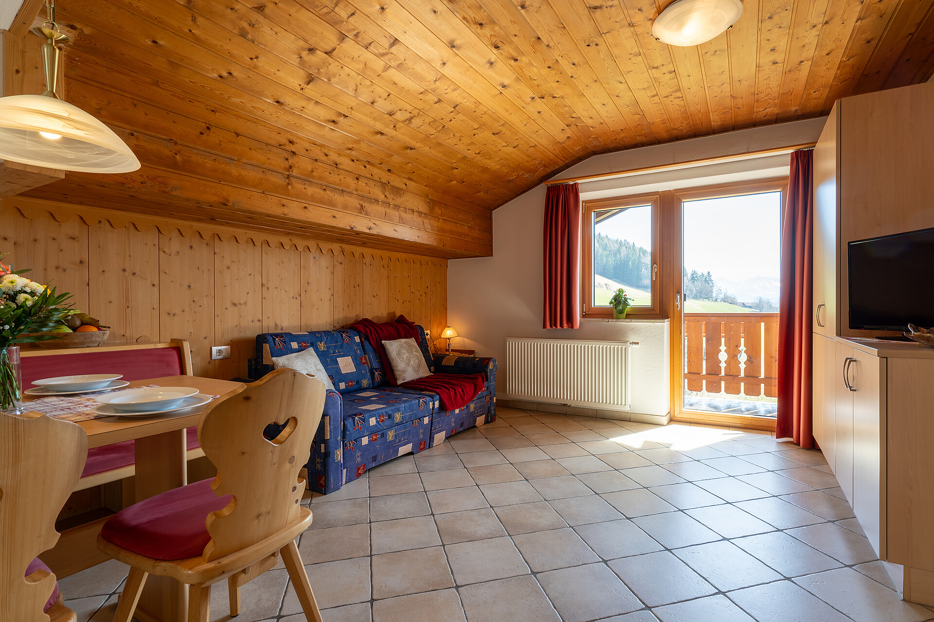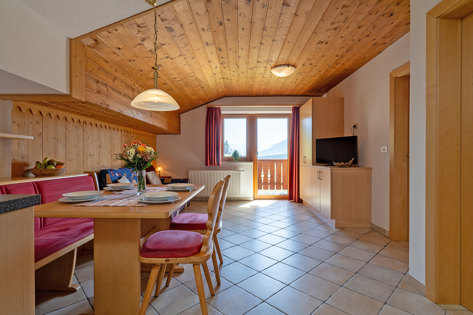 The apartment comes with dishes, towels, bed linen and free Wi-Fi. It features a bedroom with double bed and sofa bed, a living room with an additional sofa bed, wardrobe and satellite TV, as well as a bathroom with shower, toilet, bidet and hairdryer. The living area includes a dining table, sofa and seating area, while the kitchen is fully equipped with fridge, freezer, dishwasher, coffee machine, kettle, toaster and stove. A balcony with mountain views, a garden with playground, a storage room and a boot dryer add to the comfort. Free covered parking and an electric car charging station are also available.