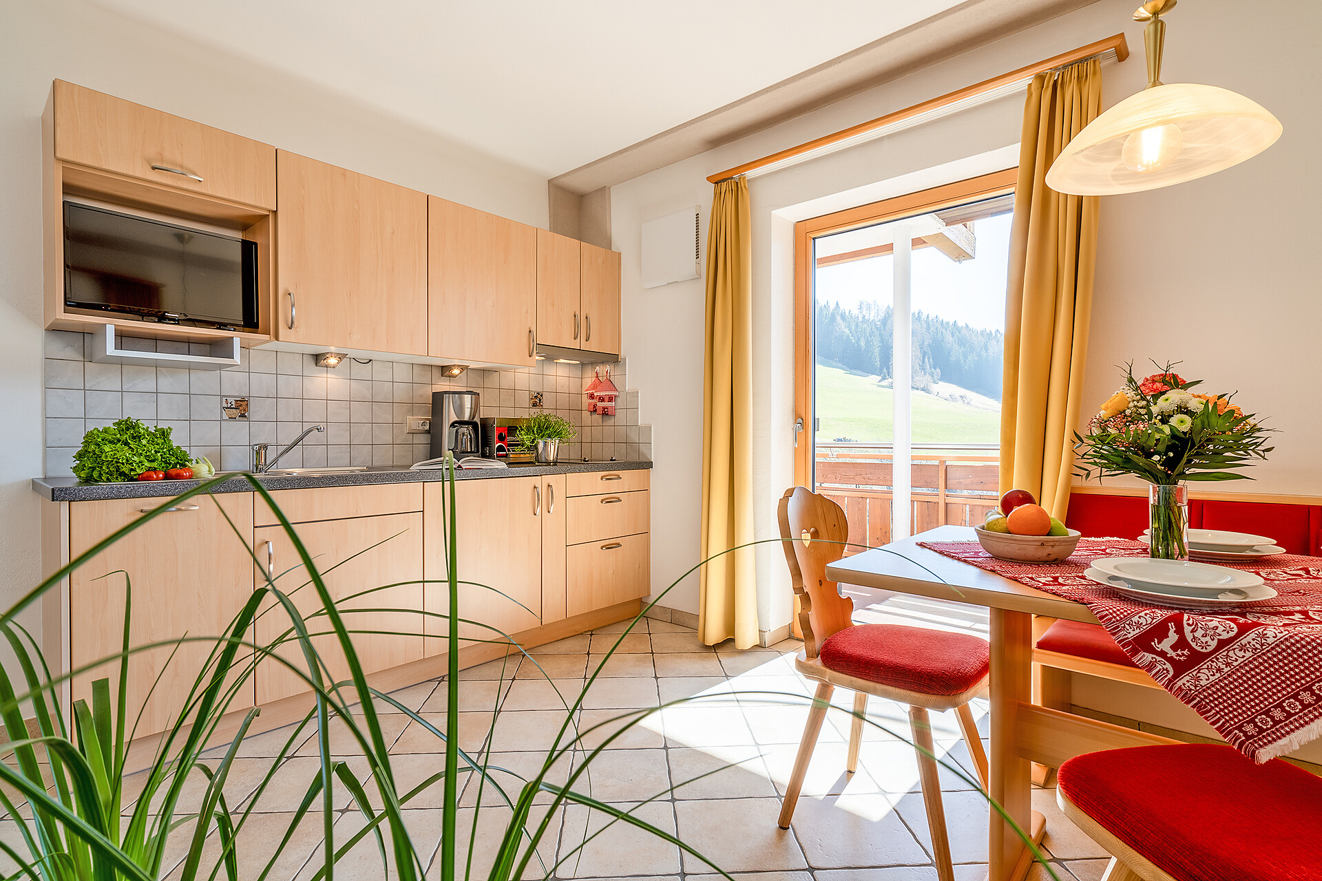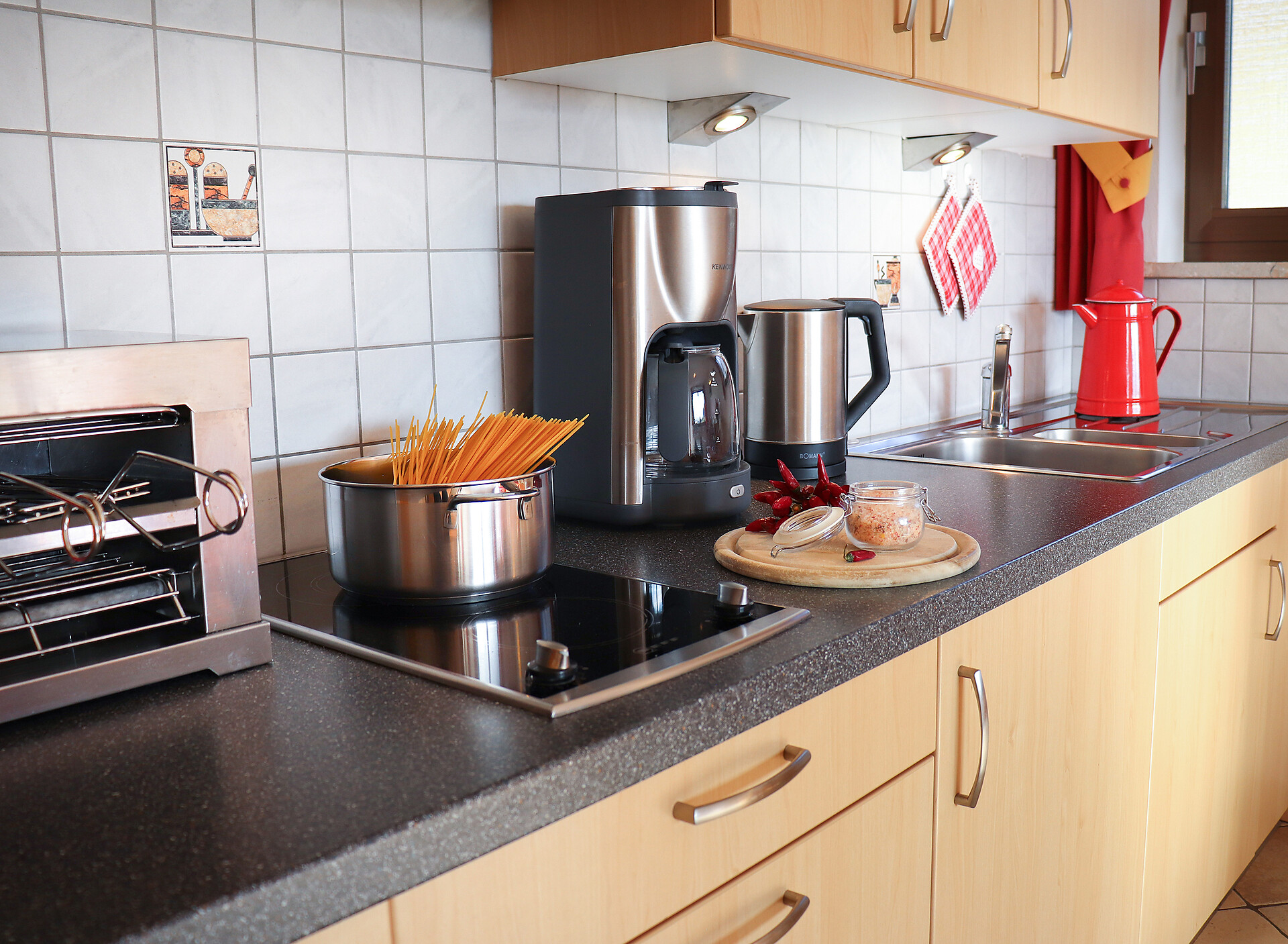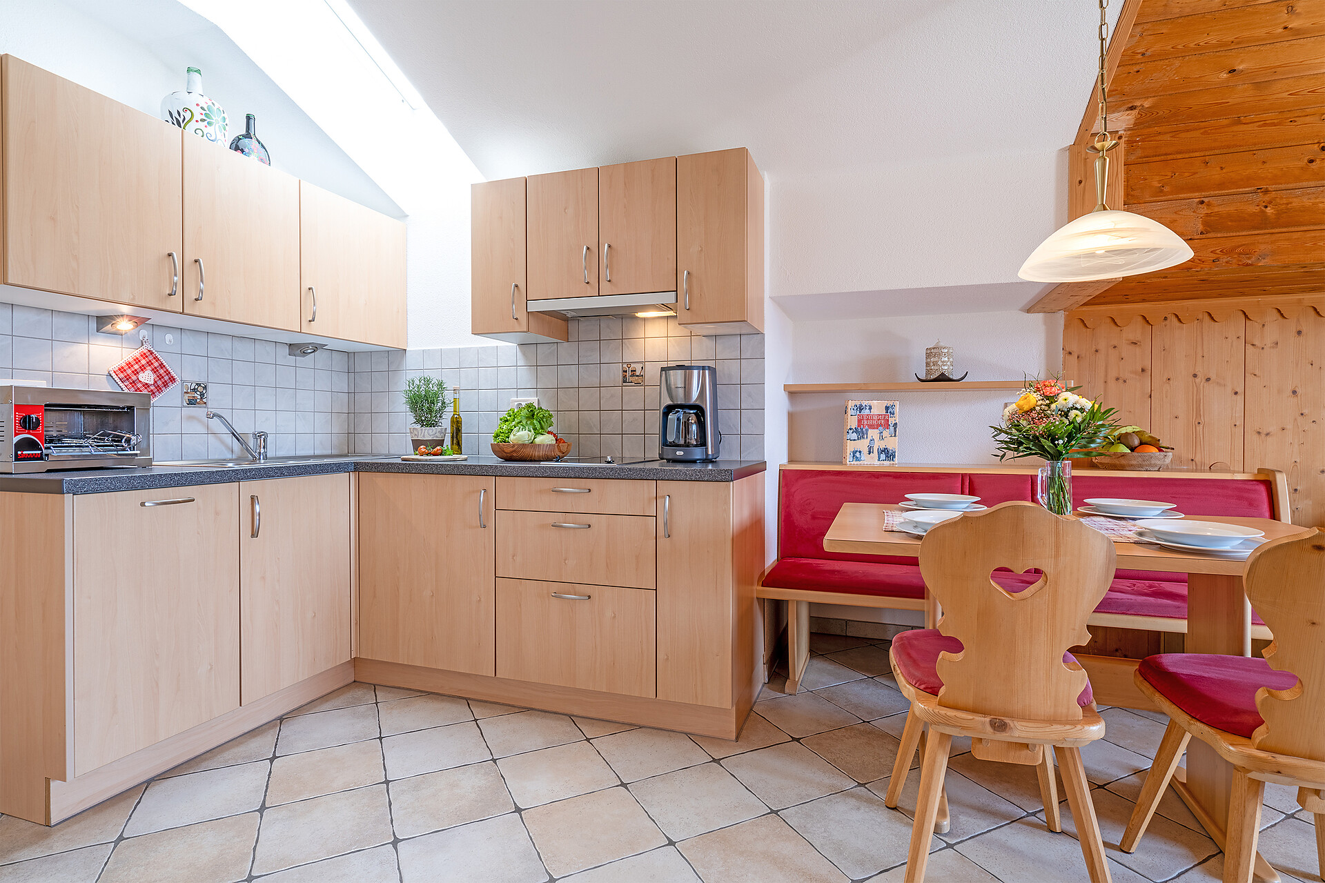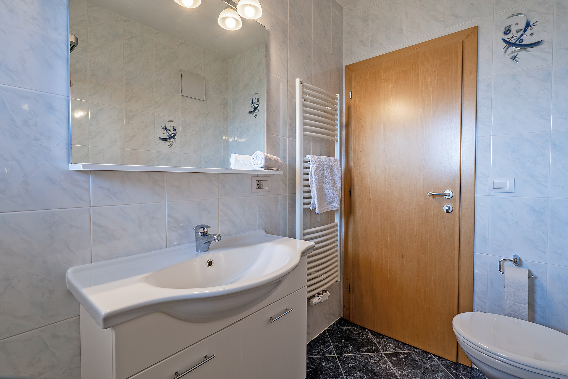 The apartment comes with dishes, towels, bed linen and free Wi-Fi. It features a bedroom with double bed and sofa bed, a living room with an additional sofa bed, wardrobe and satellite TV, as well as a bathroom with shower, toilet, bidet and hairdryer. The living area includes a dining table, sofa and seating area, while the kitchen is fully equipped with fridge, freezer, dishwasher, coffee machine, kettle, toaster and stove. A balcony with mountain views, a garden with playground, a storage room and a boot dryer add to the comfort. Free covered parking and an electric car charging station are also available.