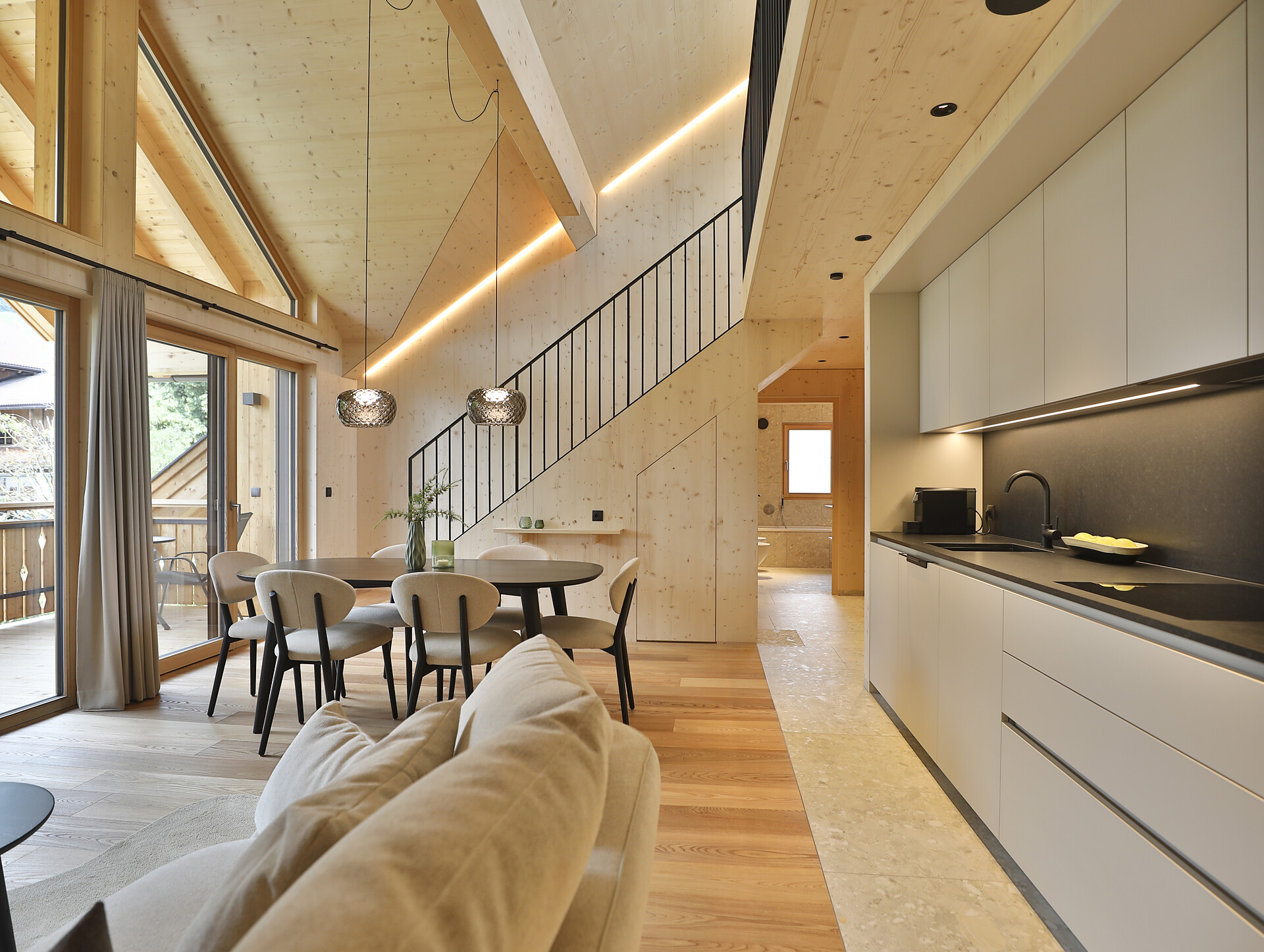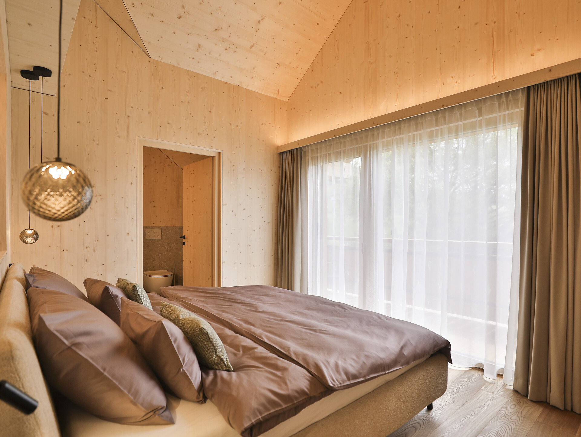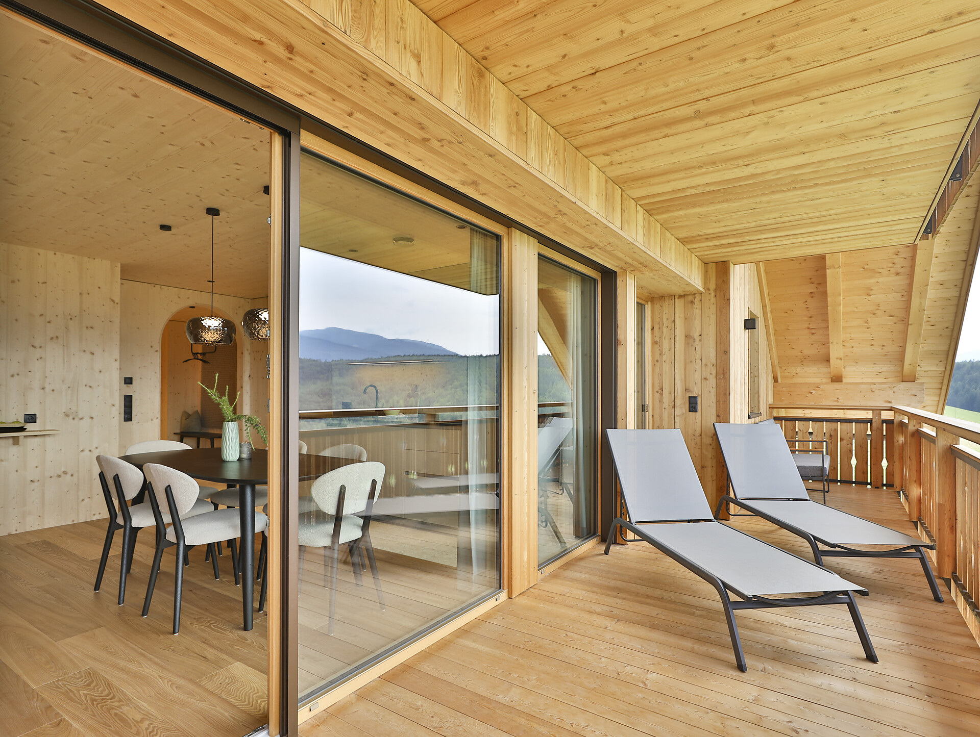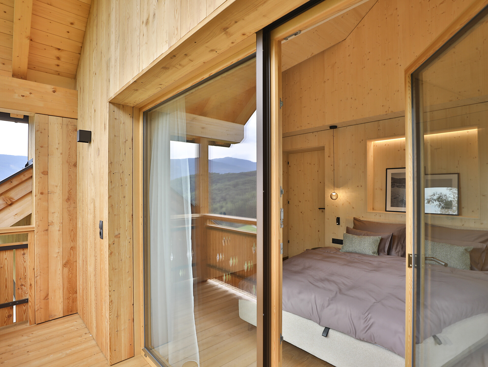 Very cozy wooden chalet, built and furnished with high quality materials. Panoramic windows, fireplace, sauna, sun terrace and green area - these are just some of the great features of the holiday home. 3 double bedrooms, each with its own bathroom, can accommodate a family or 6 adults.