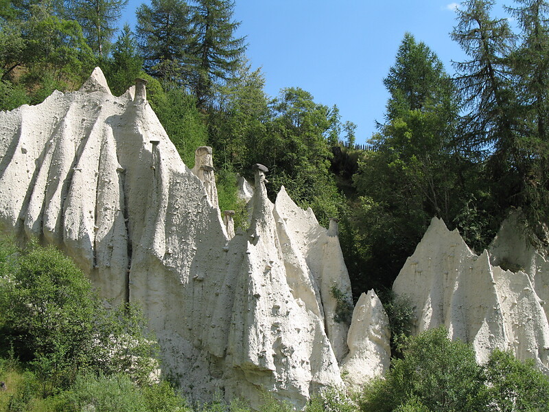 Die Entstehung der Terner Erdpyramiden geht wahrscheinlich auf das Jahr 1837 zurück. Als Folge eines heftigen Unwetters, riß der Terner Bach 3 Wohnhäuser, 16 Mühlen, 13 Stampfen, eine Schmiede und eine Säge mit sich fort. 13 Menschen kamen dabei zu Tode. Damals kam es wahrscheinlich zum Anbruch des Hanges. Die Erosion hat in den darauf folgenden Jahrzehnten auf zwei unterschiedliche Schuttmassen eingewirkt: aus dem Material mit Steinblöcken durchsetzt, formten sich die klassischen Erdpyramiden; aus dem Material, das kaum Steine enthält, bildeten sich nur Grate und Rippen. Startpunkt: Terenten Zentrum