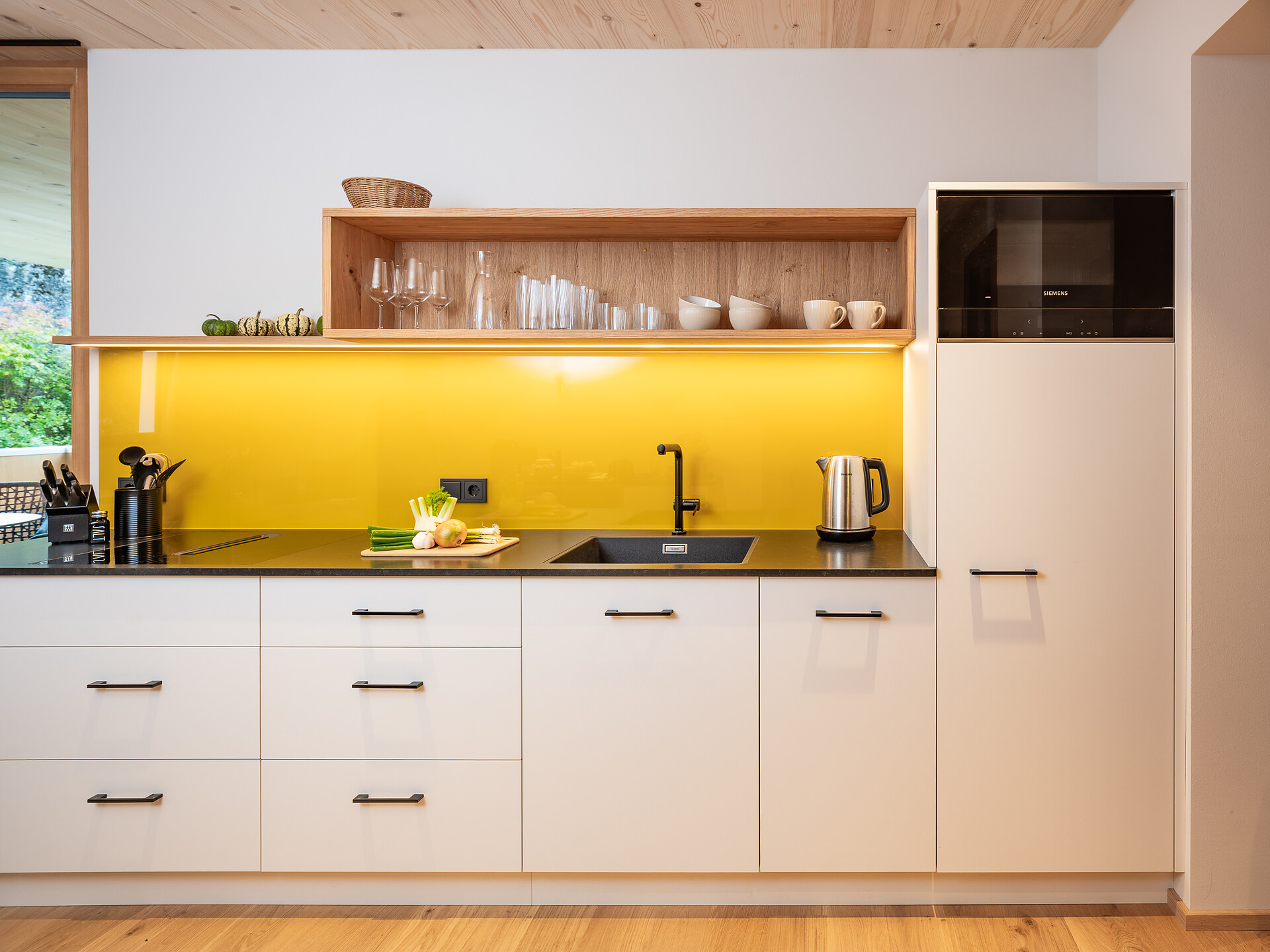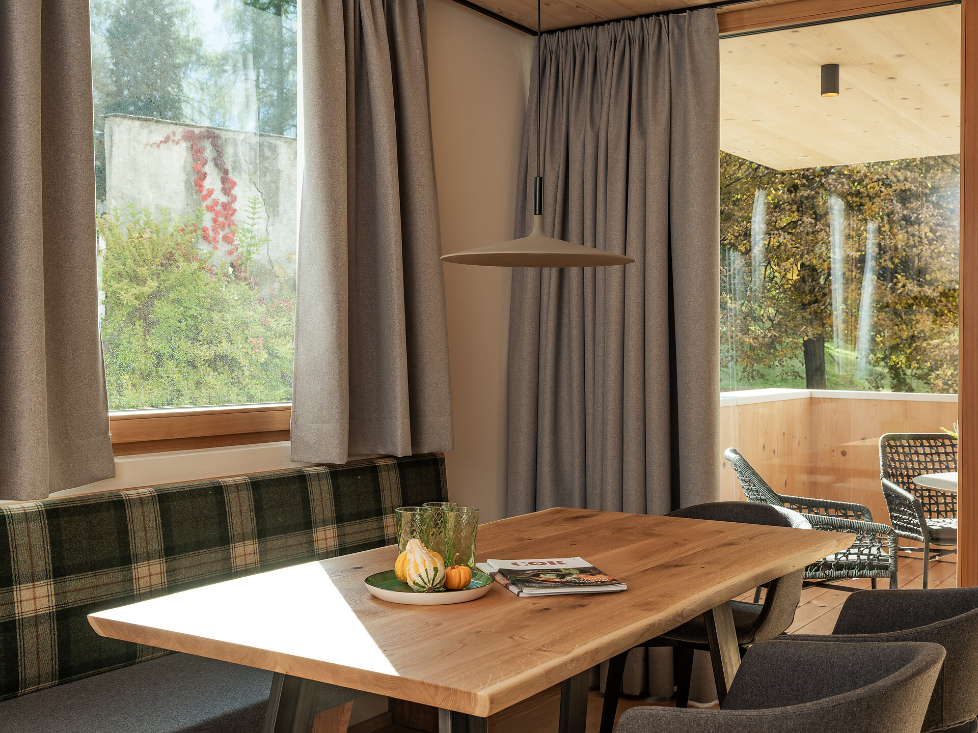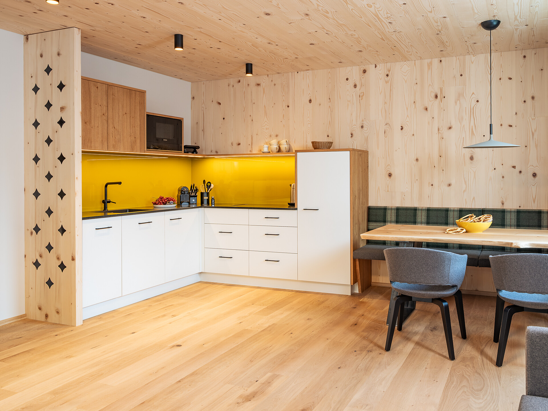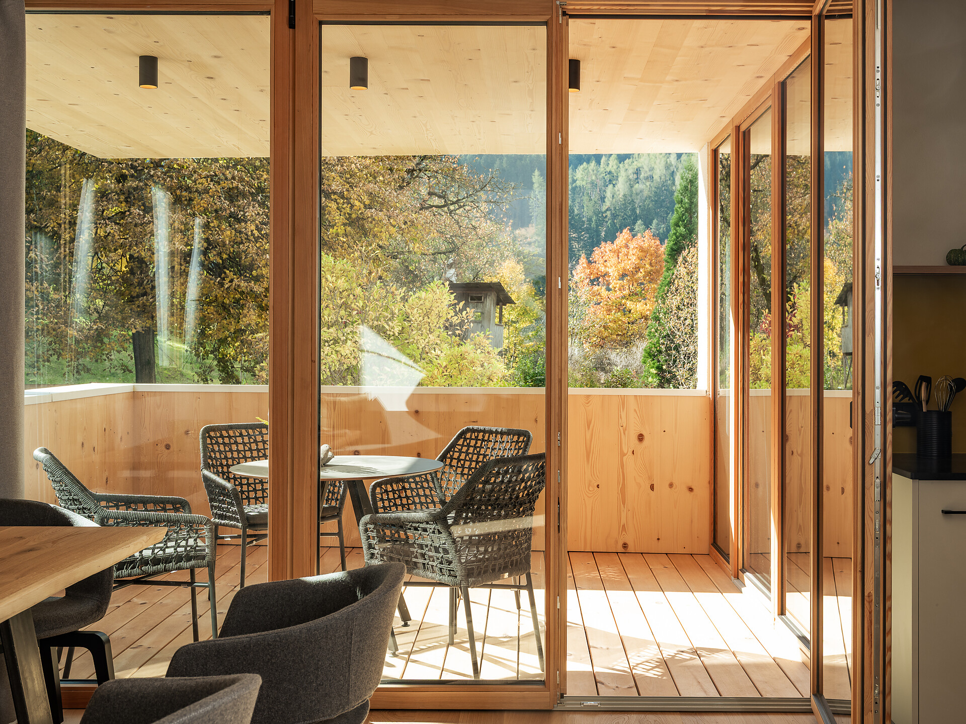 Ausstattung: Doppelbett, Babybett, Bettsofa, Balkon, Terrasse, Separater Wohnraum, Bettwäsche vorhanden, Nichtraucher-Apartment, Wohnküche, Kaffeemaschine, Geschirrspülmaschine, Mikrowelle, Geschirrausstattung, Kochfeld, Dusche/Bad, Separates WC, Haarfön, Badetücher, Ferienwohnung mit Infrarotkabine, TV, WLAN, Endreinigung inbegriffen, Haupthaus, Panoramablick