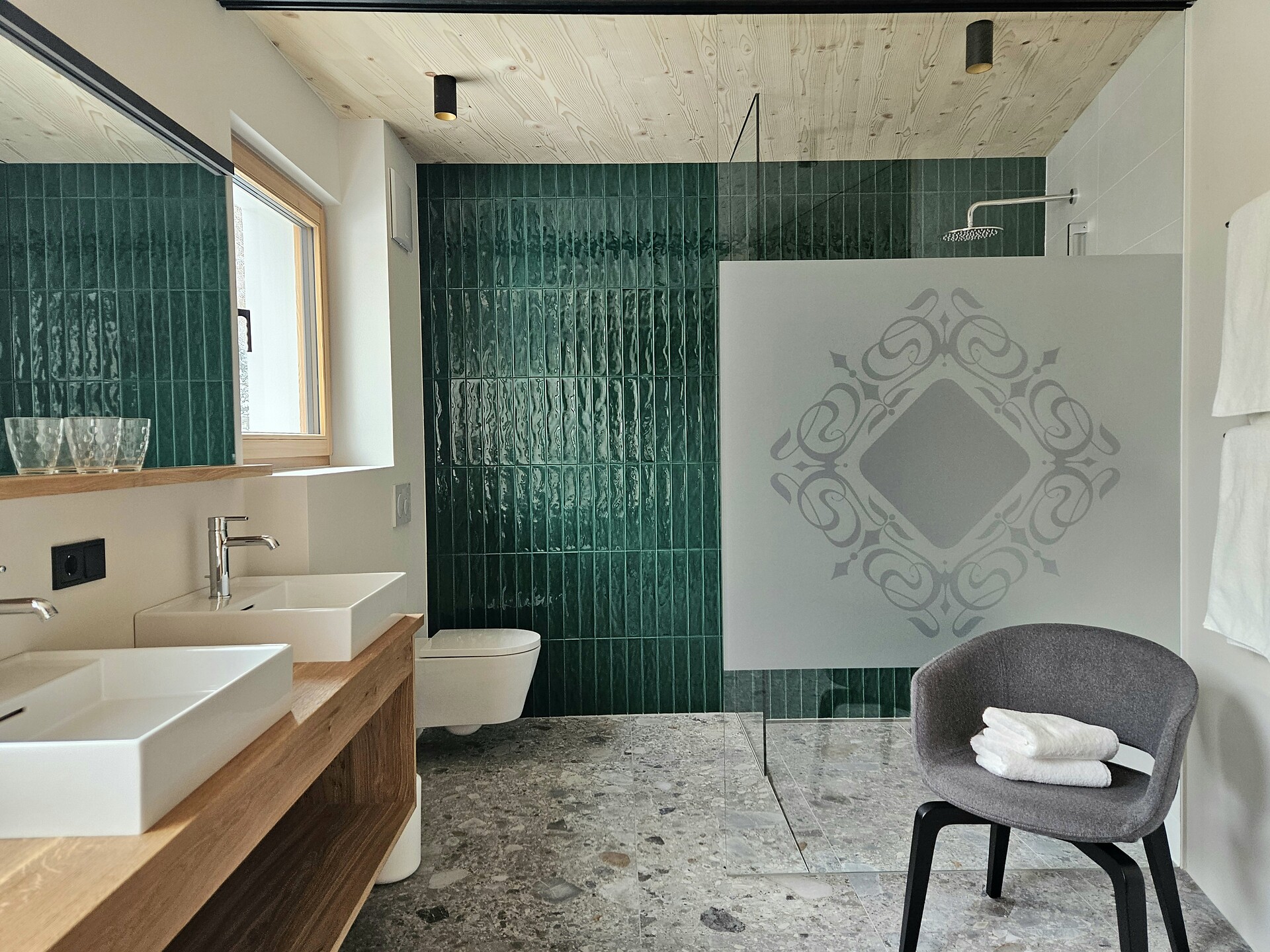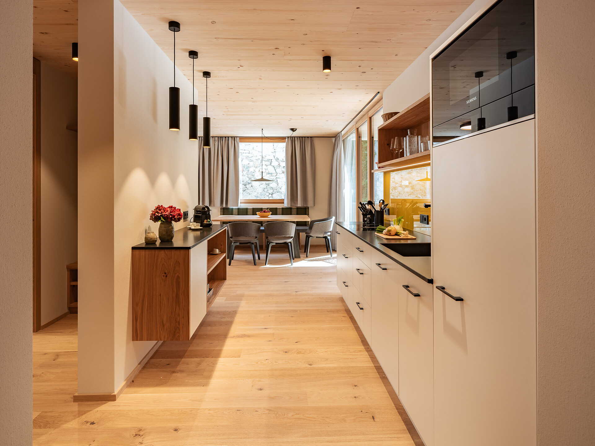 Ausstattung: Doppelbett, Babybett, Bettsofa, Terrasse, Separater Wohnraum, Bettwäsche vorhanden, Nichtraucher-Apartment, 2 oder mehr Schlafzimmer, Wohnküche, Kaffeemaschine, Geschirrspülmaschine, Mikrowelle, Geschirrausstattung, Kochfeld, Dusche/Bad, Separates WC, Bidet, Haarfön, Ferienwohnung mit Infrarotkabine, TV, WLAN, Endreinigung inbegriffen, Haupthaus, Panoramablick, Südseite