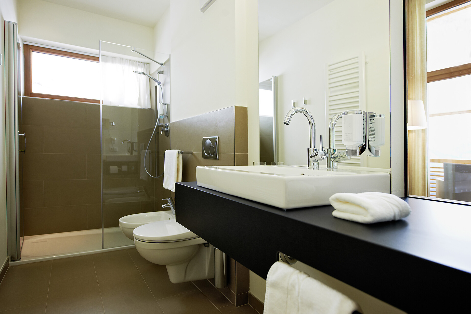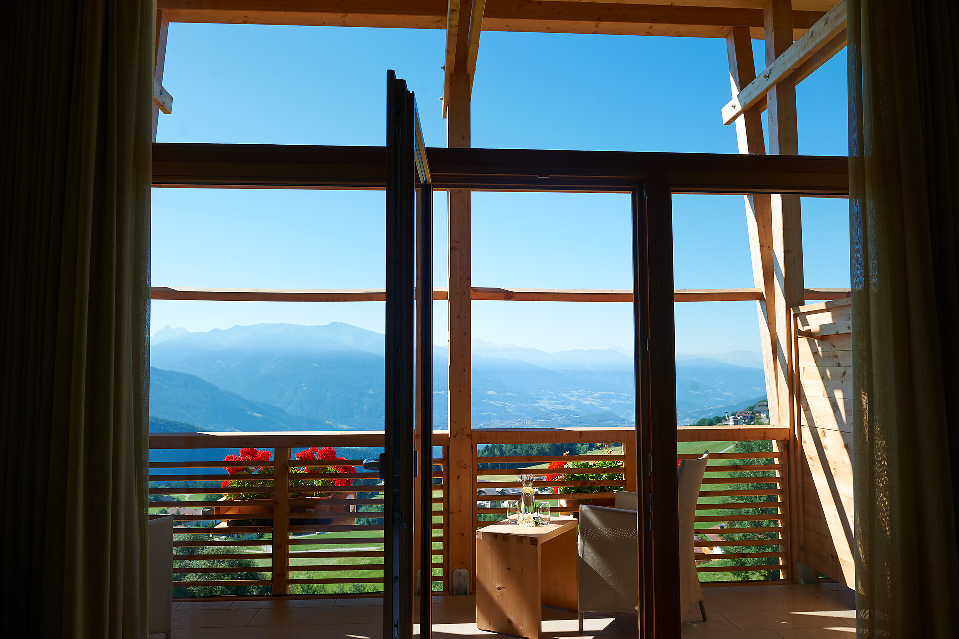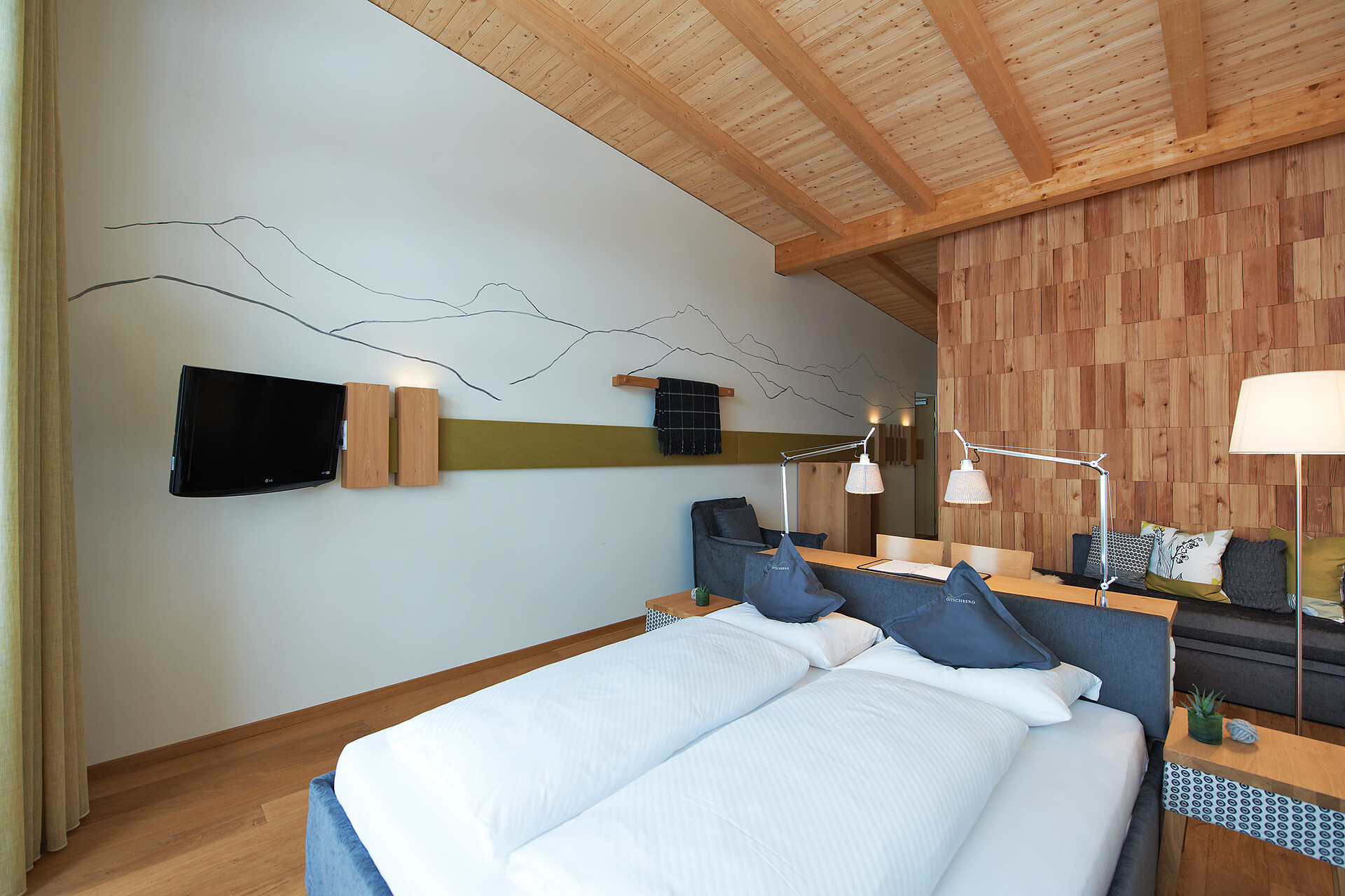 Modernes Design, stilecht und großzügig. Lichtdurchflutetes Zimmer mit Panoramabett, Holzboden, begehbarem Schrank und schönem Wohnbereich. Viel Holz und natürliche Materialien. Großer Südbalkon und freier Blick auf die Dolomiten. Bad mit Tageslicht, großzügiger Dusche, WC und Bidet.
