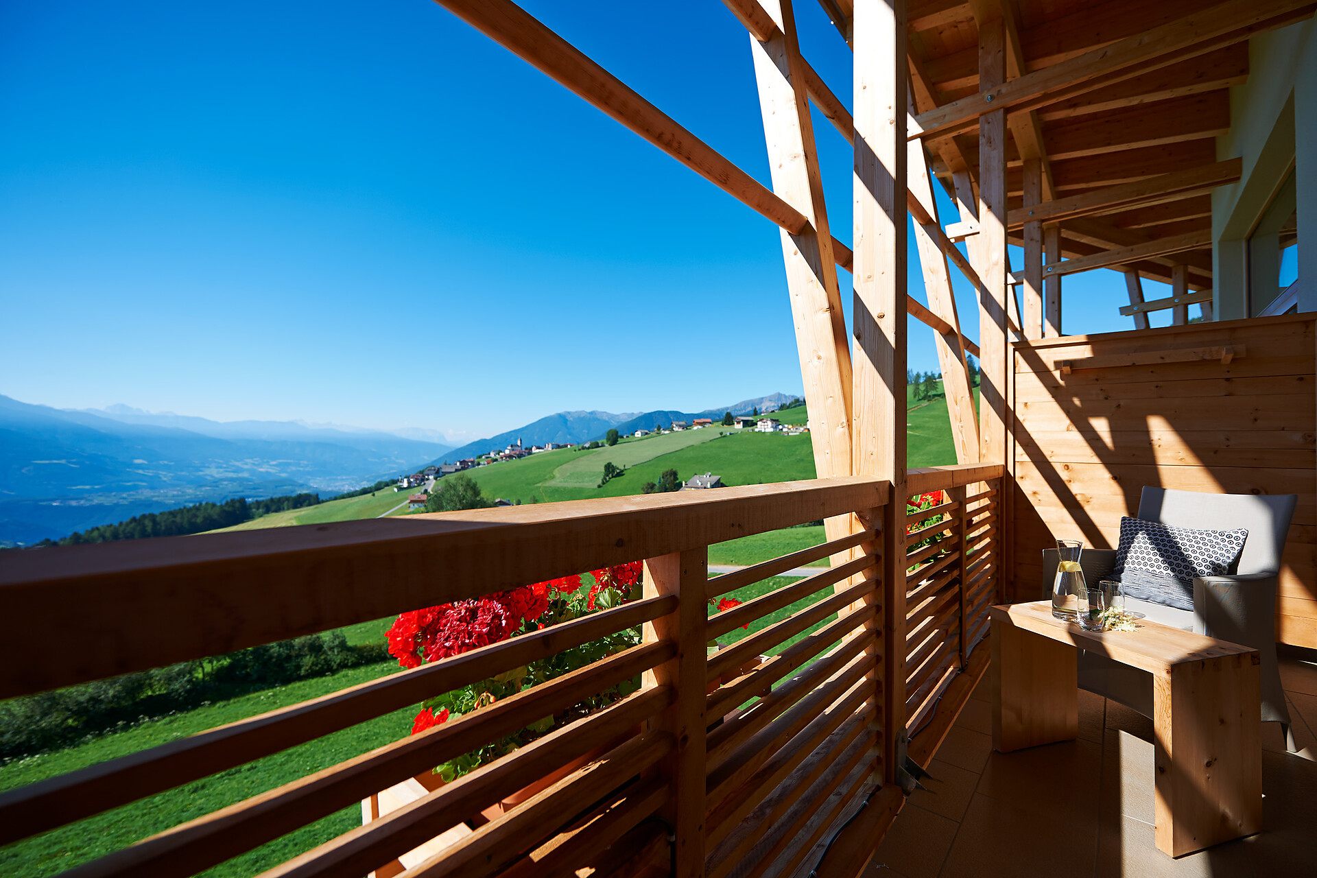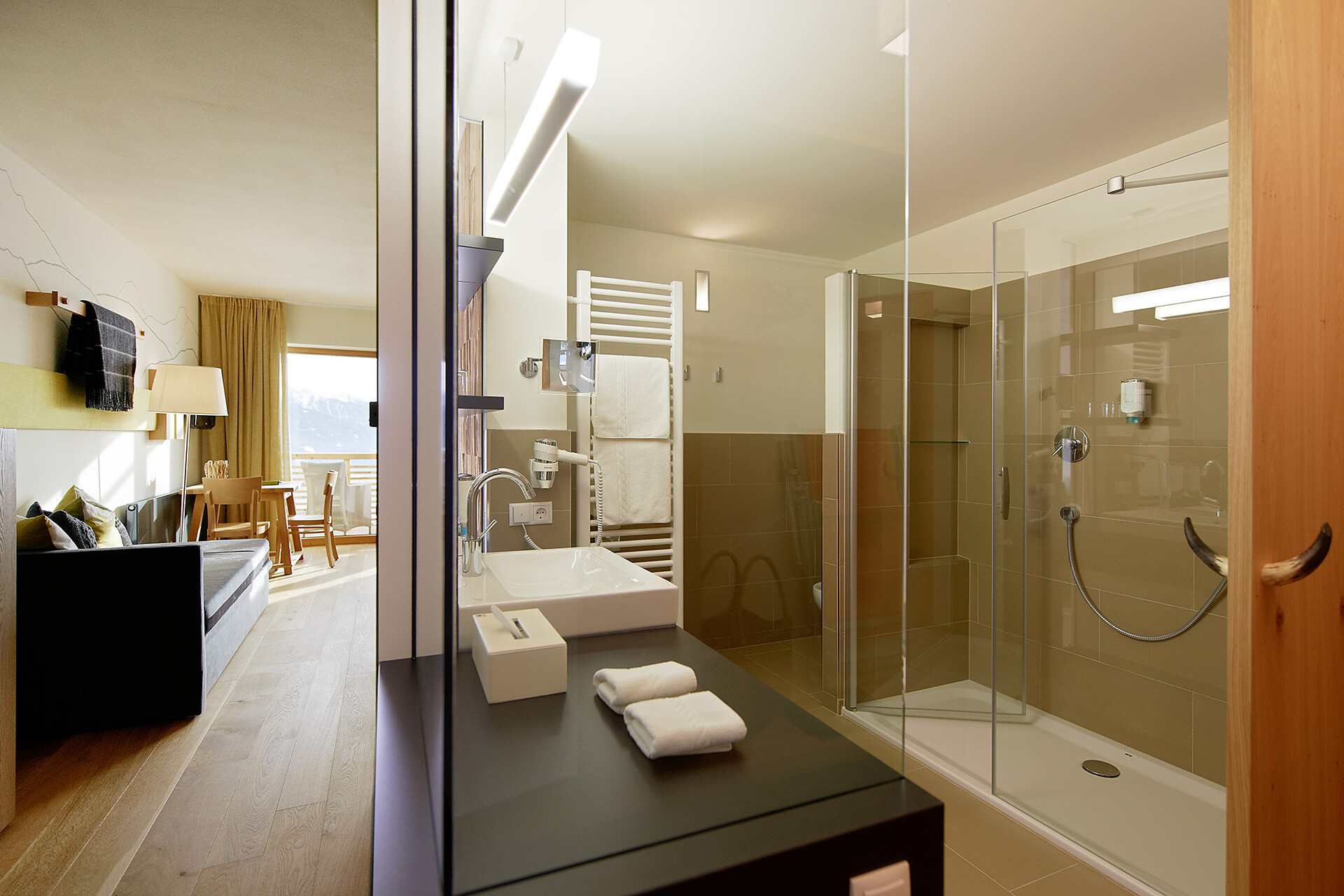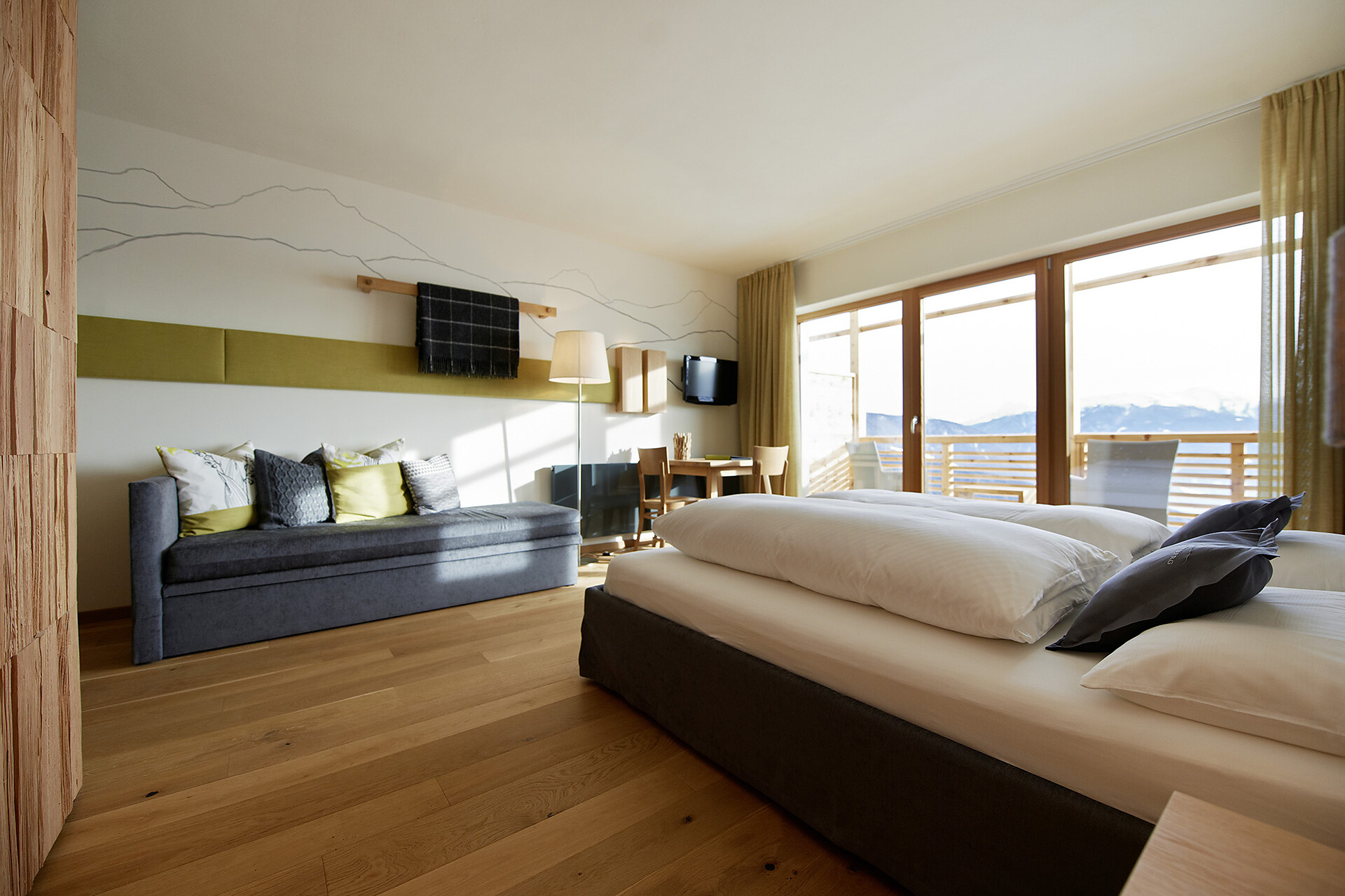 Wohlgefühl der modernen Art. Stilvolles Einzelzimmer mit französischem Bett (140x220), begehbarem Schrank und kleinem Wohnbereich. Mit Holzboden und natürlichen Materialien. Ostbalkon mit Panoramablick zu den Pustertaler Dolomiten. Bad mit großzügiger Dusche, WC und Bidet.