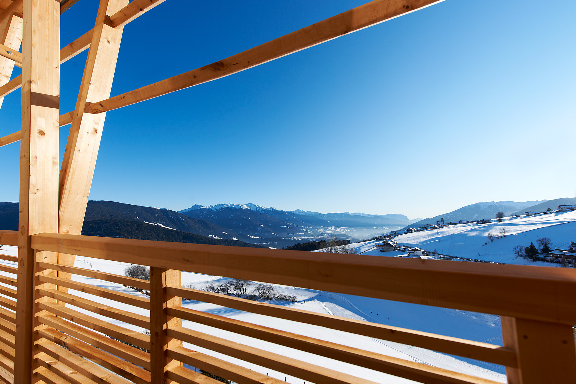 Traumhafte Weitsicht und moderne Bergarchitektur. Sonniges Schlafzimmer mit Panorama-Bett, Holzboden, begehbarem Schrank und herrlichem Wohnbereich. Viel Holz und natürliche Materialien. Großer Südbalkon und freier Blick auf die Dolomiten. Bad mit großzügiger Dusche, WC und Bidet.