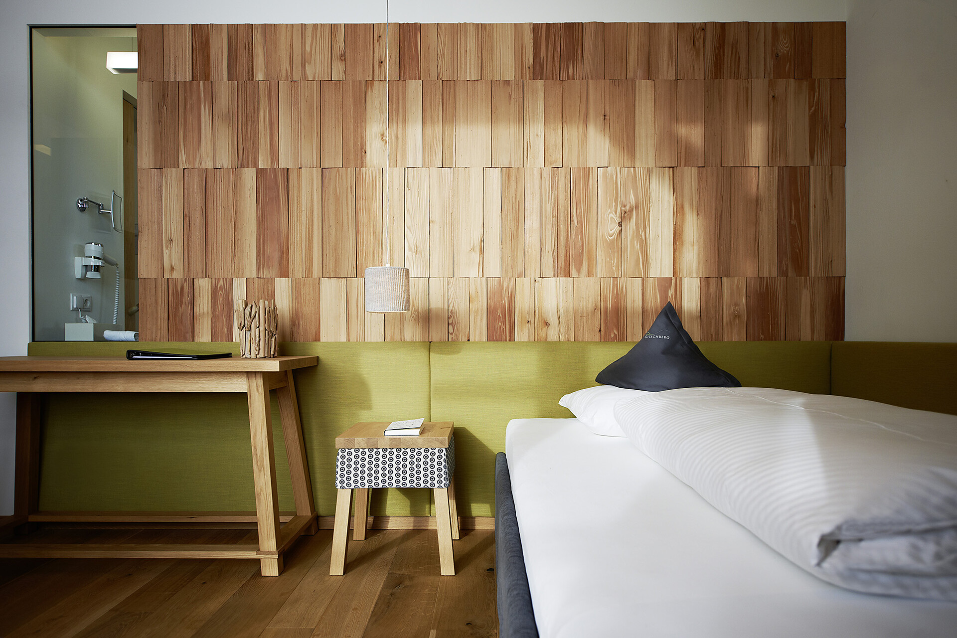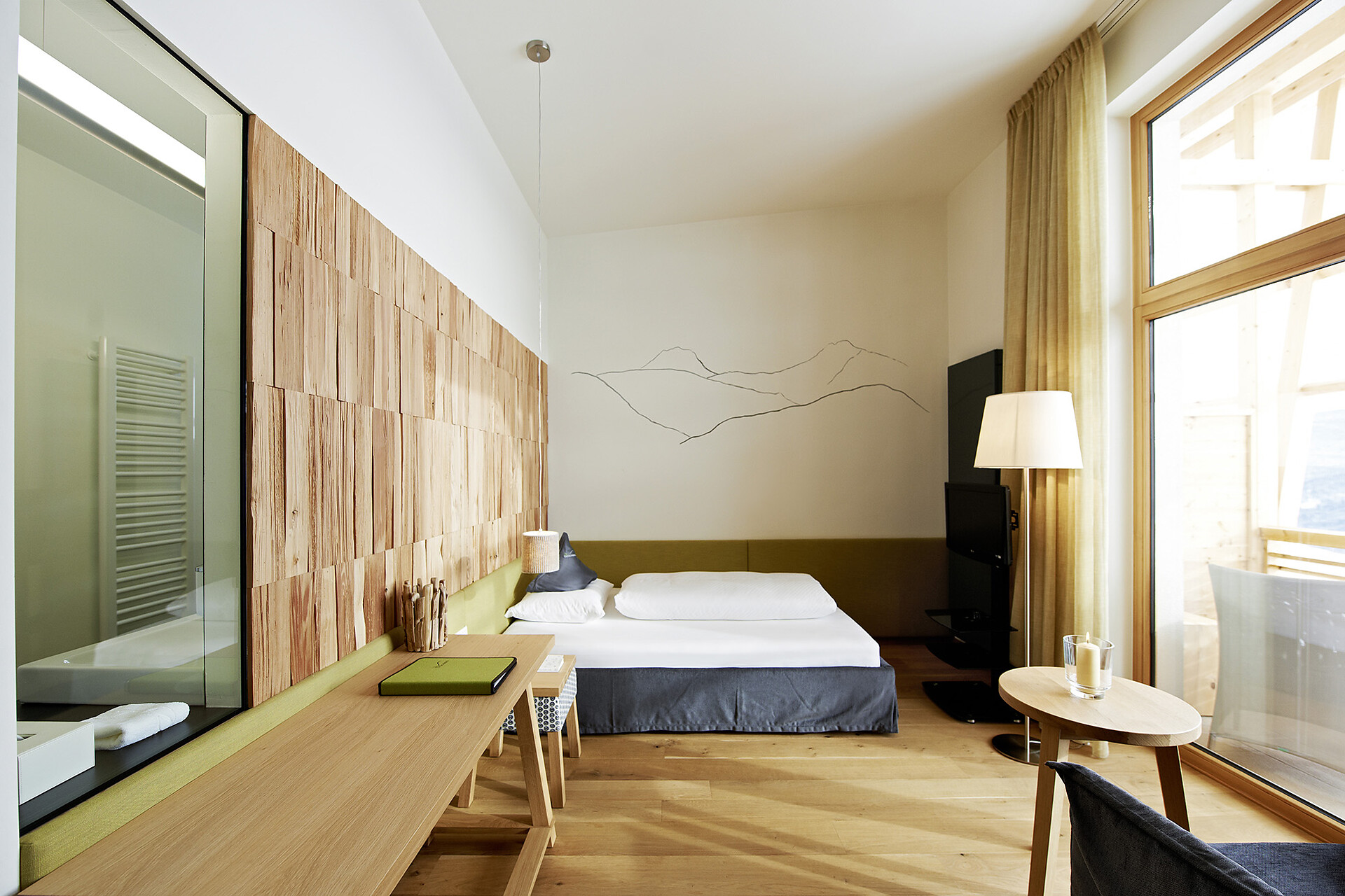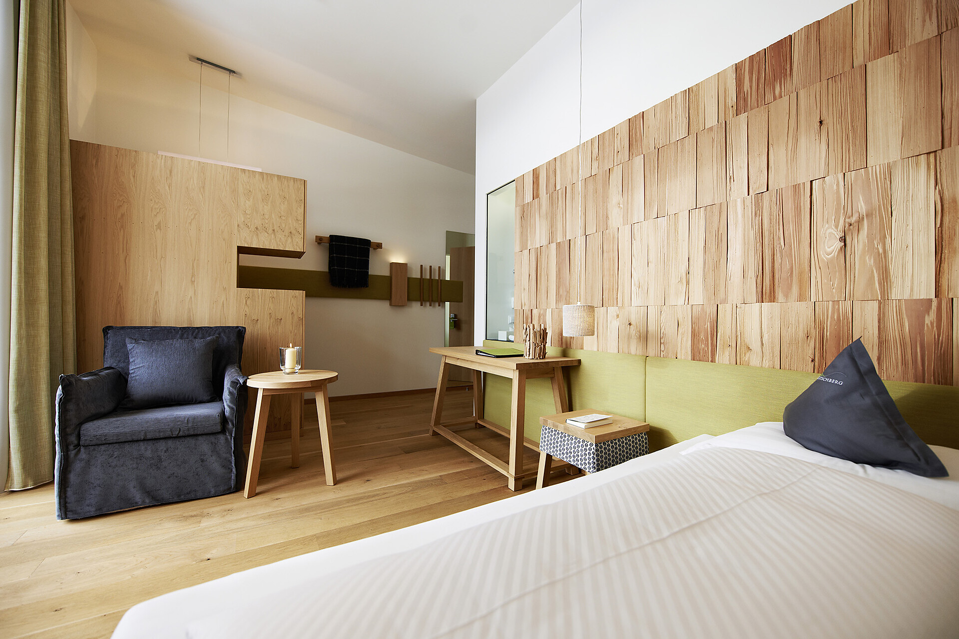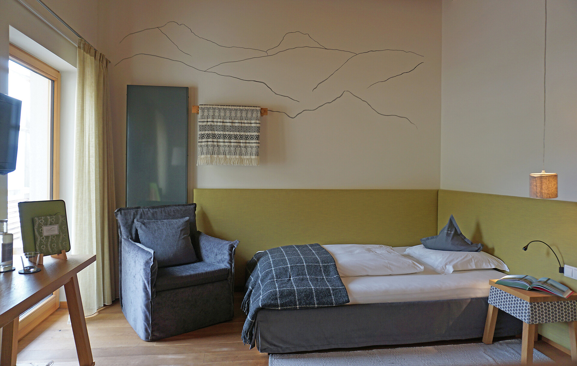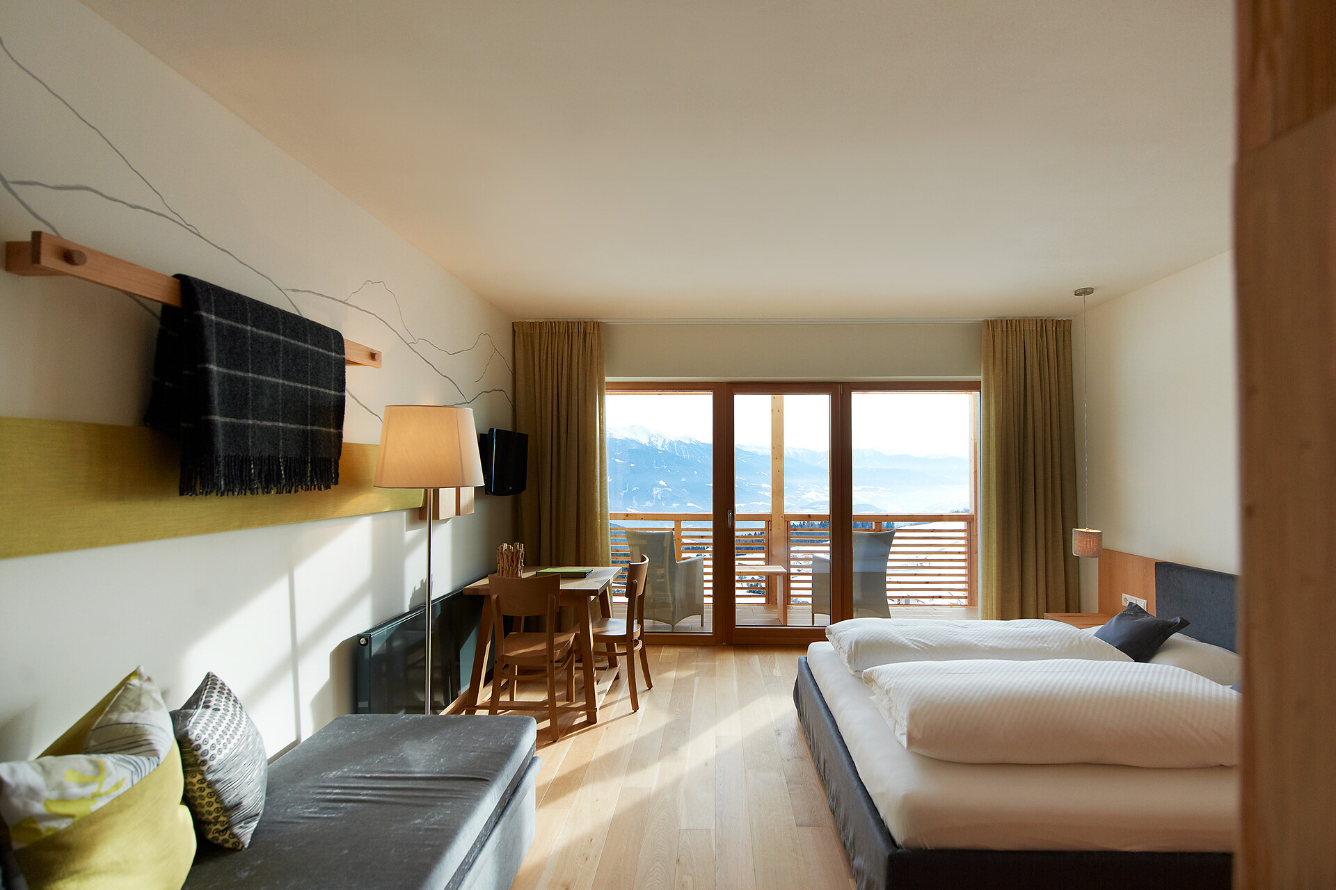 Natur und Design stilecht vereint. Lichtdurchflutetes Einzelzimmer mit französischem Bett (140x220), begehbarem Schrank und kleinem Wohnbereich. Mit Holzboden und natürlichen Materialien. Südbalkon mit Panoramablick auf die Dolomiten. Bad mit großzügiger Dusche, WC und Bidet.