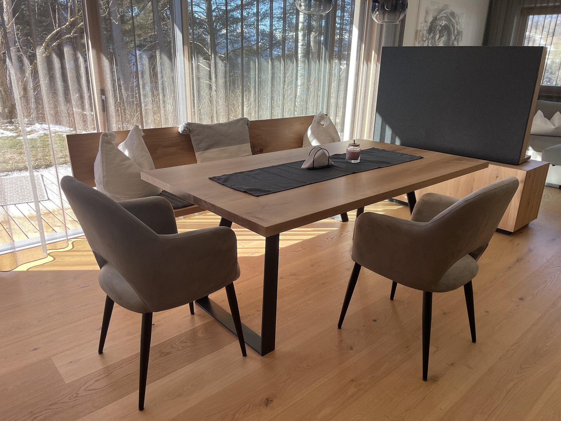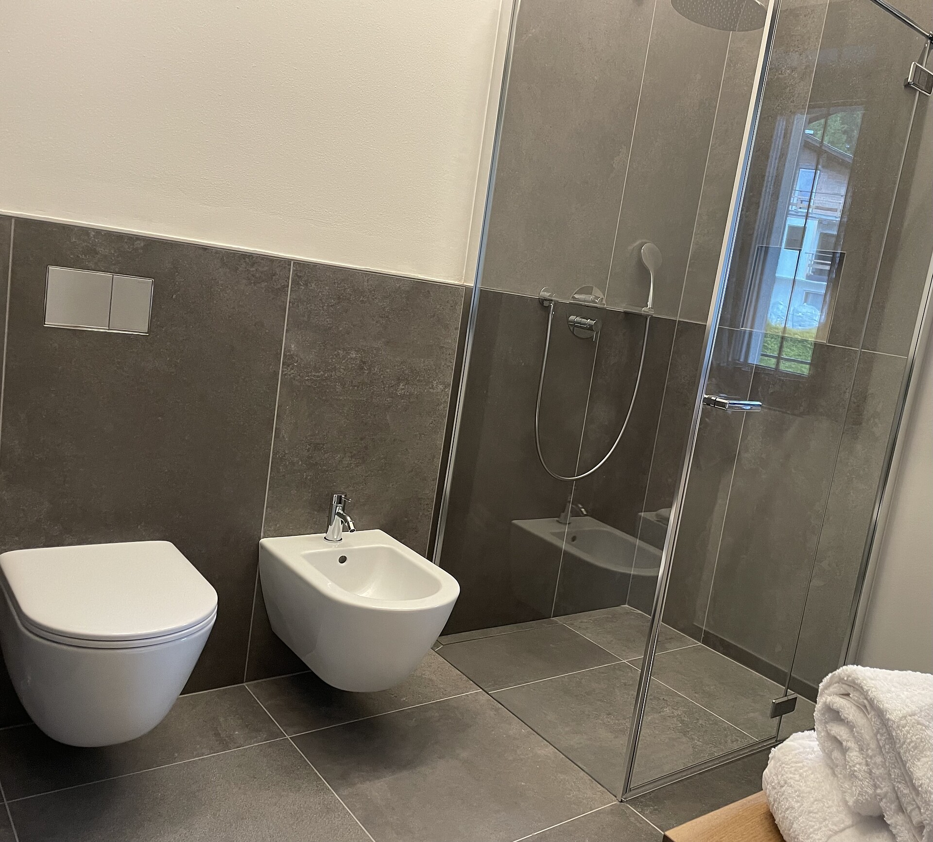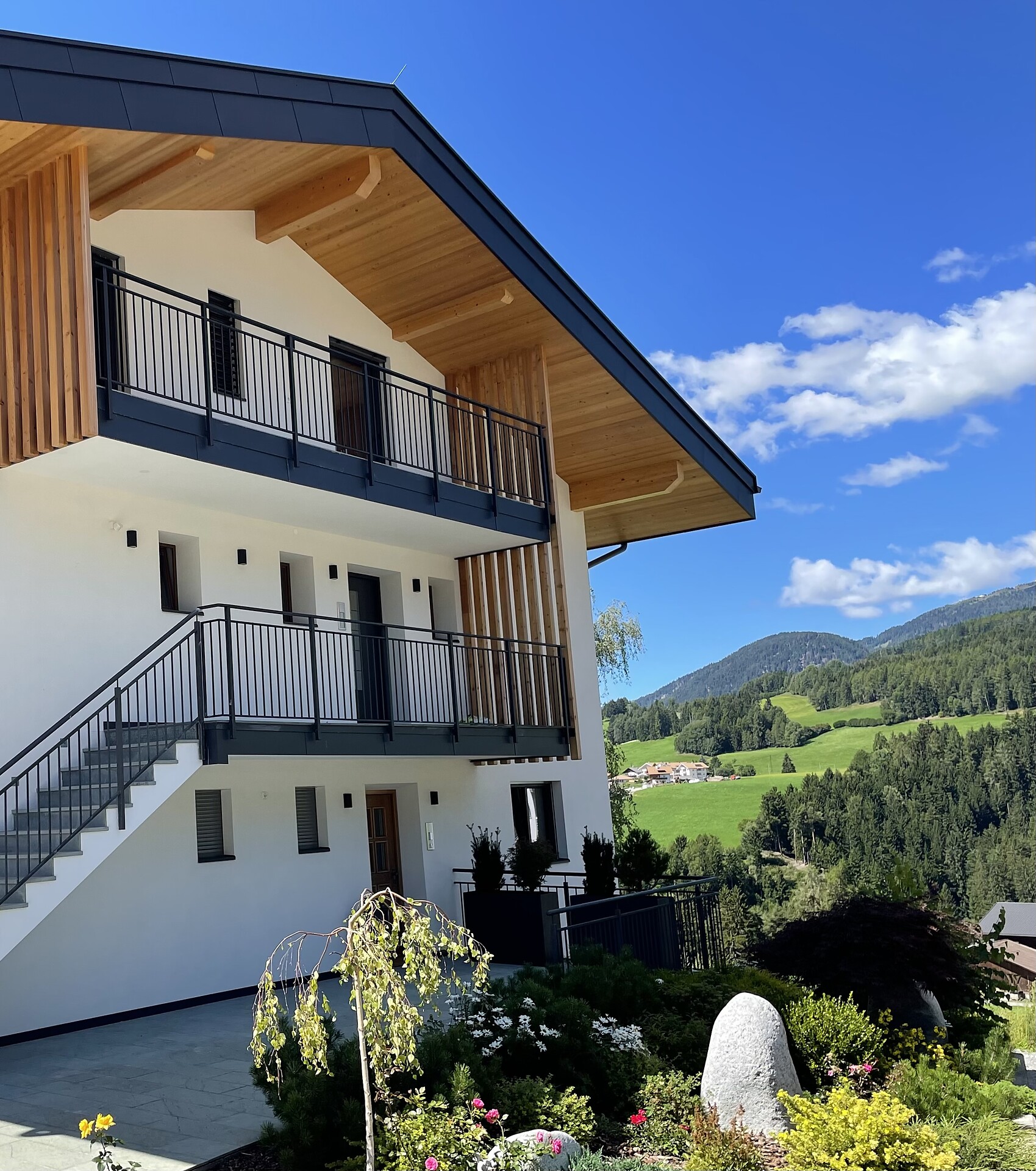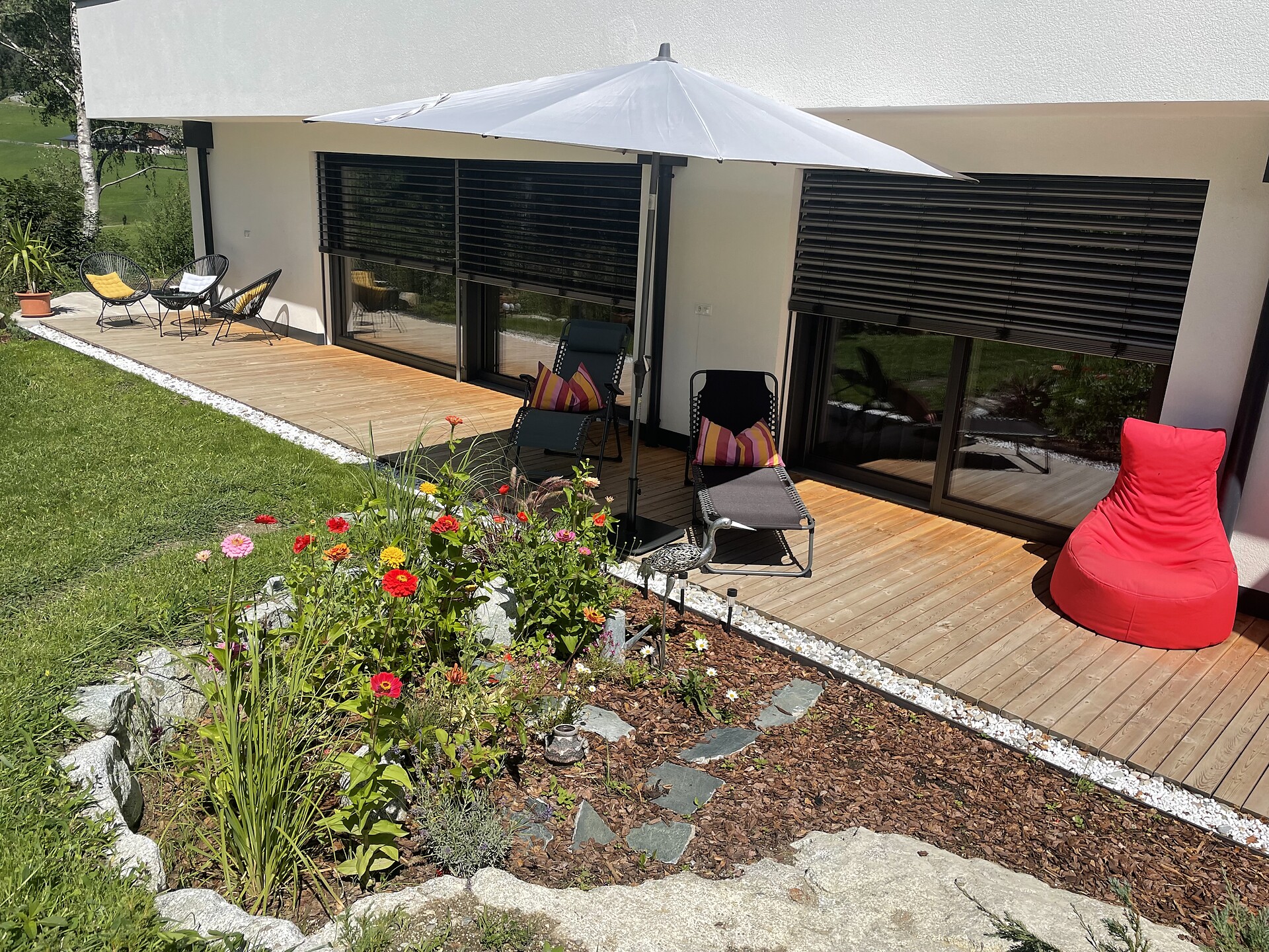 🌿 Große private Terrasse: genießen Sie Sonne, Natur und den Blick in die Berge.
