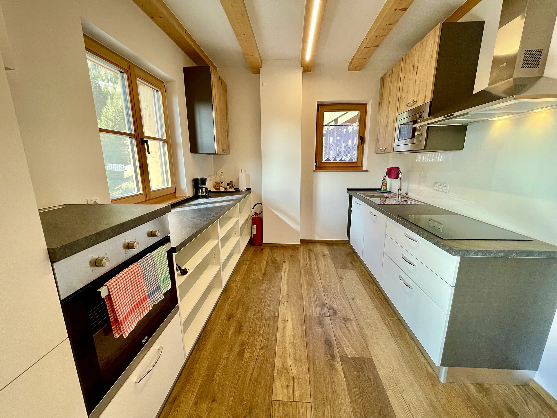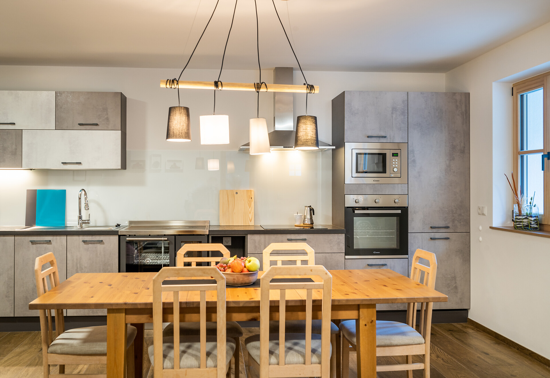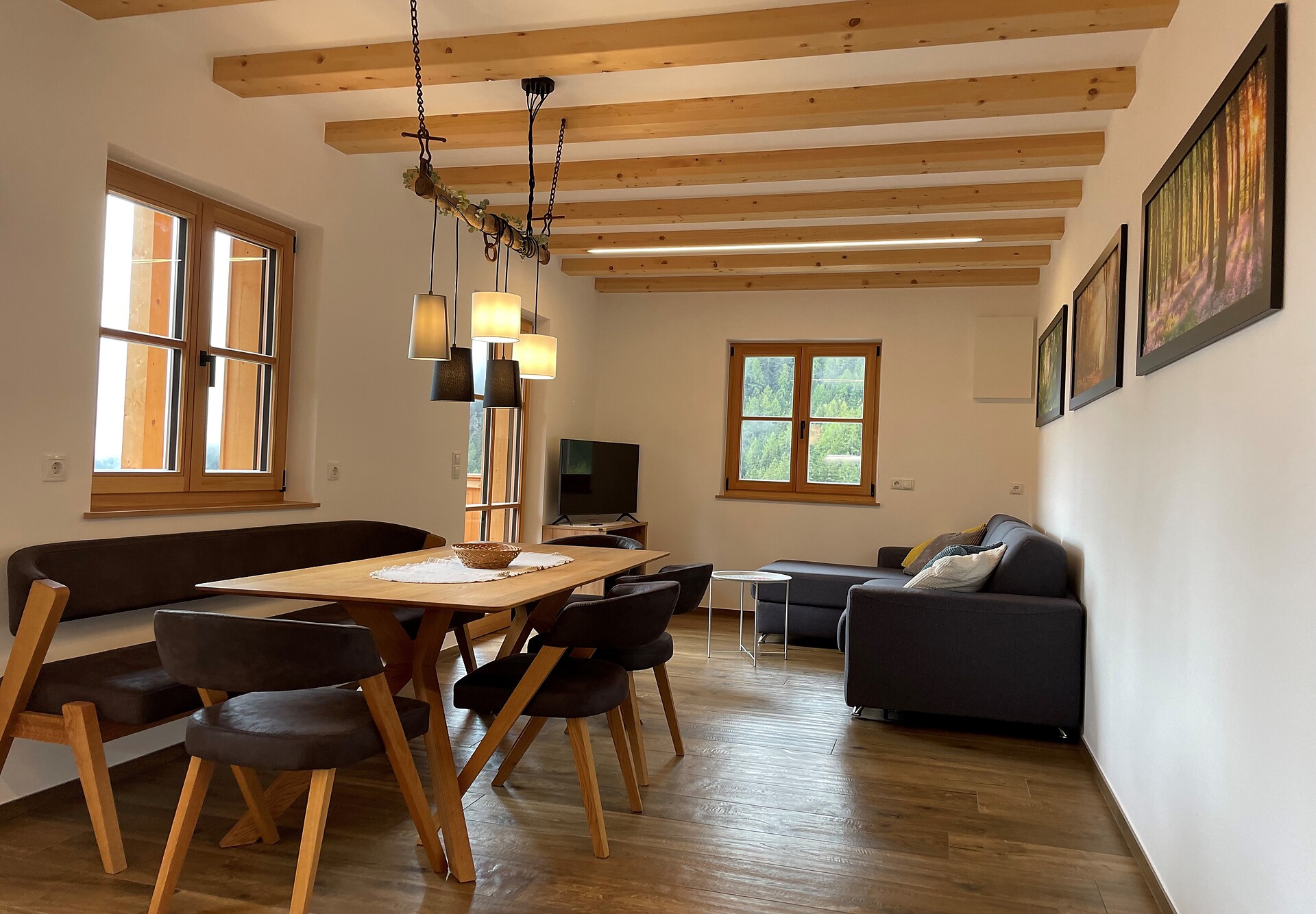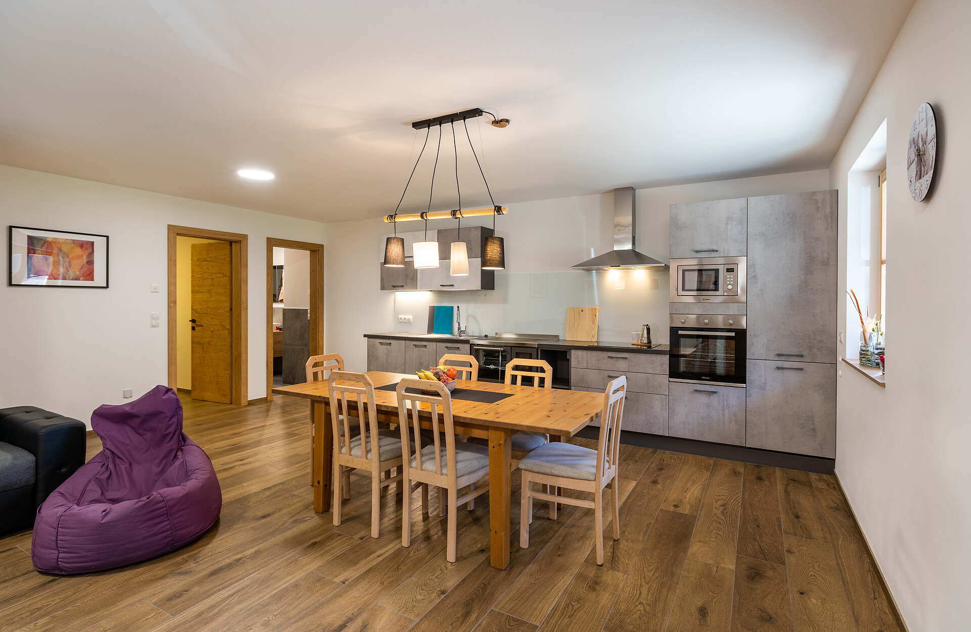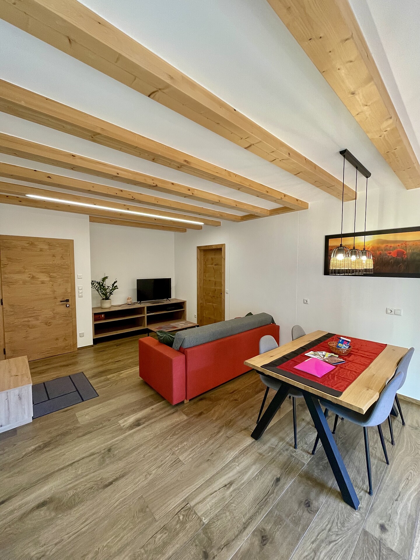 Die Ferienwohnung PANORAMA (73 m², Obergeschoss) für 4–6 Personen bietet modernen Komfort und Zugang zur Außensauna mit Panoramablick. Der große, sonnige Balkon lädt zum Entspannen mit freier Sicht auf die Bergwelt ein. Die helle Wohnküche ist ausgestattet mit Geschirrspüler, Induktionsherd, Backrohr, Espressomaschine, Kühlschrank mit Gefrierfach, Mikrowelle und allen notwendigen Utensilien. Ein 43″ Smart TV mit High-Speed-Internet, kompatibel mit allen Streaming-Diensten, kostenloses WLAN sowie verschiedene Bücher sind vorhanden. Das Bad verfügt über Fenster, große Dusche, WC, Bidet, Badheizkörper und viel Ablage. Alle Räume besitzen Fußbodenheizung und Wohnraumlüftung. Schlafmöglichkeiten: Doppelzimmer, Zimmer mit zwei Stockbetten sowie Schlafsofa mit komfortabler Matratze. Fenster mit elektrischen Rollläden und Insektenschutz. Waschmaschine vorhanden. Parkplätze am Haus, Garage auf Anfrage; Skischuhtrockner für alle Gäste. Endreinigung inkl. (ausgenommen Küchenzeile), Kaution 150 €.