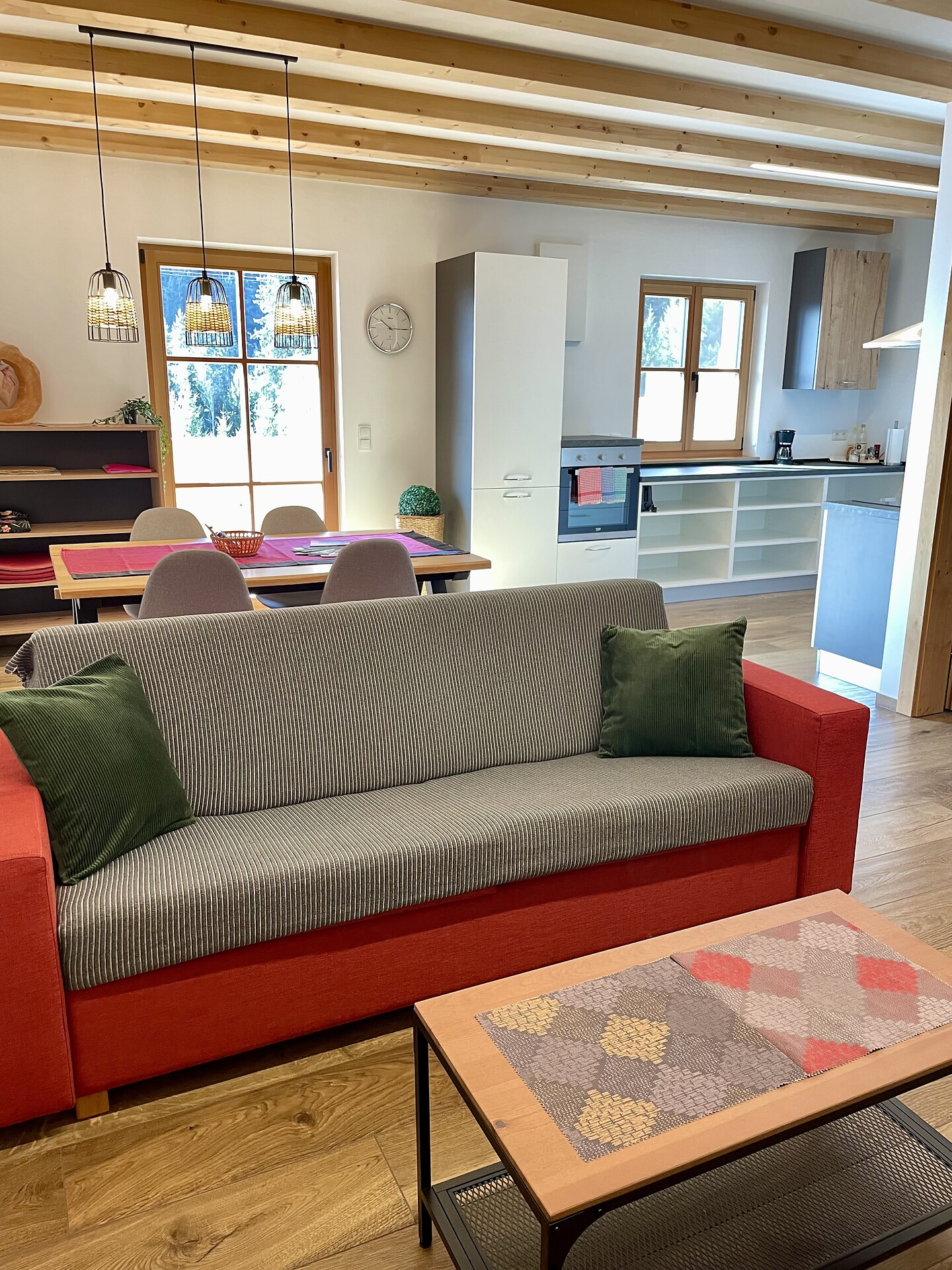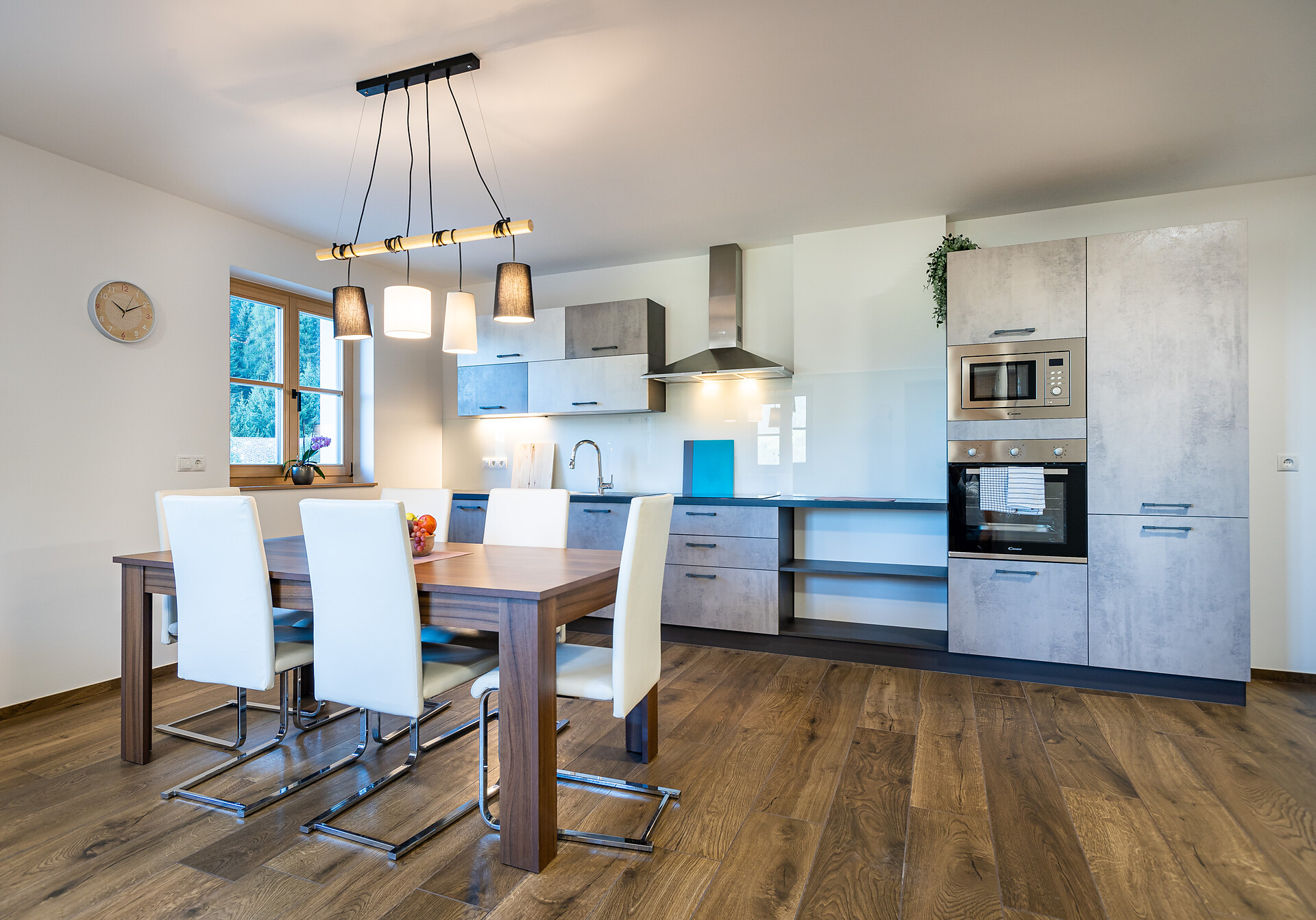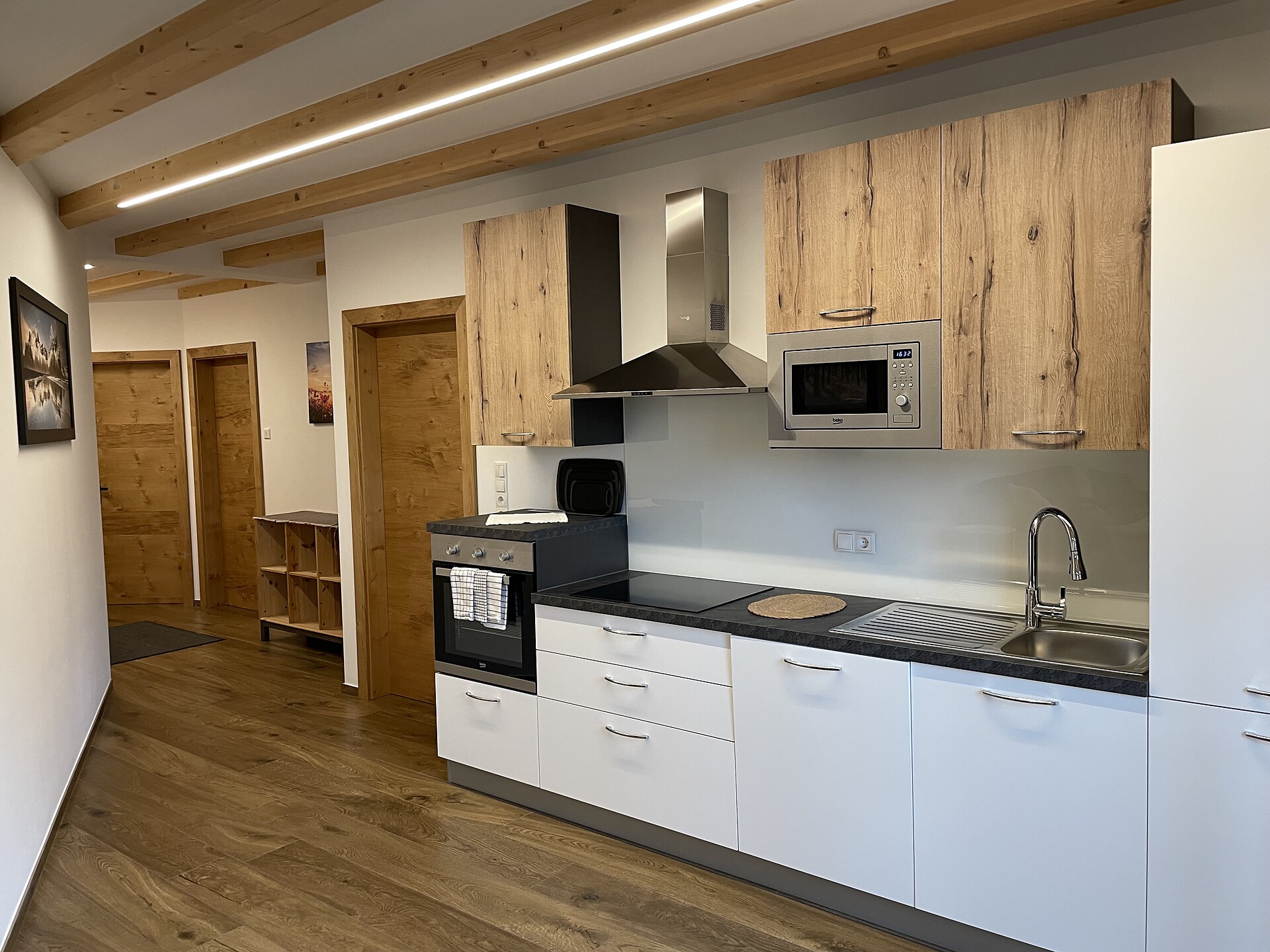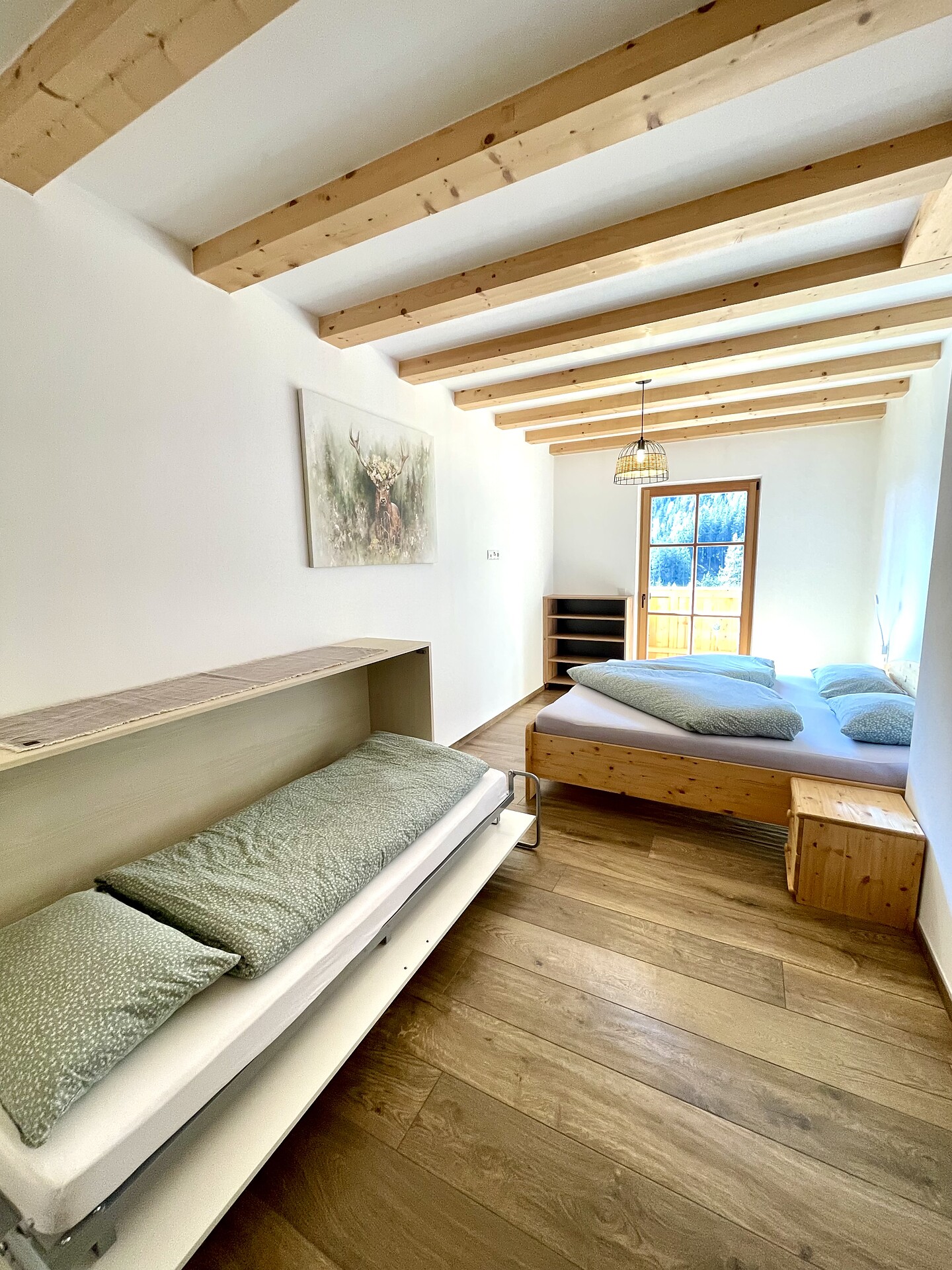 Die Ferienwohnung PANORAMA (73 m², Obergeschoss) für 4–6 Personen bietet modernen Komfort und Zugang zur Außensauna mit Panoramablick. Der große, sonnige Balkon lädt zum Entspannen mit freier Sicht auf die Bergwelt ein. Die helle Wohnküche ist ausgestattet mit Geschirrspüler, Induktionsherd, Backrohr, Espressomaschine, Kühlschrank mit Gefrierfach, Mikrowelle und allen notwendigen Utensilien. Ein 43″ Smart TV mit High-Speed-Internet, kompatibel mit allen Streaming-Diensten, kostenloses WLAN sowie verschiedene Bücher sind vorhanden. Das Bad verfügt über Fenster, große Dusche, WC, Bidet, Badheizkörper und viel Ablage. Alle Räume besitzen Fußbodenheizung und Wohnraumlüftung. Schlafmöglichkeiten: Doppelzimmer, Zimmer mit zwei Stockbetten sowie Schlafsofa mit komfortabler Matratze. Fenster mit elektrischen Rollläden und Insektenschutz. Waschmaschine vorhanden. Parkplätze am Haus, Garage auf Anfrage; Skischuhtrockner für alle Gäste. Endreinigung inkl. (ausgenommen Küchenzeile), Kaution 150 €.