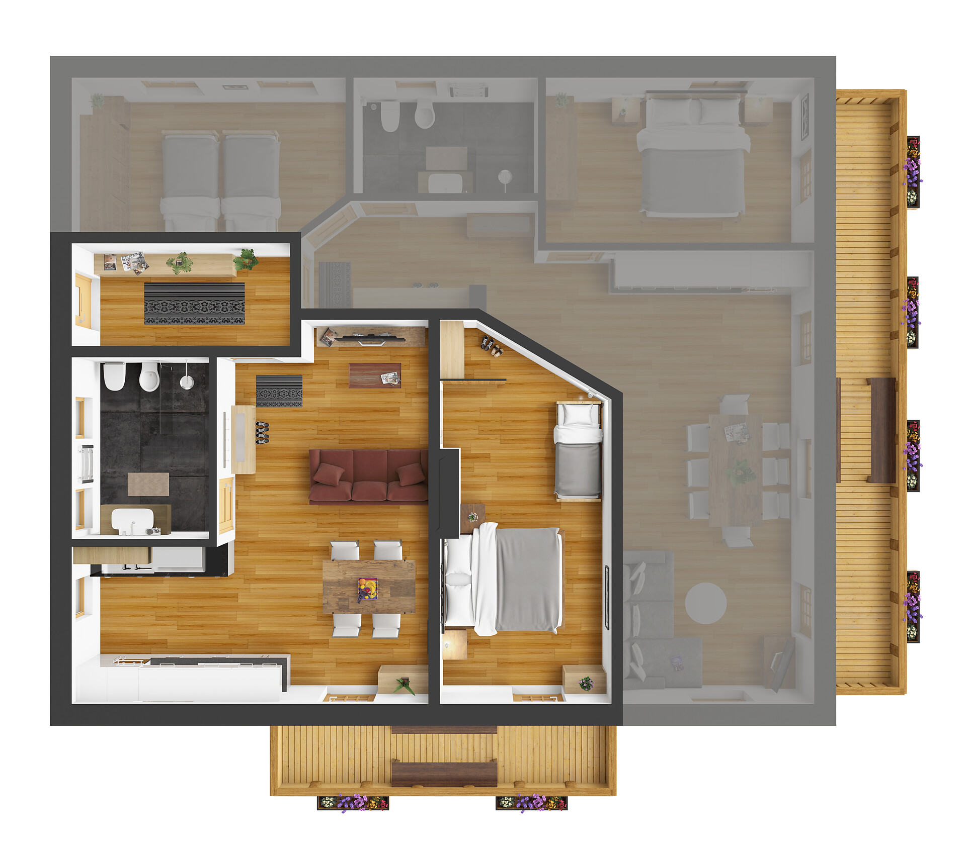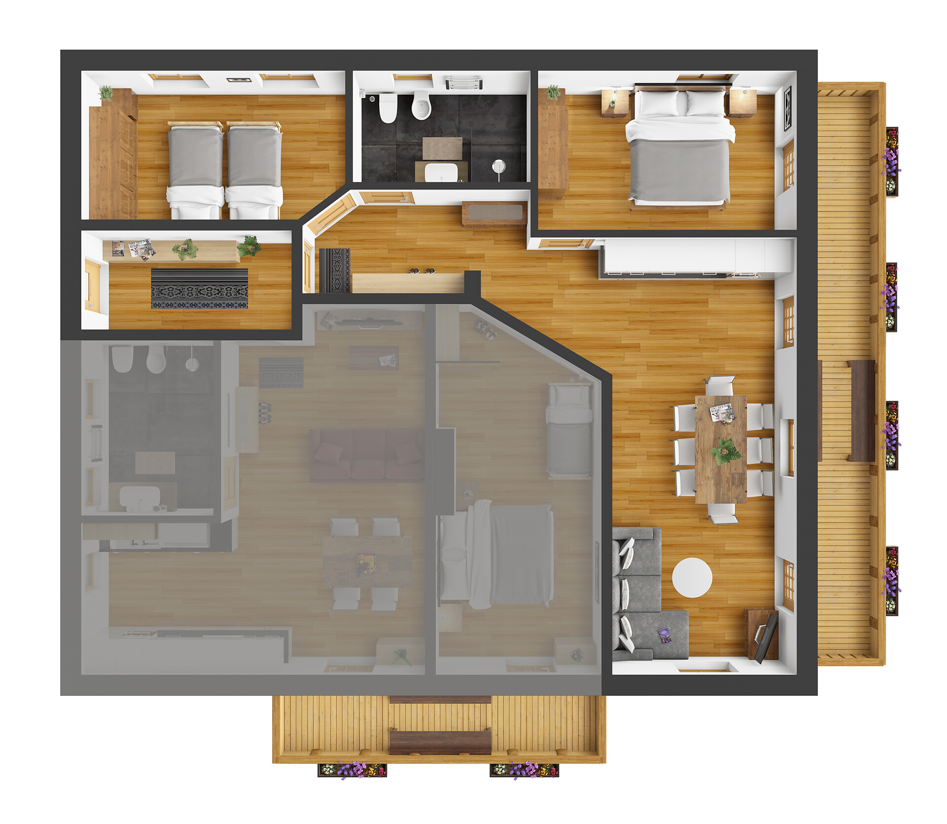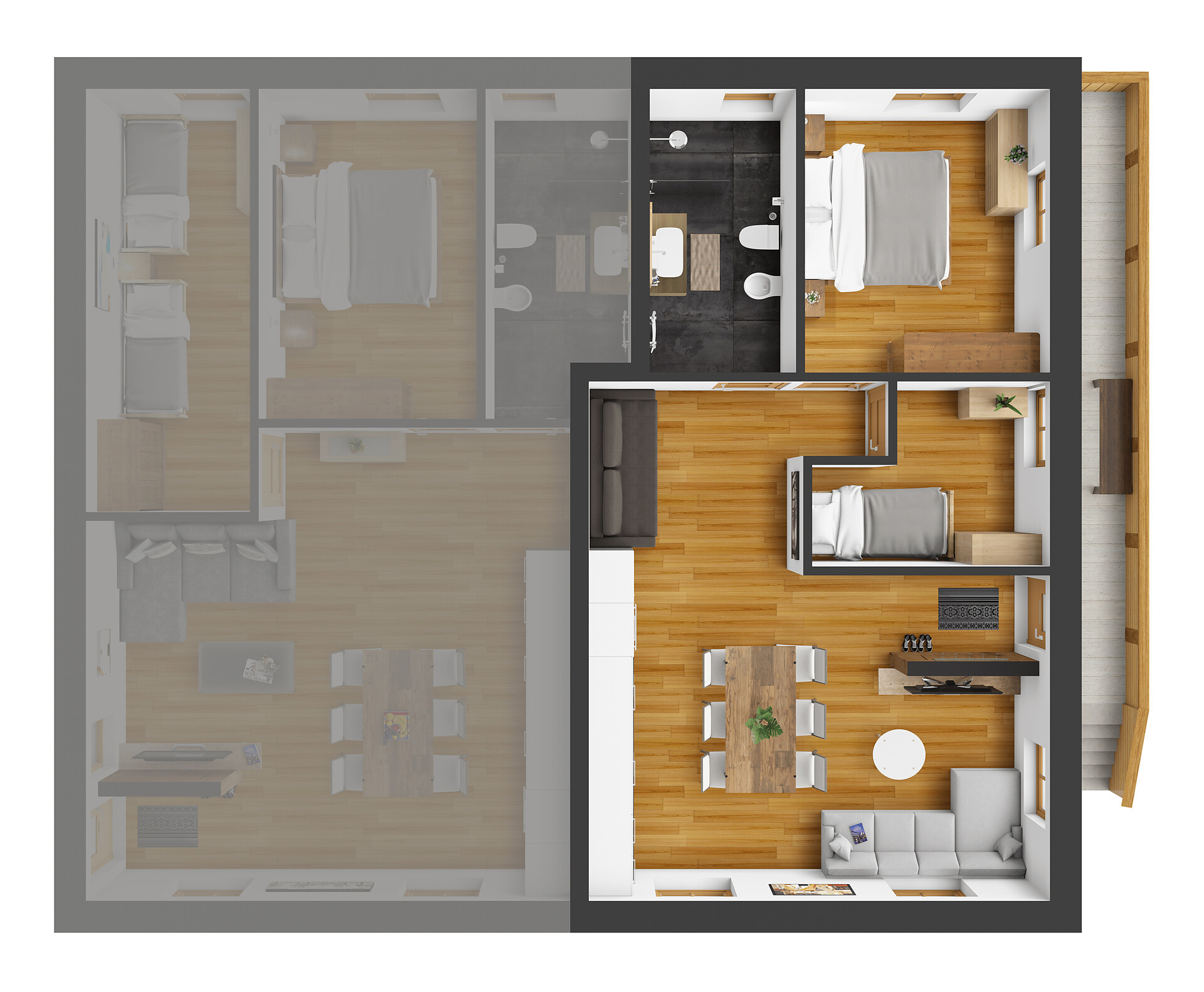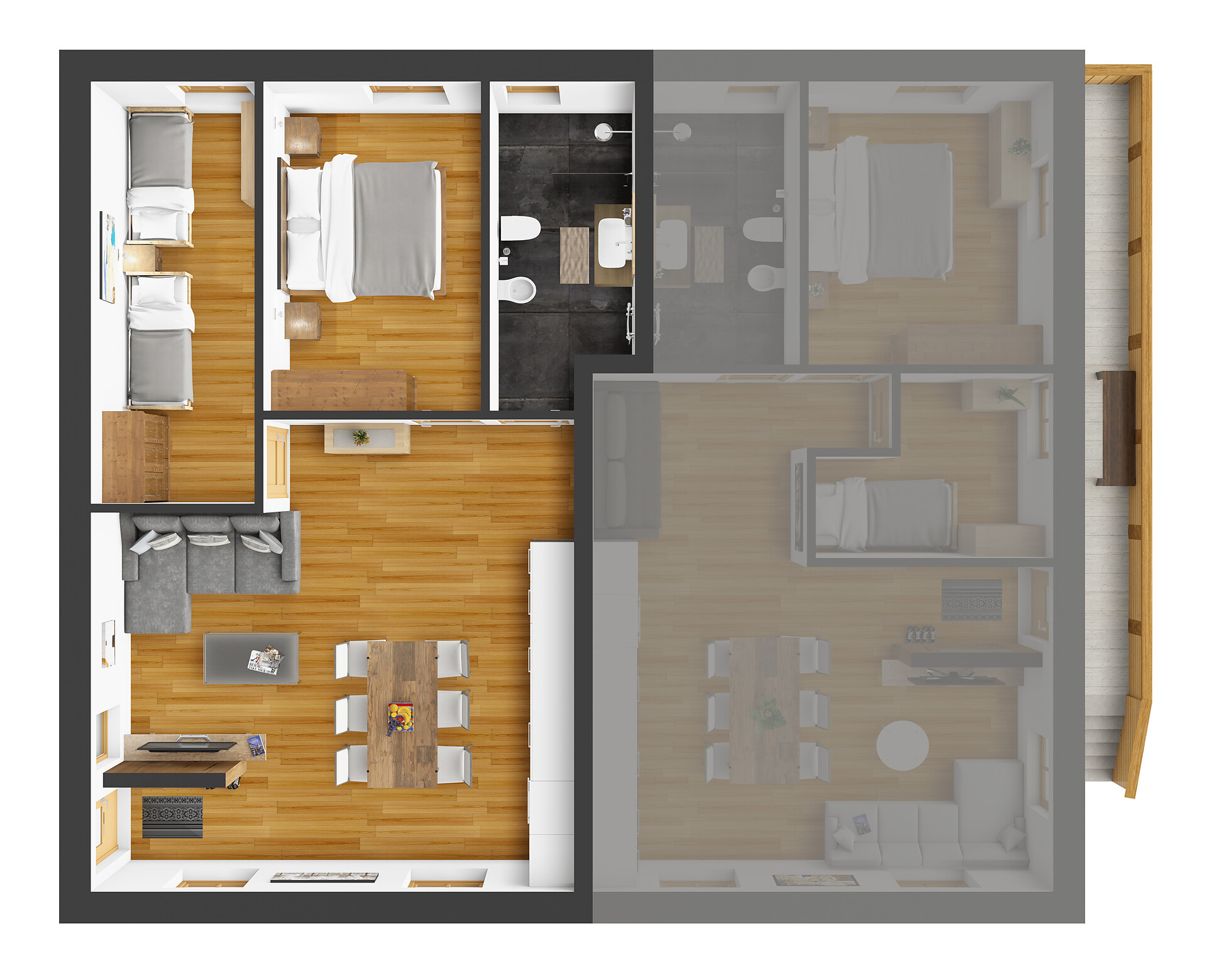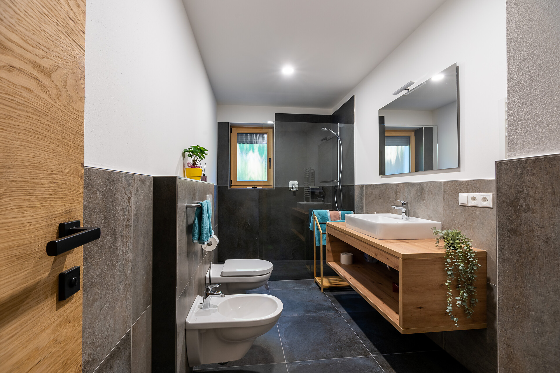 Die Ferienwohnung PANORAMA (73 m², Obergeschoss) für 4–6 Personen bietet modernen Komfort und Zugang zur Außensauna mit Panoramablick. Der große, sonnige Balkon lädt zum Entspannen mit freier Sicht auf die Bergwelt ein. Die helle Wohnküche ist ausgestattet mit Geschirrspüler, Induktionsherd, Backrohr, Espressomaschine, Kühlschrank mit Gefrierfach, Mikrowelle und allen notwendigen Utensilien. Ein 43″ Smart TV mit High-Speed-Internet, kompatibel mit allen Streaming-Diensten, kostenloses WLAN sowie verschiedene Bücher sind vorhanden. Das Bad verfügt über Fenster, große Dusche, WC, Bidet, Badheizkörper und viel Ablage. Alle Räume besitzen Fußbodenheizung und Wohnraumlüftung. Schlafmöglichkeiten: Doppelzimmer, Zimmer mit zwei Stockbetten sowie Schlafsofa mit komfortabler Matratze. Fenster mit elektrischen Rollläden und Insektenschutz. Waschmaschine vorhanden. Parkplätze am Haus, Garage auf Anfrage; Skischuhtrockner für alle Gäste. Endreinigung inkl. (ausgenommen Küchenzeile), Kaution 150 €.