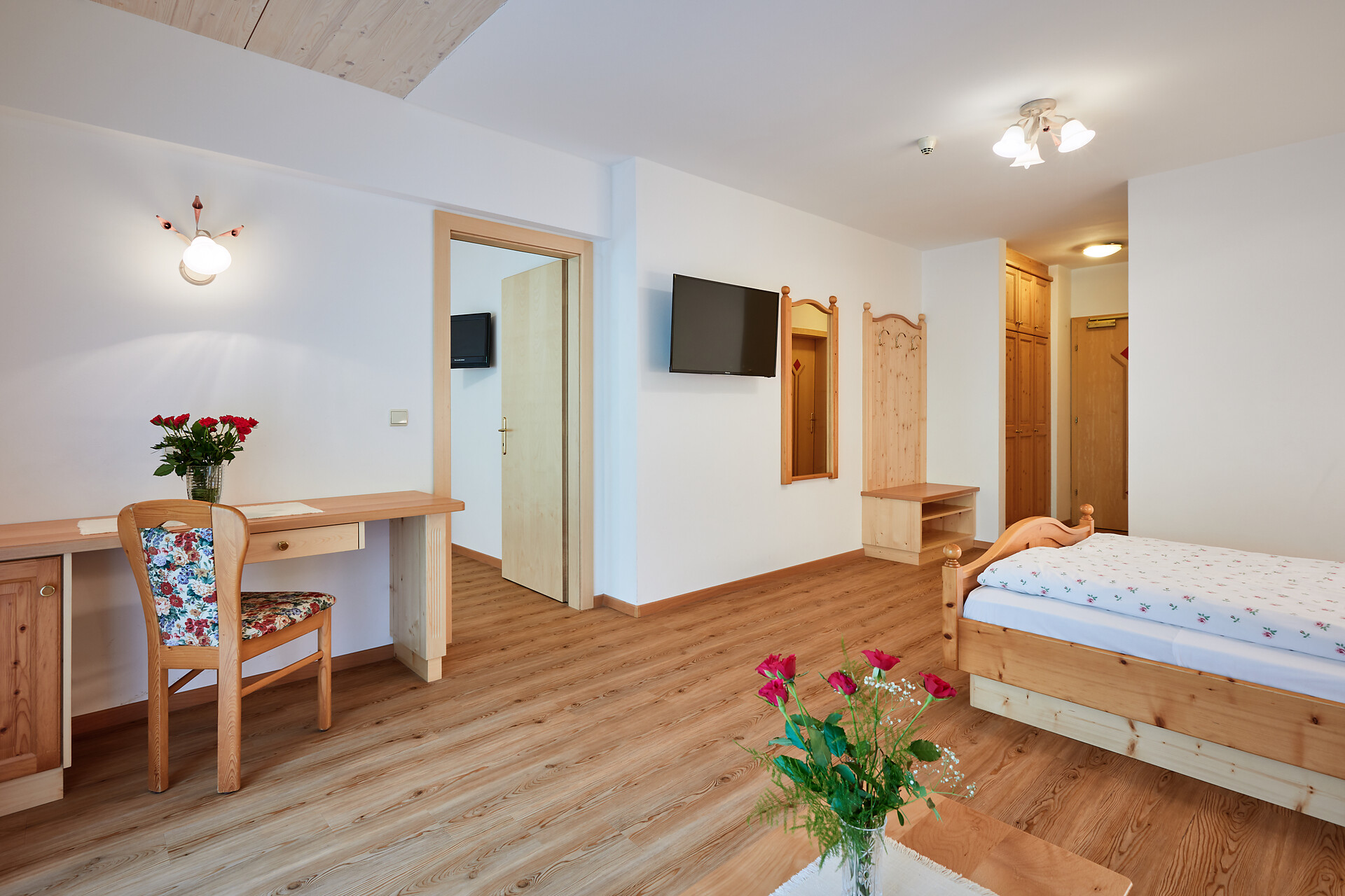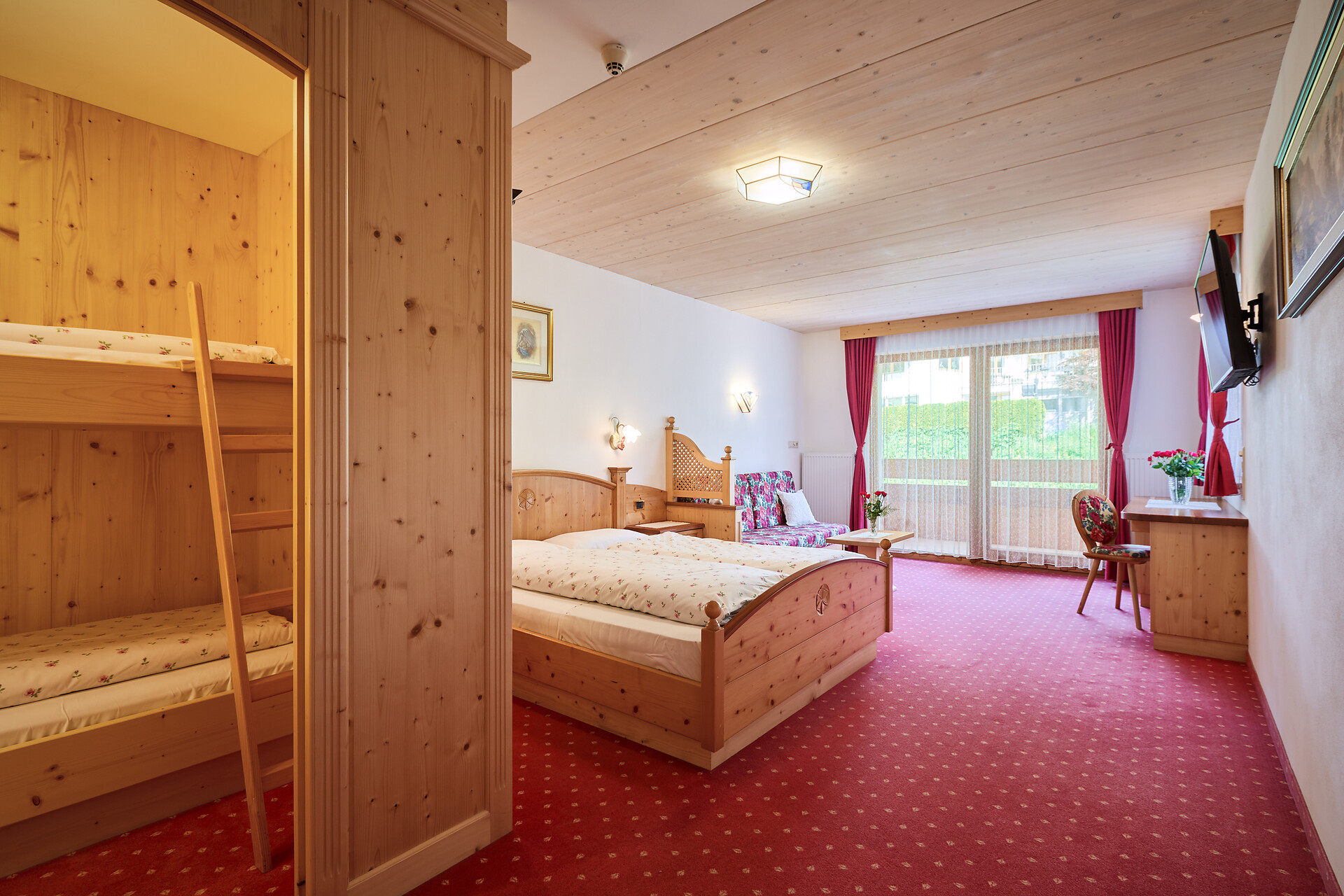 Das Familienzimmer "Fane" (40 - 45 qm) bietet ein separates Kinderzimmer mit Fenster, Sat-Tv und zwei Einzelbetten. Das Familienzimmer ist eingerichtet mit Massivholzmöbeln aus der Region, Bad mit Dusche/WC, Bidet, Föhn, Flachbildfernseher mit Sat-TV, Schreibtisch, Sitzecke, Safe und Balkon mit Panoramablick.