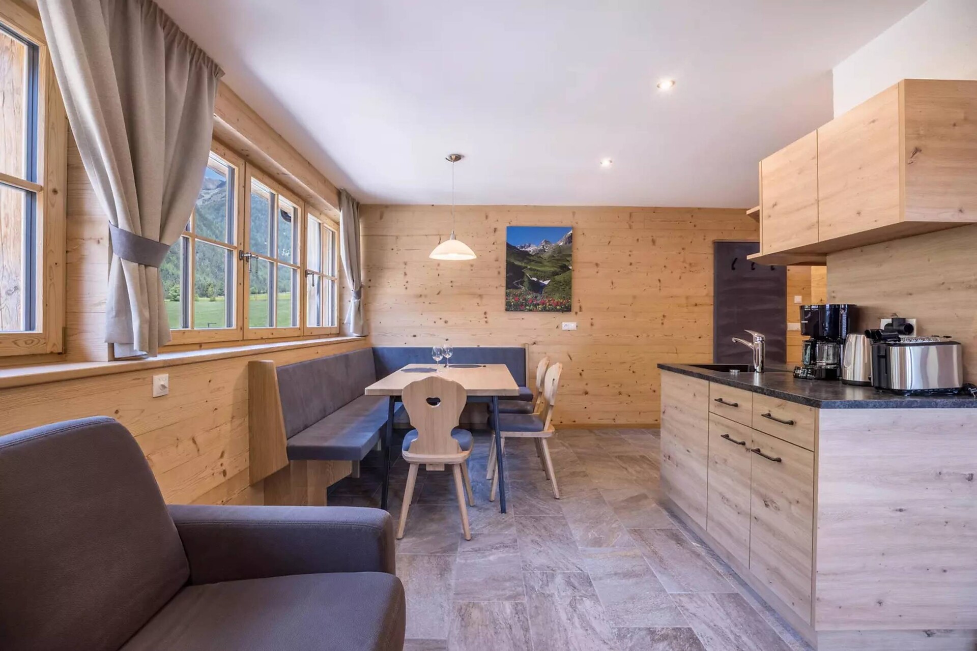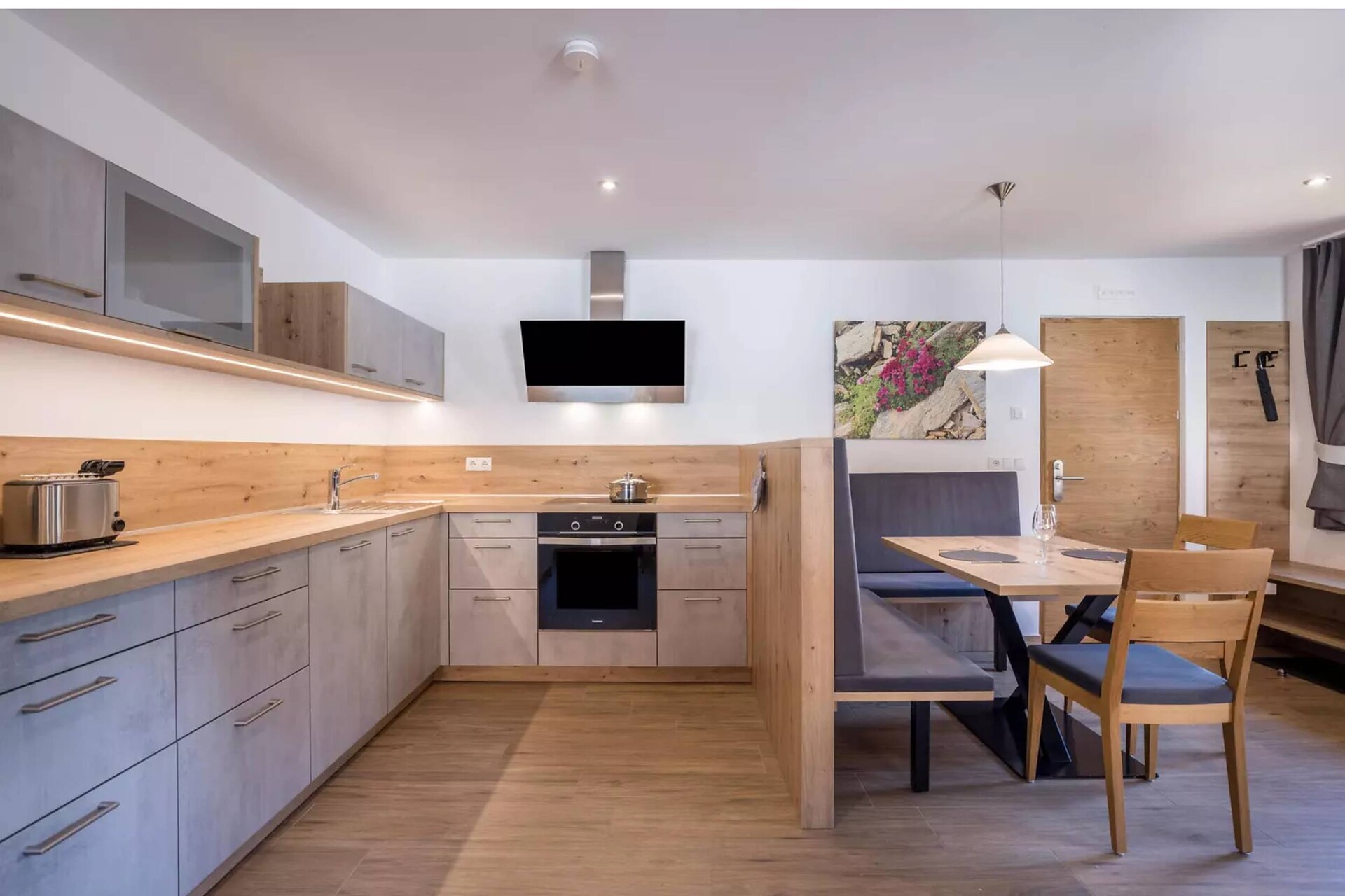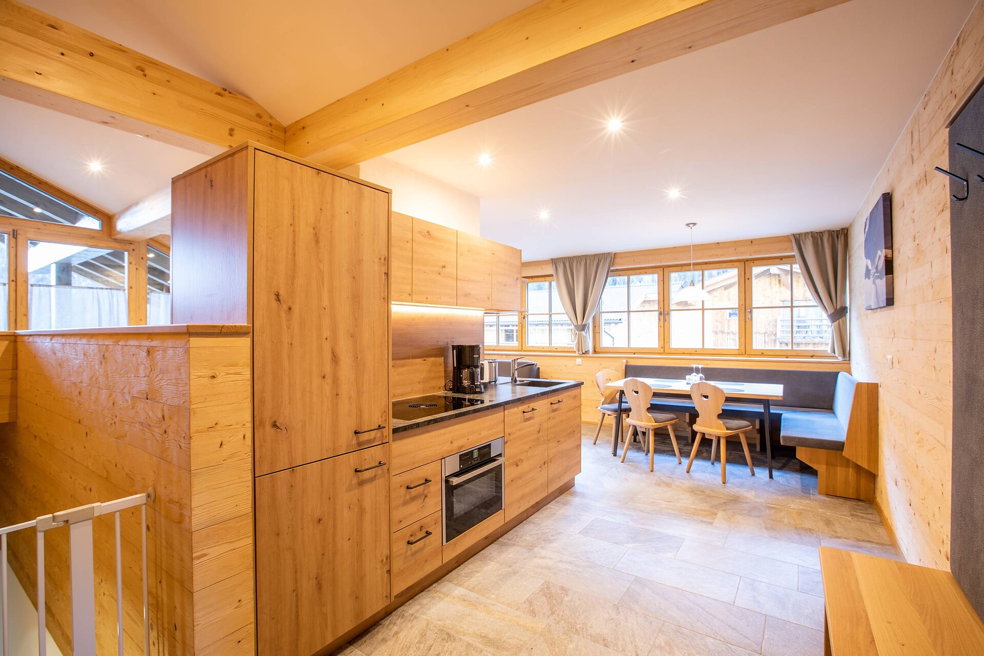 • voll ausgestattete Wohnküche mit Backrohr, Spülmaschine, Kühlschrank mit Gefrierfach, Mikrowelle, Toaster, Filterkaffeemaschine, Mokkakanne, Wasserkocher, Kochgeschirr, Teller, Besteck, Gläser
