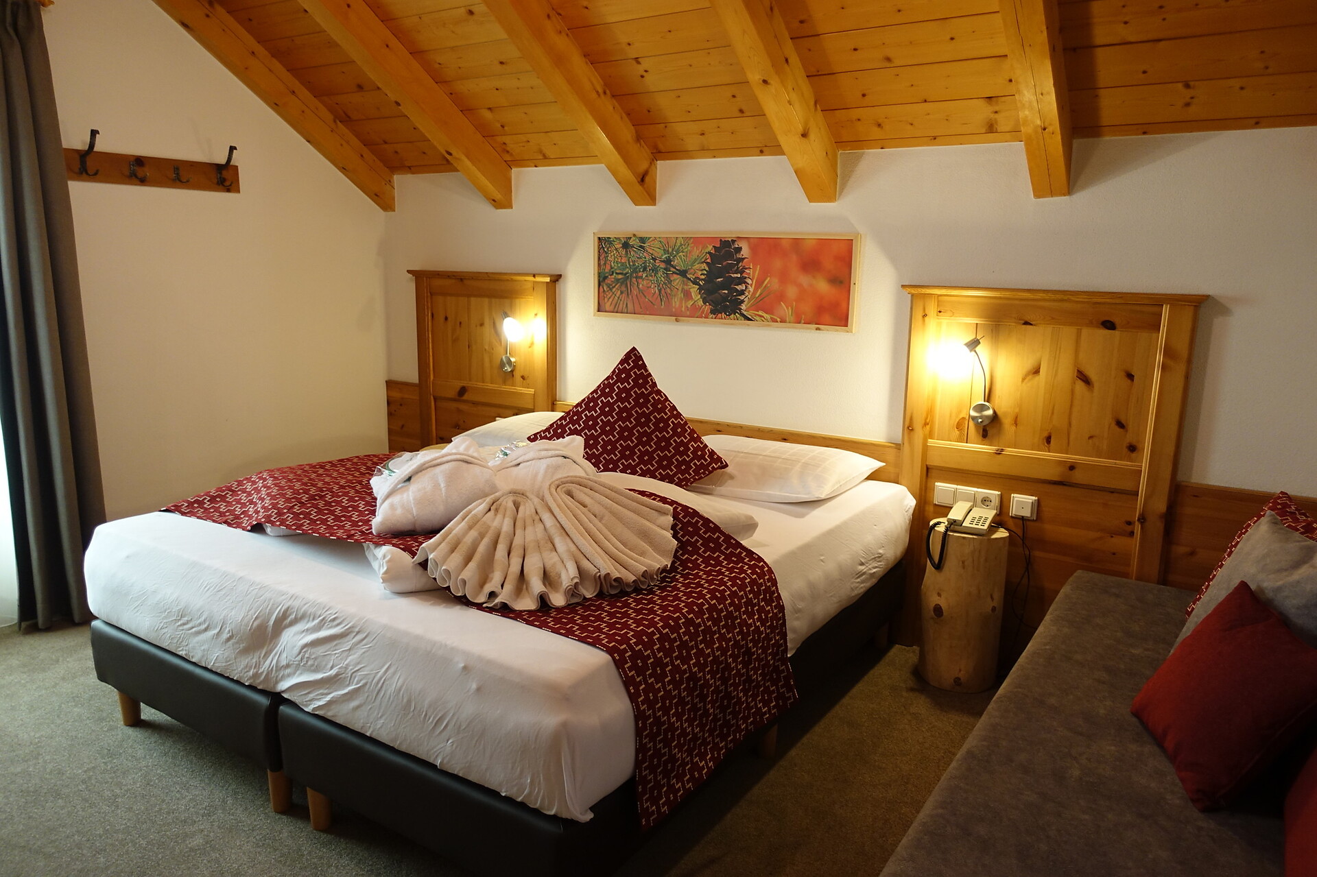 Ausreichend Raum für entspannende Wohlfühltage zu zweit oder auch mit Kind. Komfortable Ausstattung: Sat-TV, großzügiger Balkon zur Bergseite, Föhn, kuschelige Bademäntel und Sauna-Slipper, Badetasche, Badezimmer mit Dusche, kostenloses W-Lan.