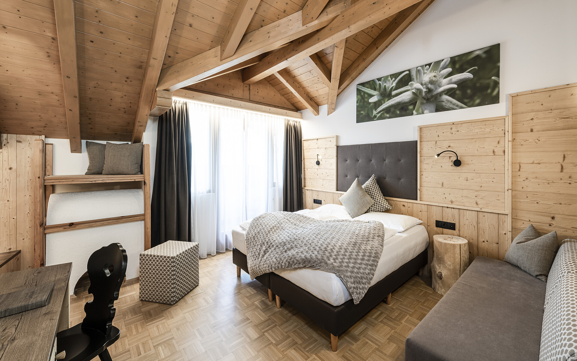 Komfortables und heimeliges Familienzimmer im 3. Stockwerk mit überdachter Gaubenloge. Komfortable Ausstattung: Sat-TV, überdachter Gaubenbalkon Richtung Süden, Föhn, kuschelige Bademäntel und Sauna-Slipper, Badetasche, Badezimmer mit Dusche, kostenloses W-Lan.