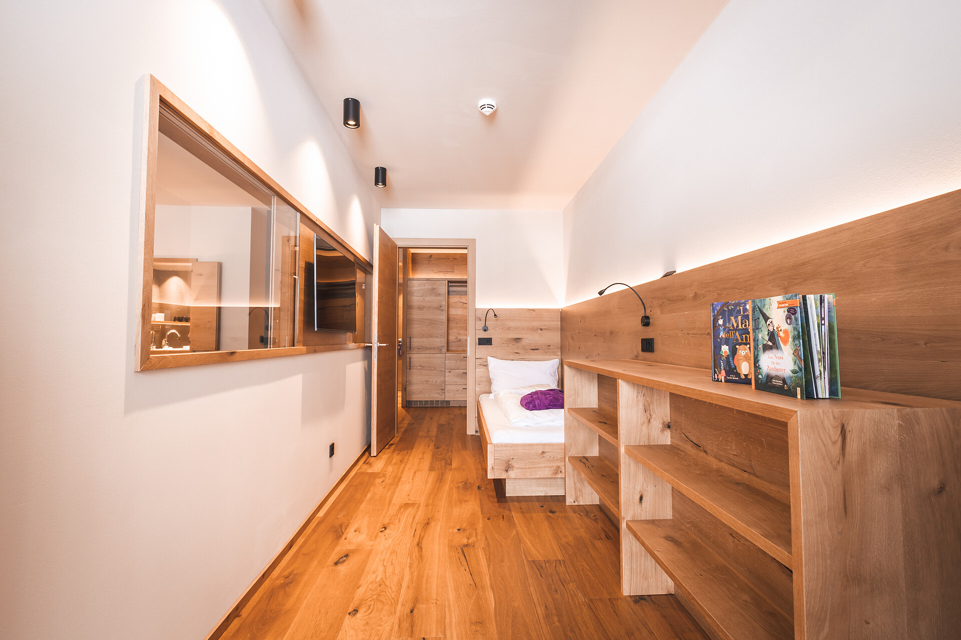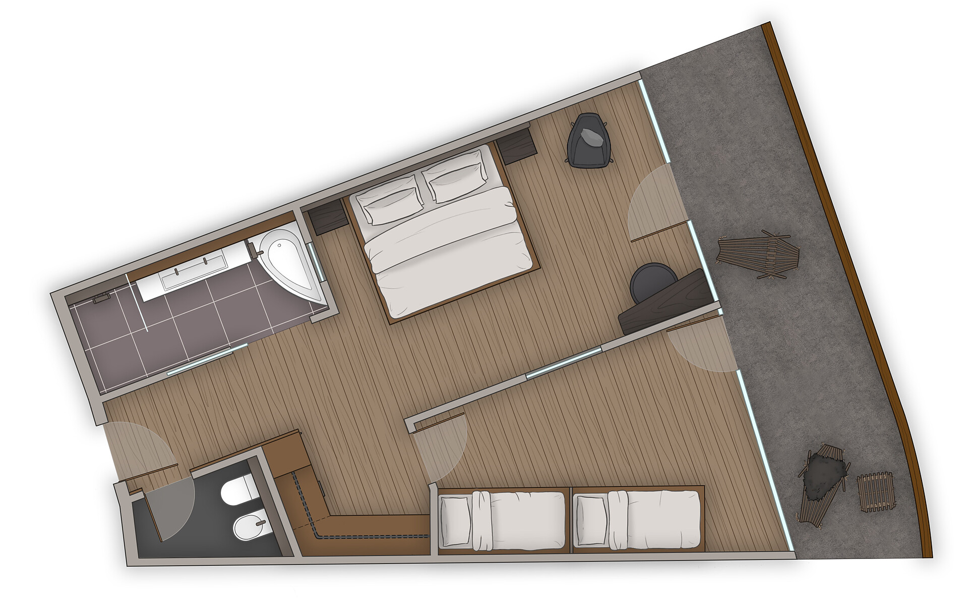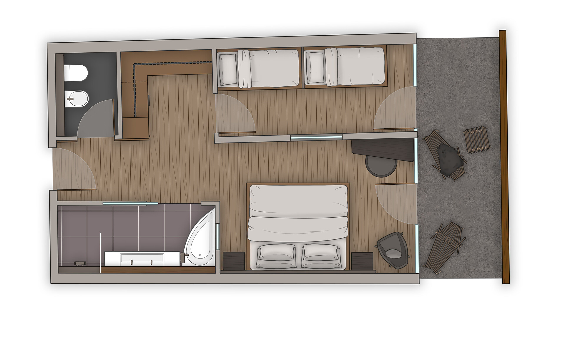 40 - 45 m² large bright room with wood floor & natural materials, extra large family-cuddly-bed (240 x 200 cm), large walk-in closet, separable children's room with max. 4 cozy beds (90 x 190 cm), bathroom with family basins, kids bathtub & shower, step stool for kids & changing mat, 2 x satellite TV, spacious panoramic balcony