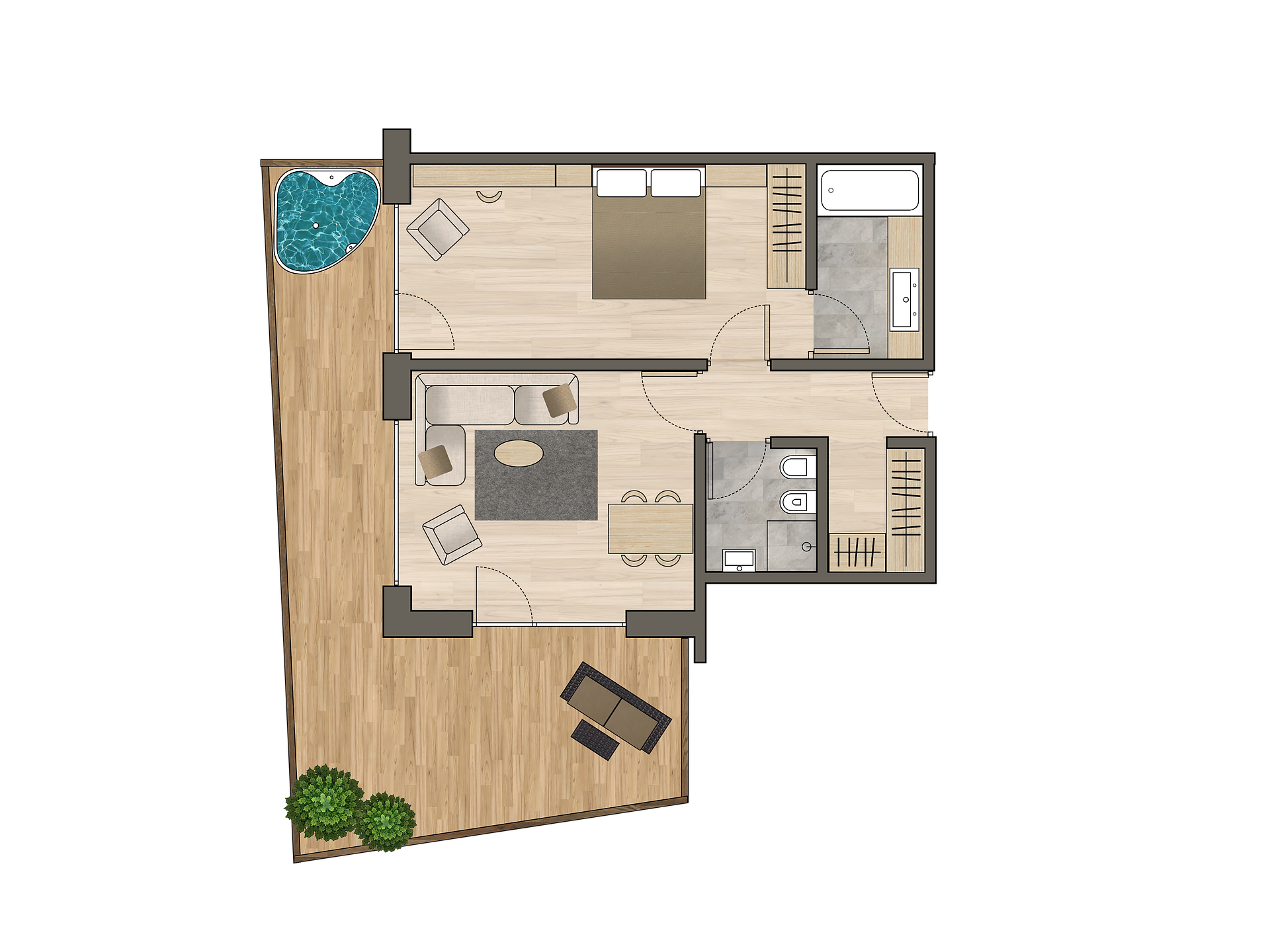 Suite with separate sleeping and living area, large terrace to enjoy the afternoon sun, and living area- Equipped with sofa, dining table, satellite TV, WiFi, telephone, safe, and minibar.2 bathrooms with bath and rain shower, bidet, toilet, hairdryer and make-up mirror, wooden floor, frameless windows and outdoor private Hot-Spring-Whirlpool.