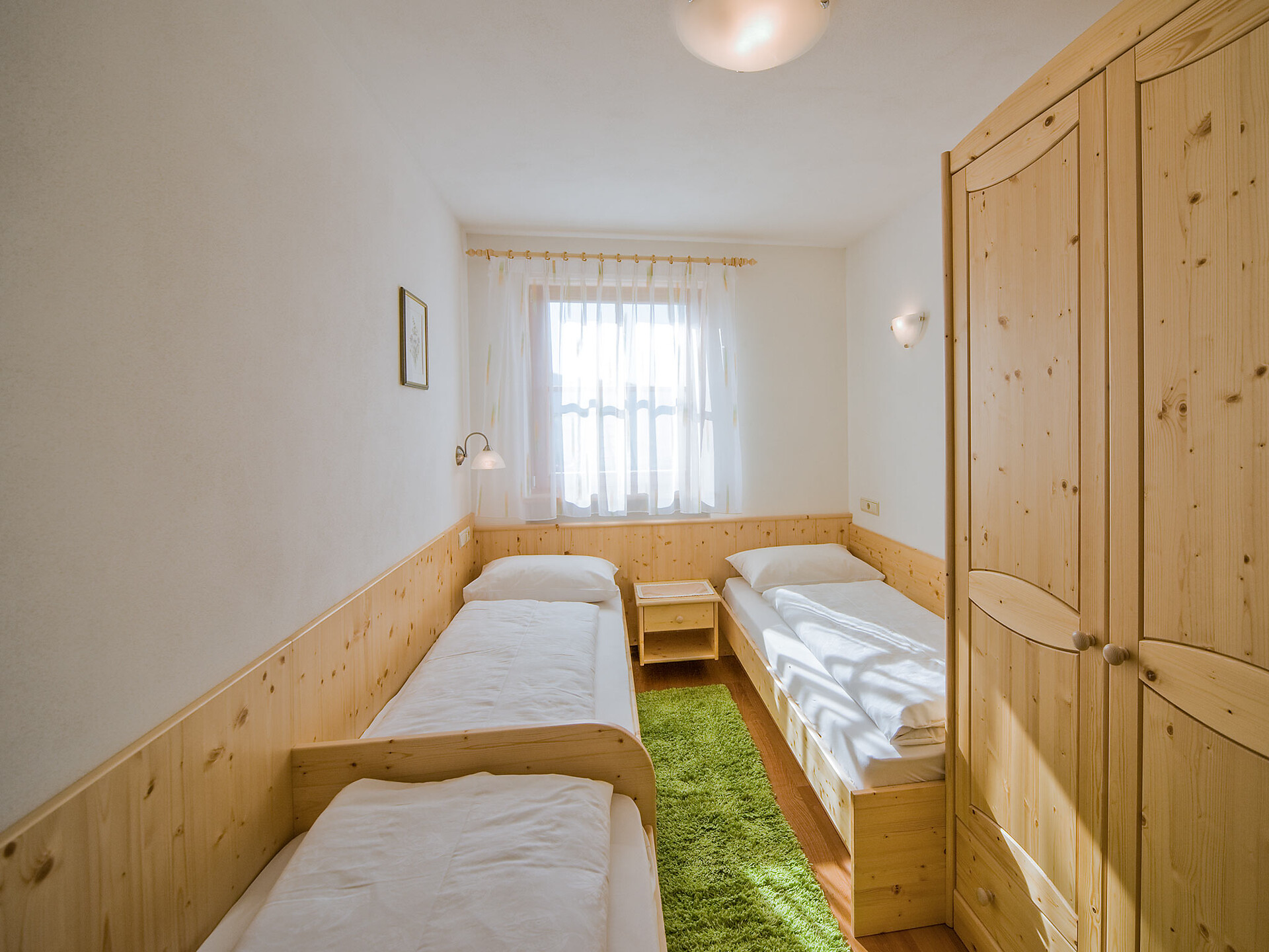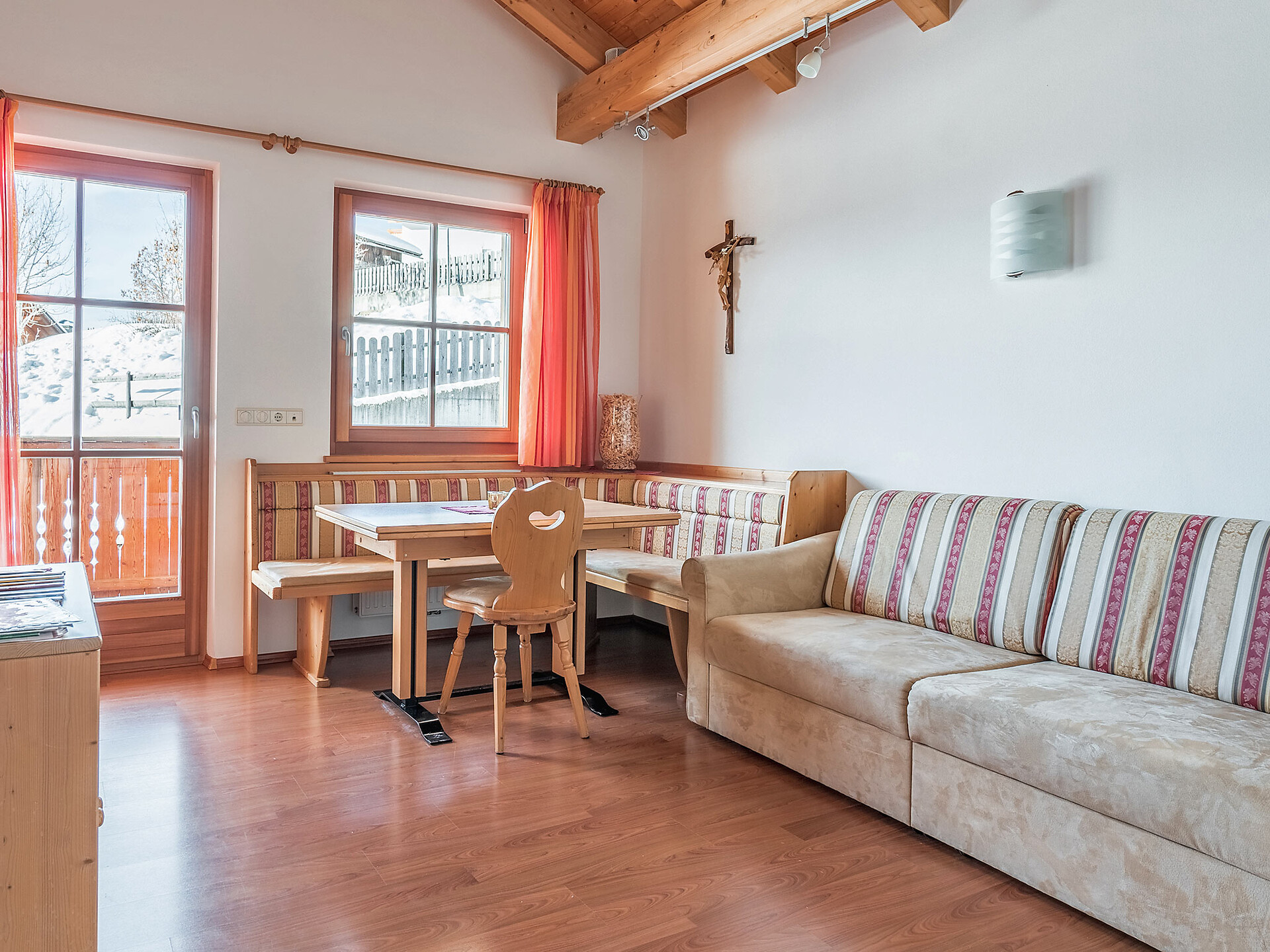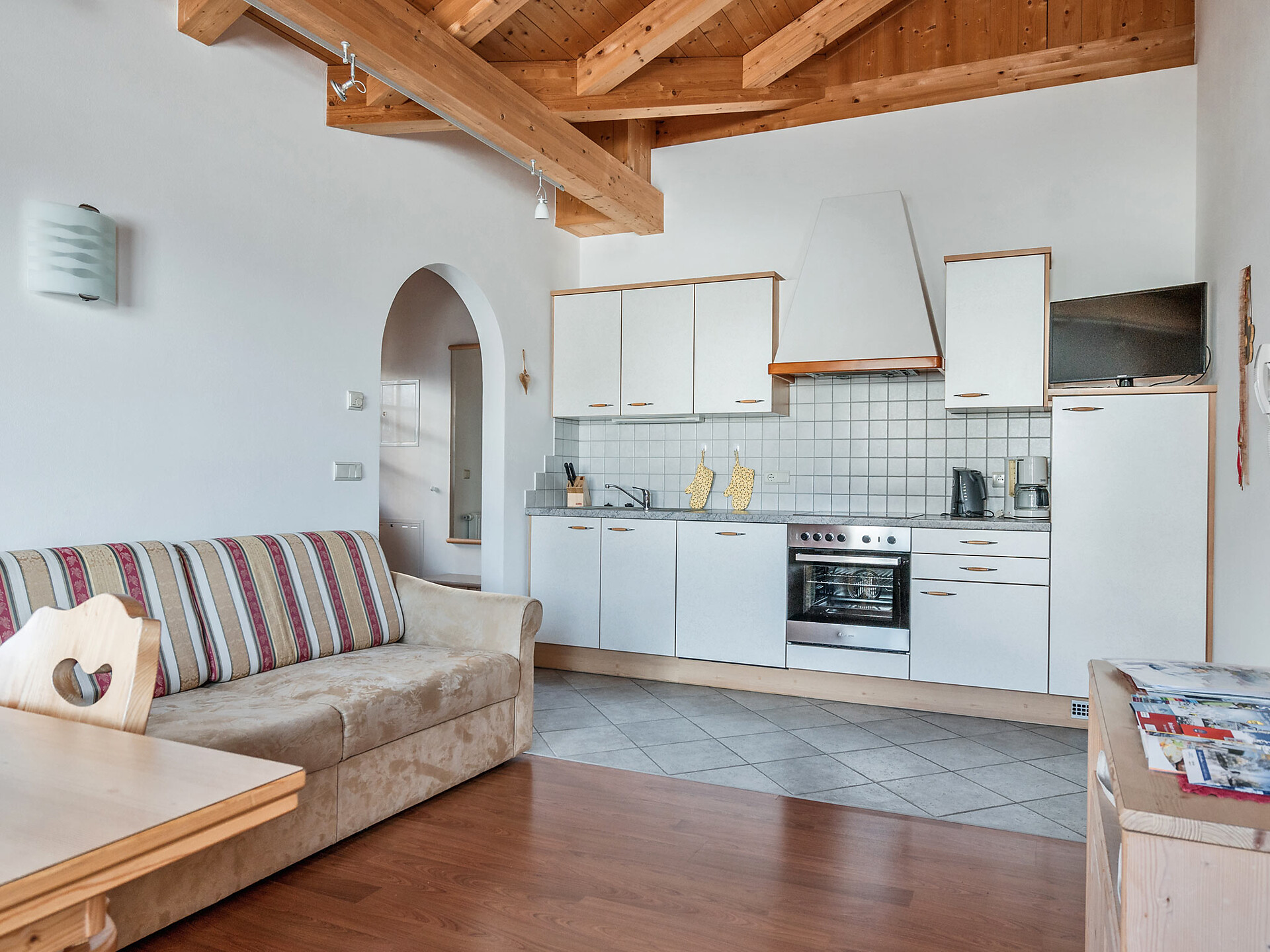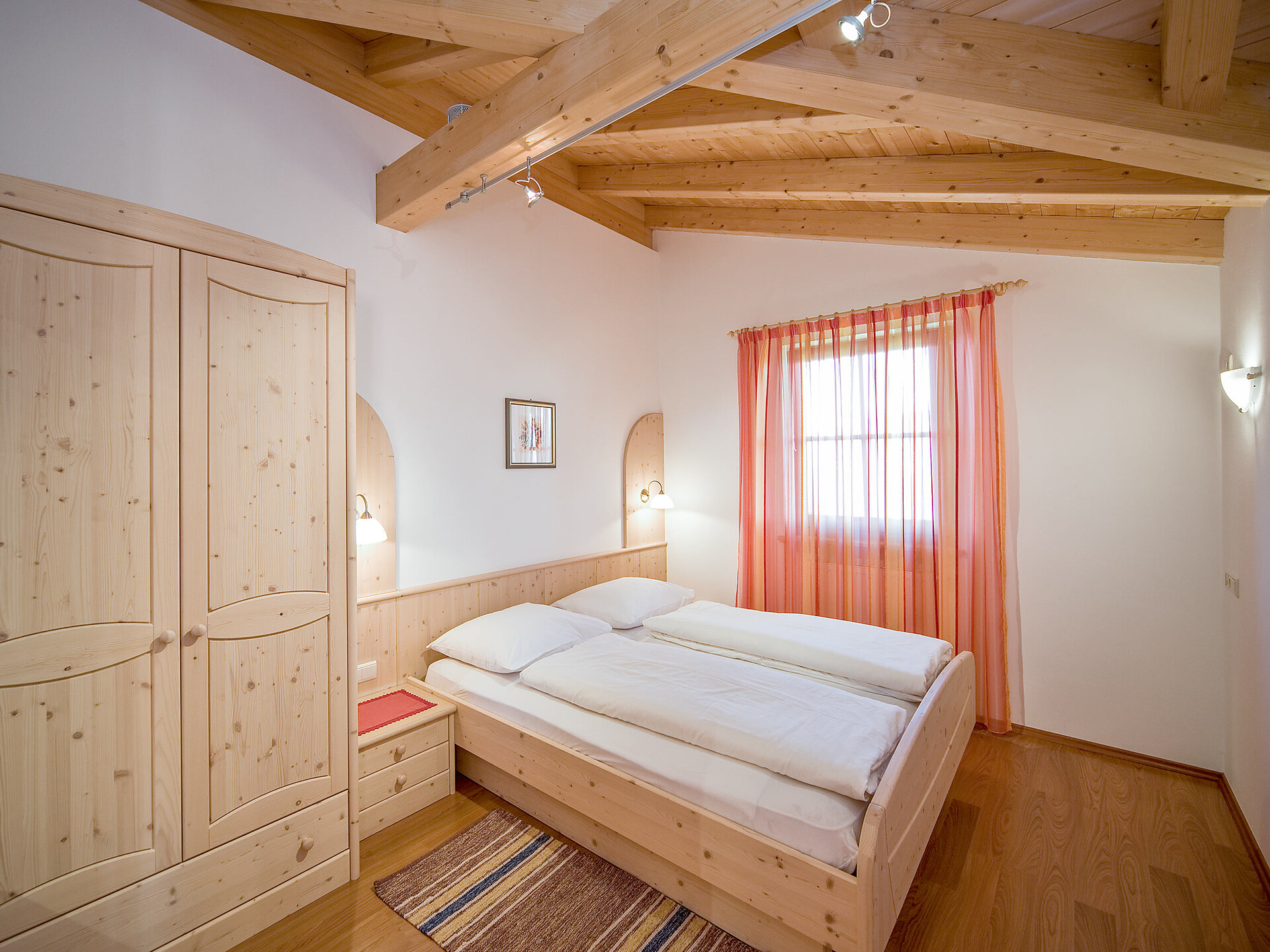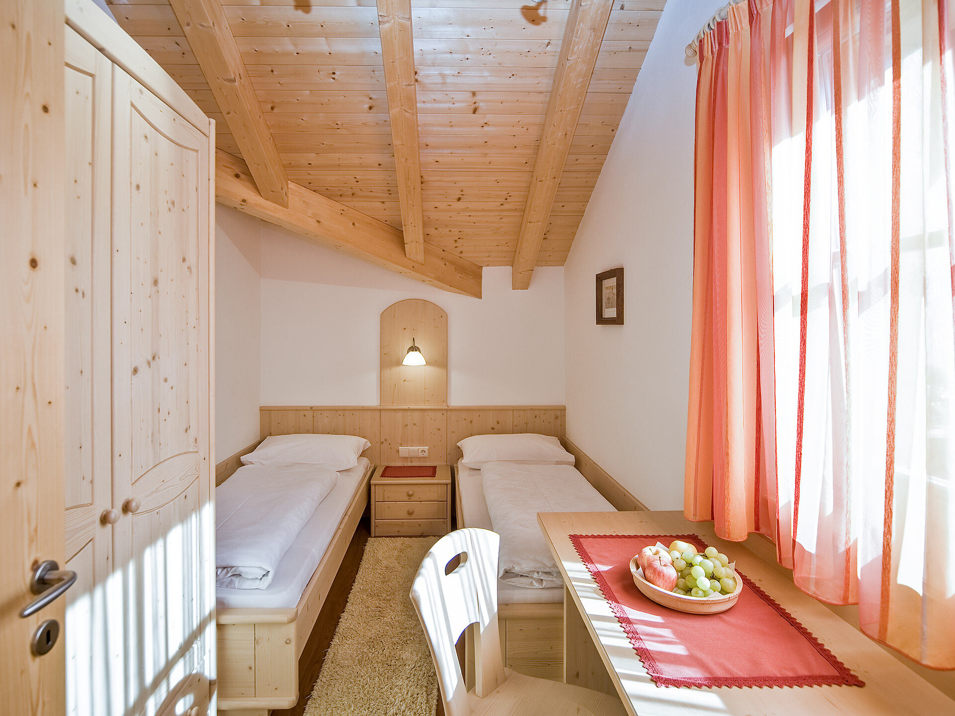 The spacious vacation apartment “Fichte” (Fir) with 50 m² floor space offers lots of space for 2 to 6 guests. The vacation apartment is located in the attic of the Birkenhof farm, its wooden ceilings provide a cozy atmosphere. Two separate bedrooms and a sunny kitchen/living room combo offers plenty of space for families. The kitchen is equipped with a fridge with icebox, ceramic stove top with four burners, oven, extractor hood, electric kettle, coffee maker (mocha), dishwasher, as well as tableware, cutlery and cookware. There is also a private balcony with a wonderful view of the Eisacktal (Valle Isarco), Pustertal (Valle Pusteria) and, weather conditions permitting, the Dolomites, too.