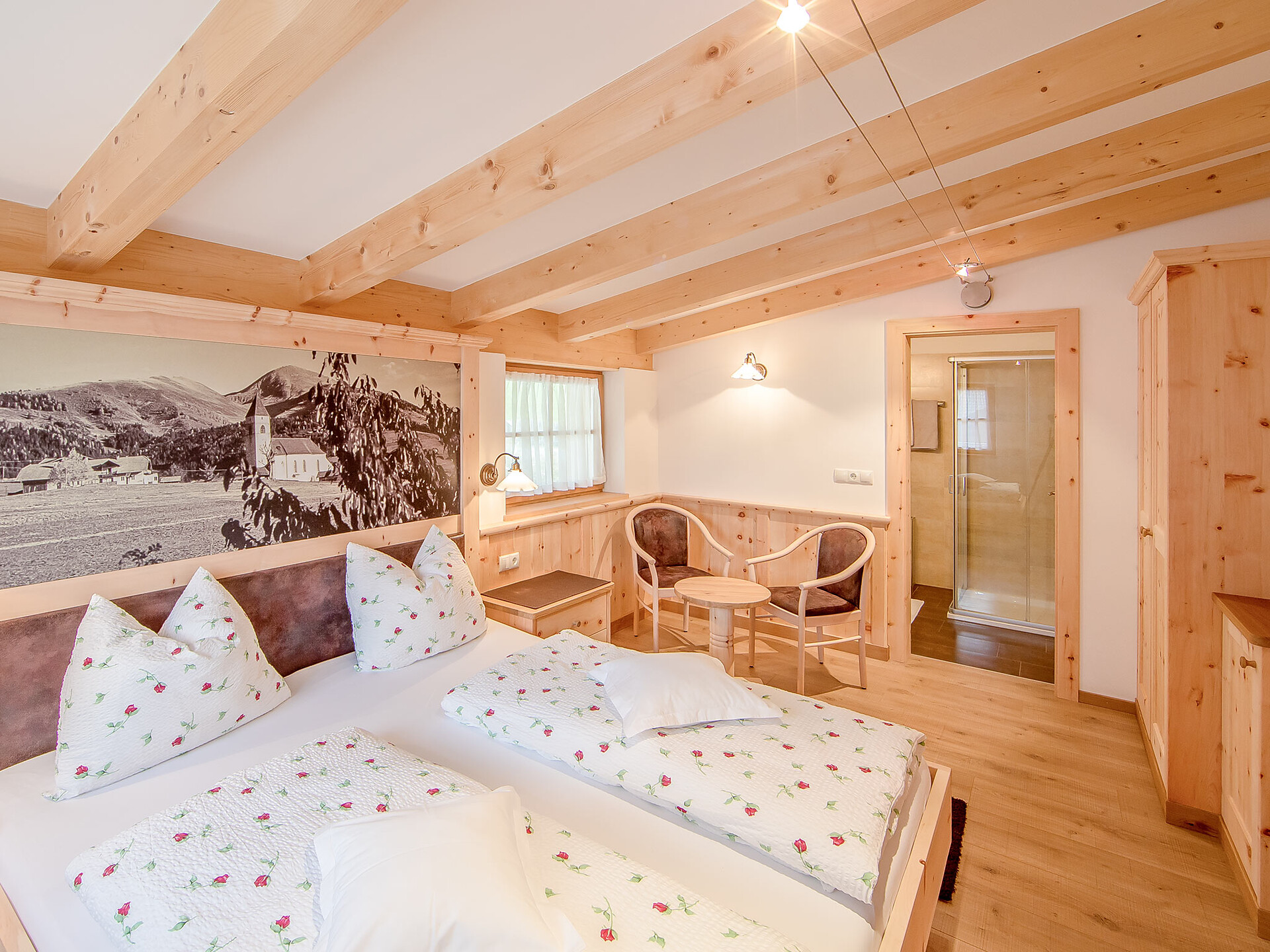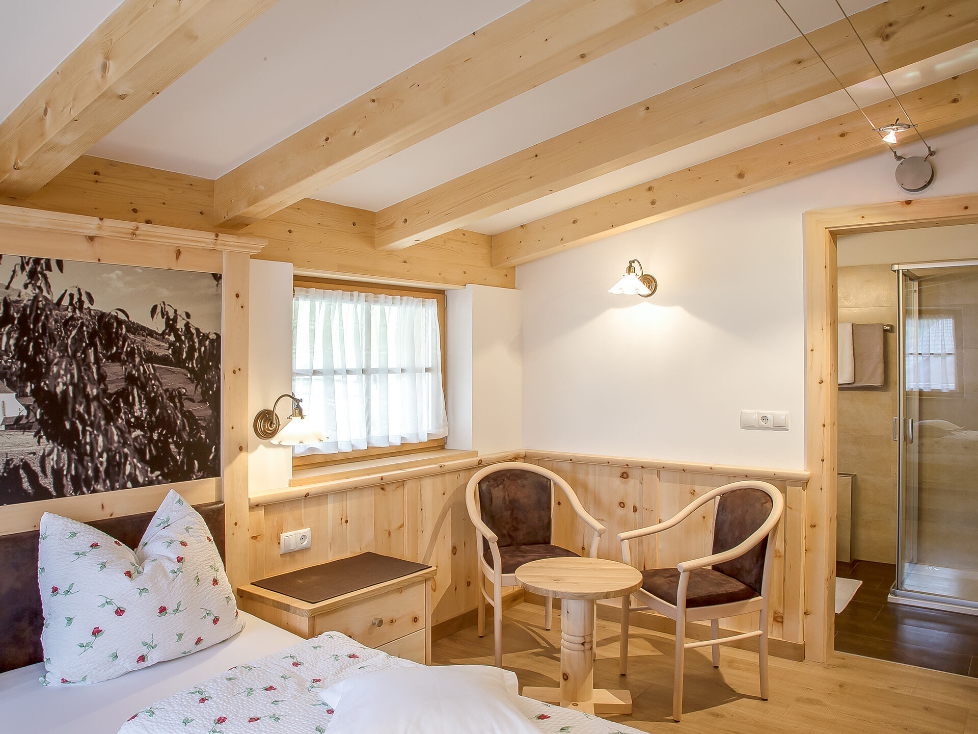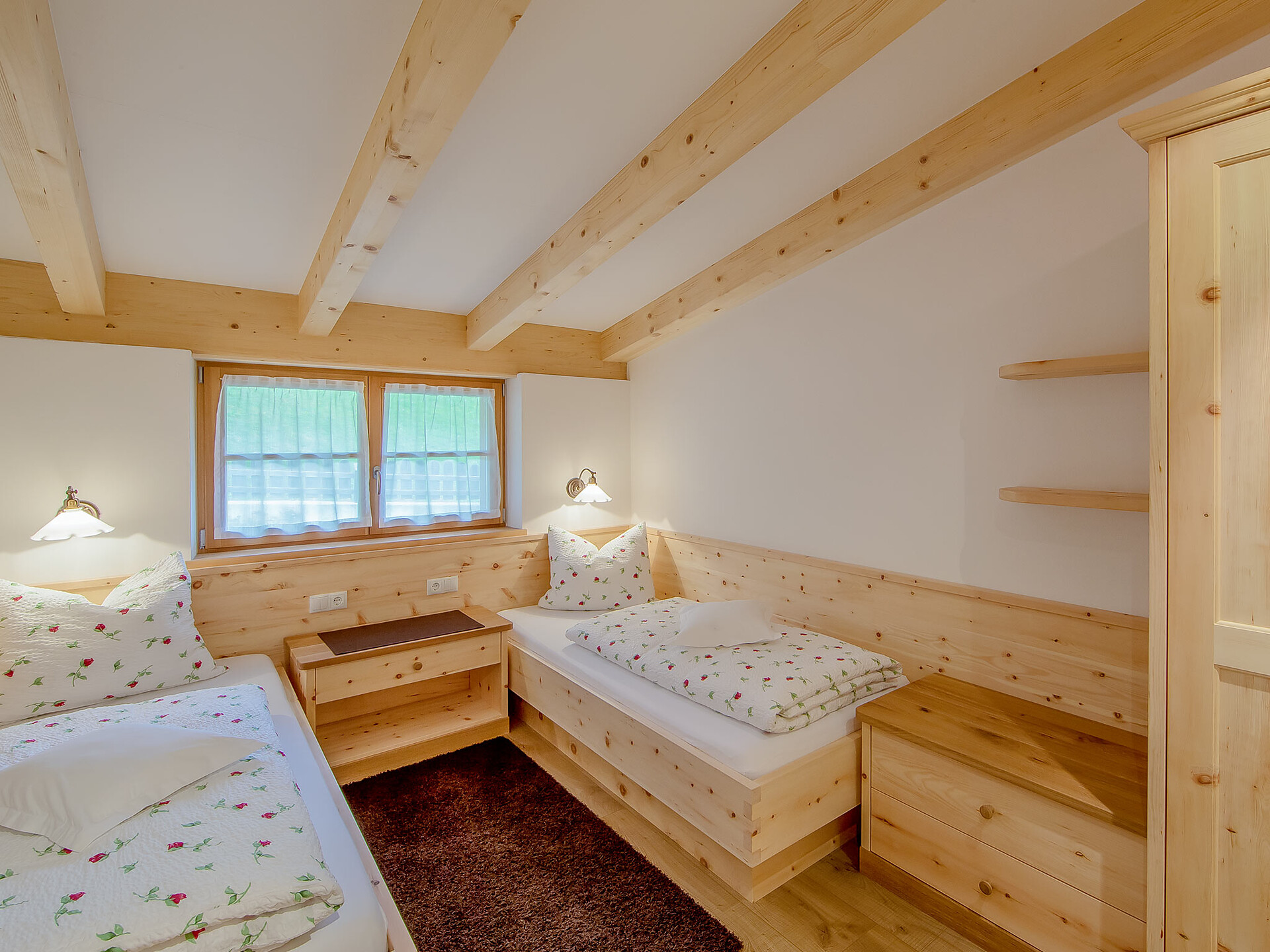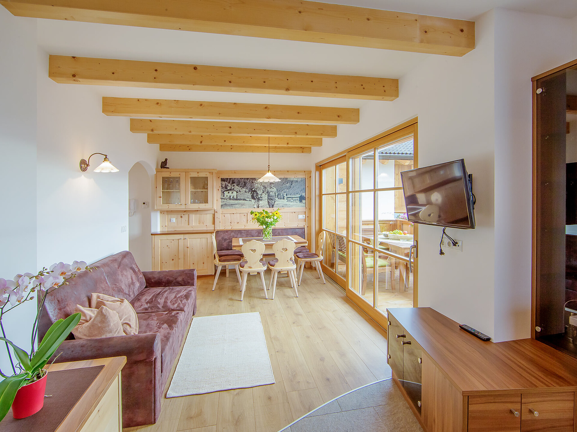 The spacious vacation apartment “Fichte” (Fir) with 50 m² floor space offers lots of space for 2 to 6 guests. The vacation apartment is located in the attic of the Birkenhof farm, its wooden ceilings provide a cozy atmosphere. Two separate bedrooms and a sunny kitchen/living room combo offers plenty of space for families. The kitchen is equipped with a fridge with icebox, ceramic stove top with four burners, oven, extractor hood, electric kettle, coffee maker (mocha), dishwasher, as well as tableware, cutlery and cookware. There is also a private balcony with a wonderful view of the Eisacktal (Valle Isarco), Pustertal (Valle Pusteria) and, weather conditions permitting, the Dolomites, too.
