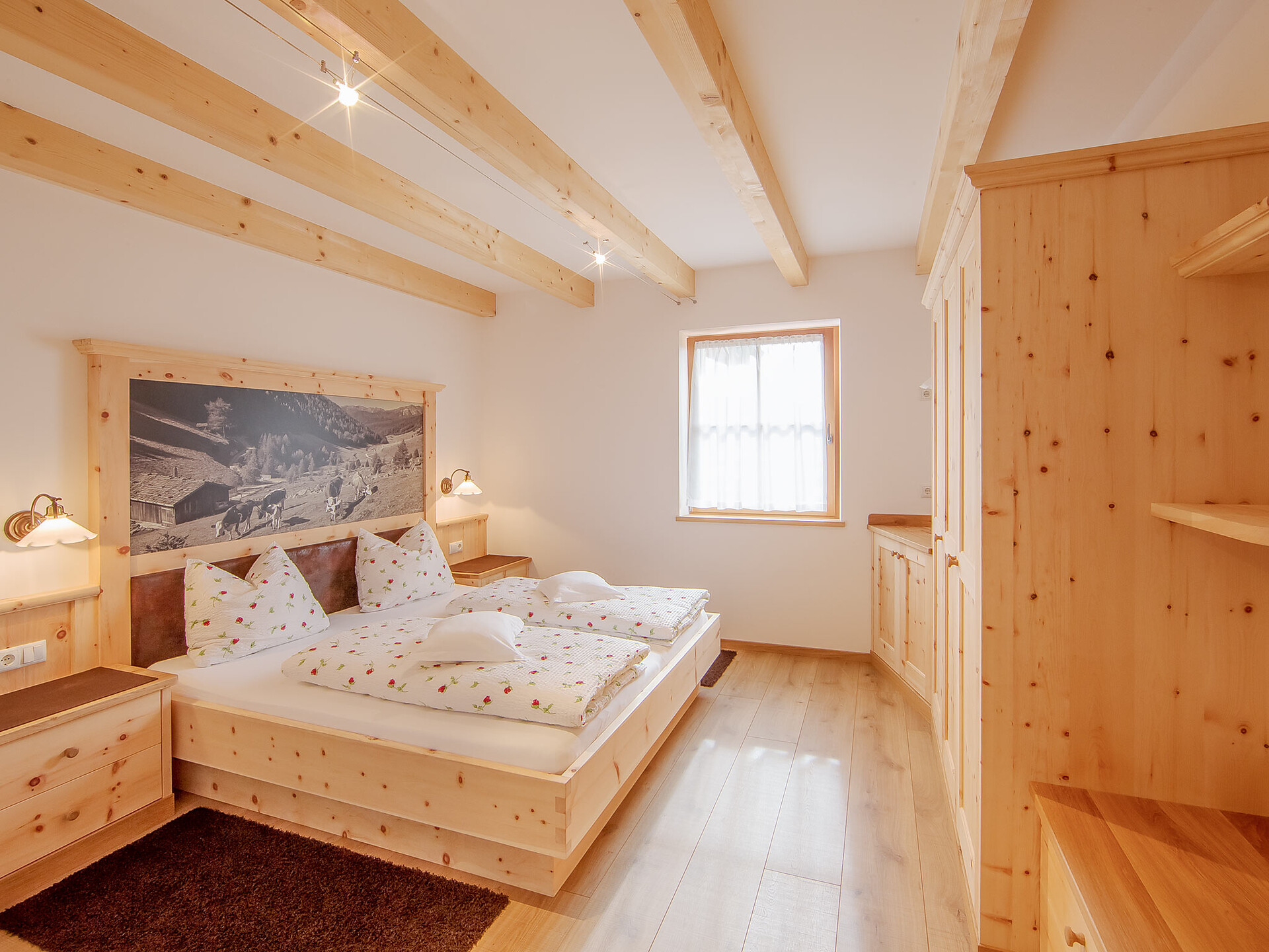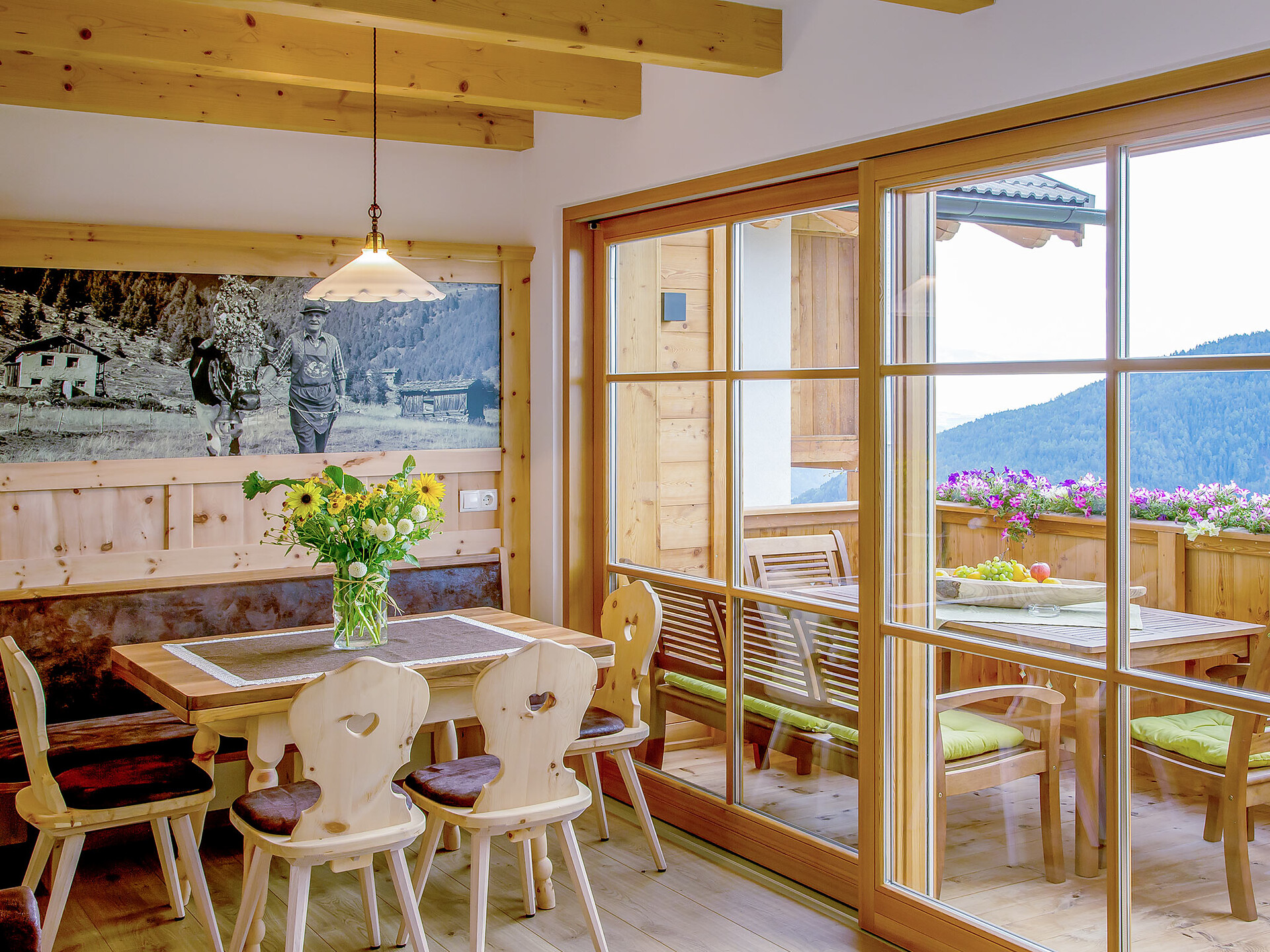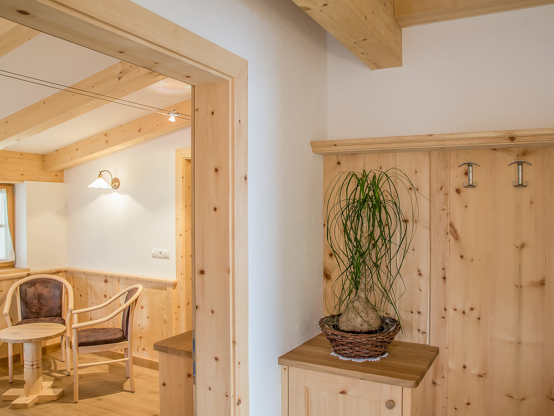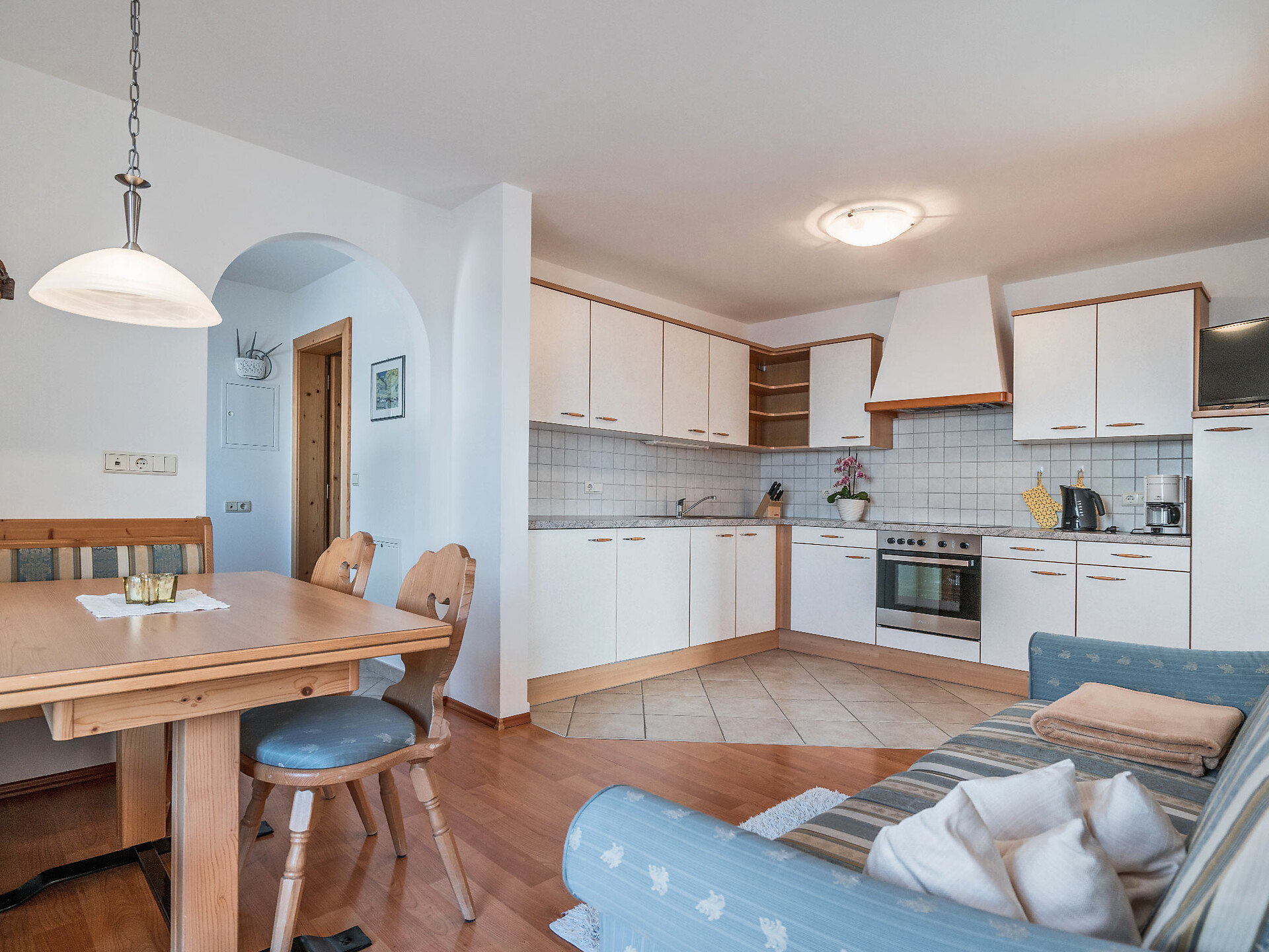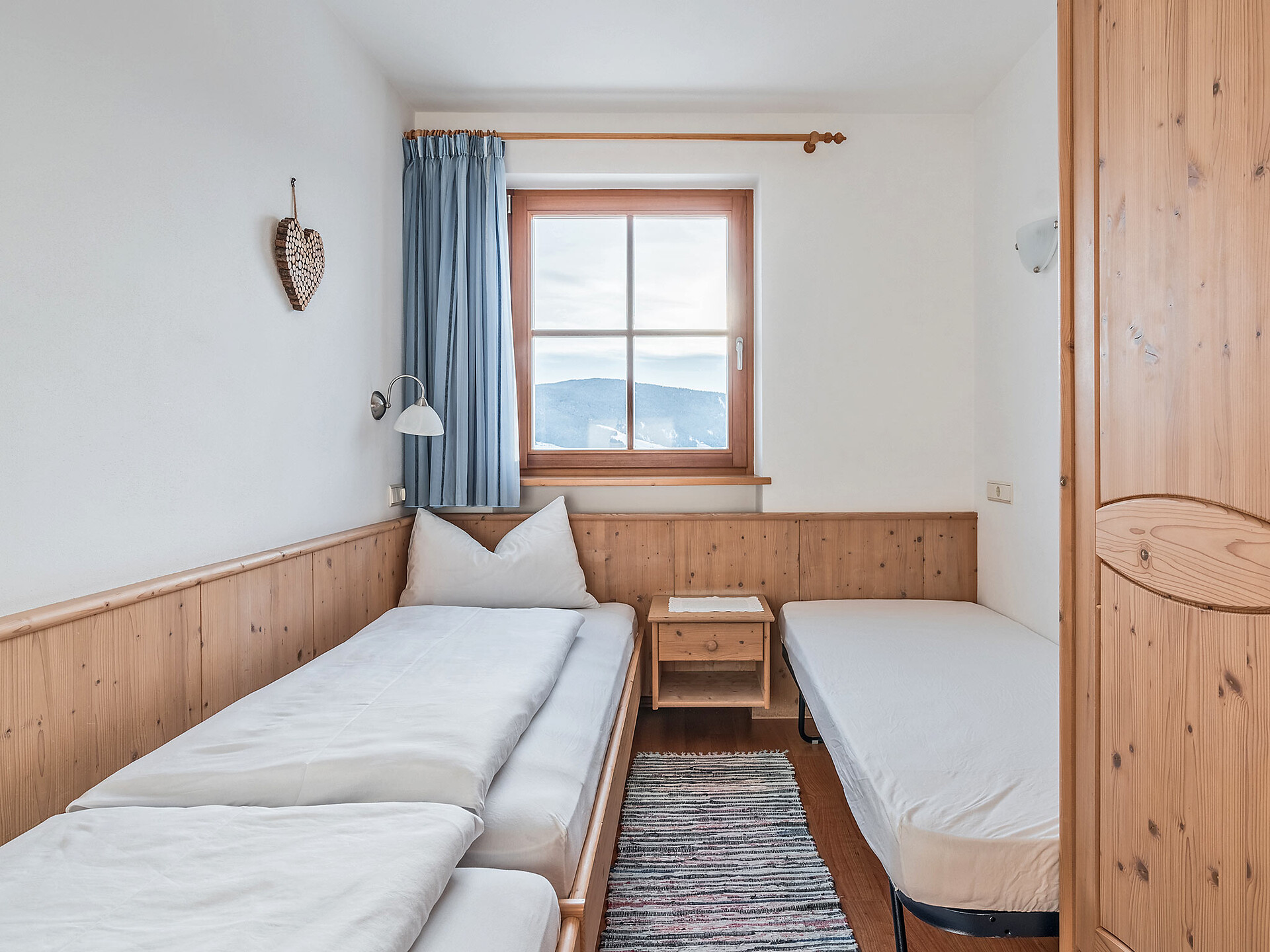 The spacious vacation apartment “Fichte” (Fir) with 50 m² floor space offers lots of space for 2 to 6 guests. The vacation apartment is located in the attic of the Birkenhof farm, its wooden ceilings provide a cozy atmosphere. Two separate bedrooms and a sunny kitchen/living room combo offers plenty of space for families. The kitchen is equipped with a fridge with icebox, ceramic stove top with four burners, oven, extractor hood, electric kettle, coffee maker (mocha), dishwasher, as well as tableware, cutlery and cookware. There is also a private balcony with a wonderful view of the Eisacktal (Valle Isarco), Pustertal (Valle Pusteria) and, weather conditions permitting, the Dolomites, too.