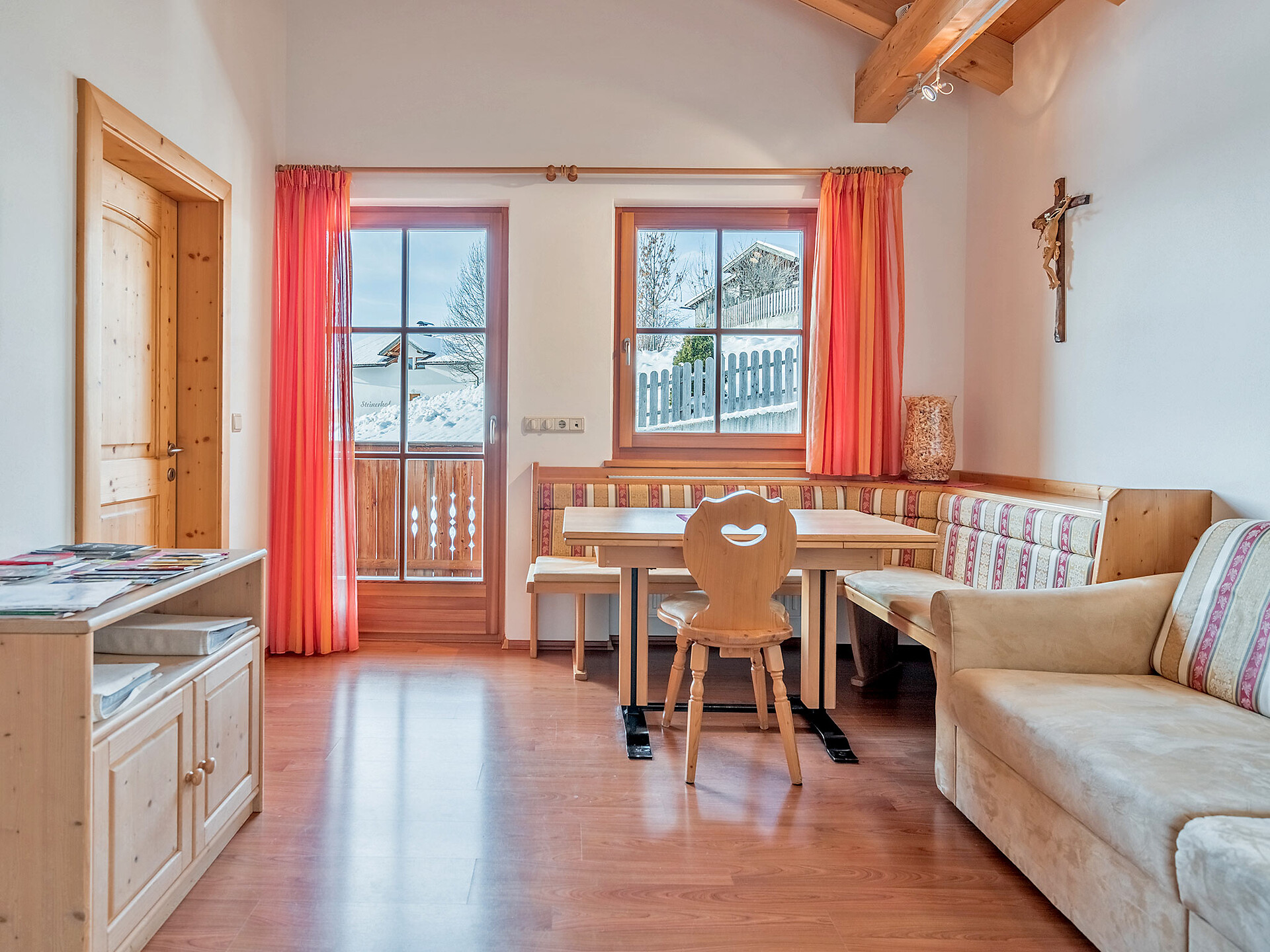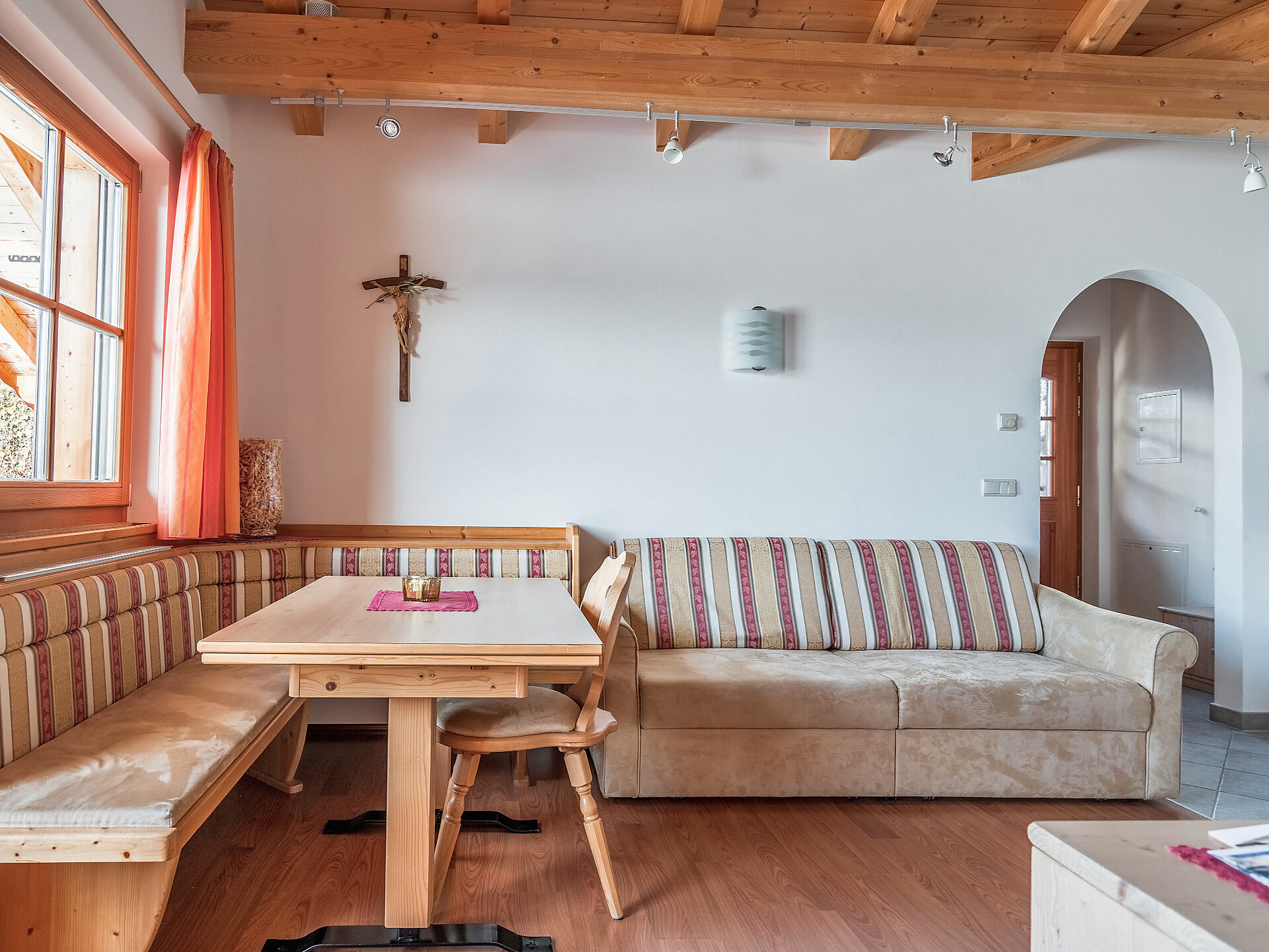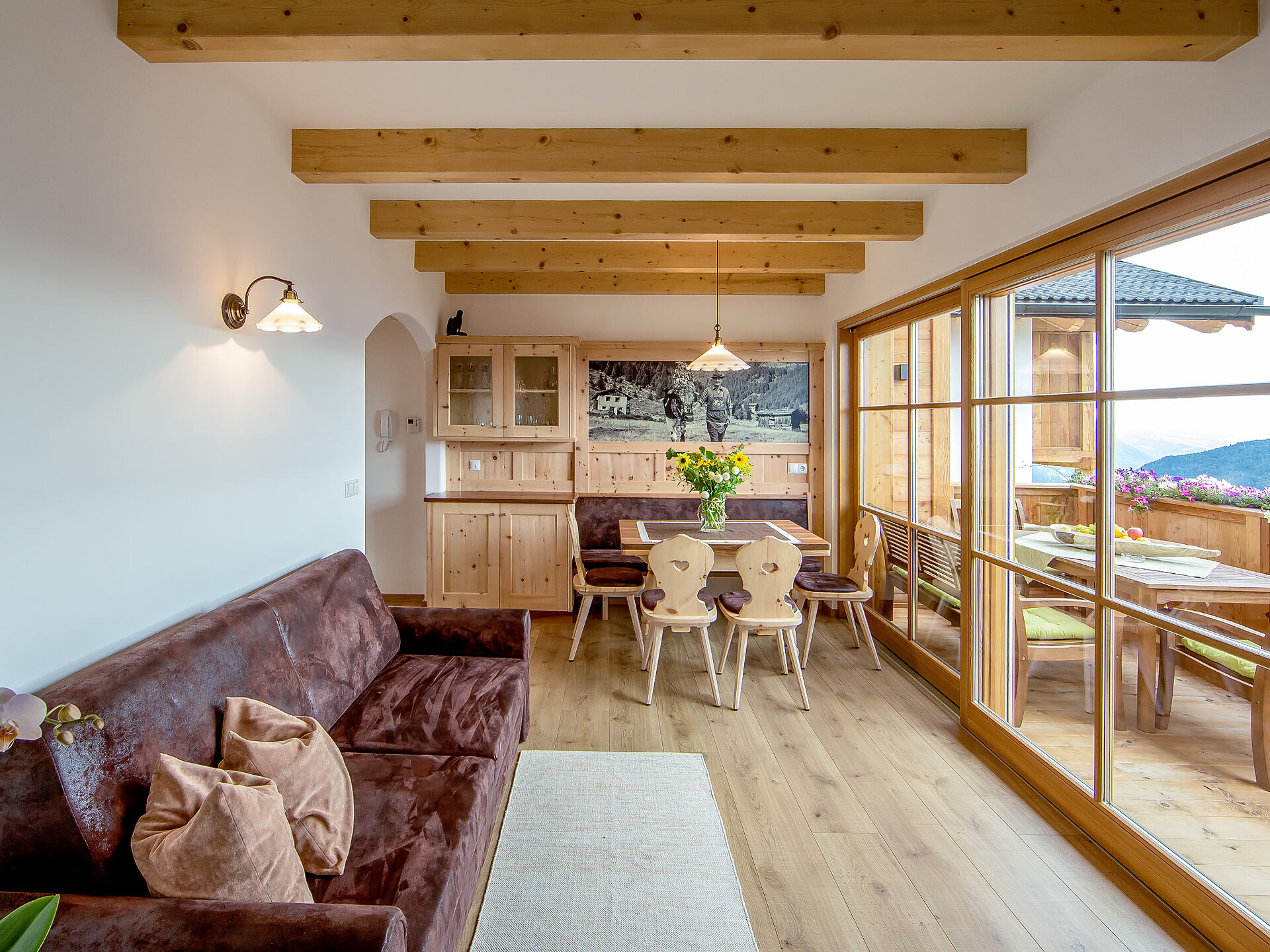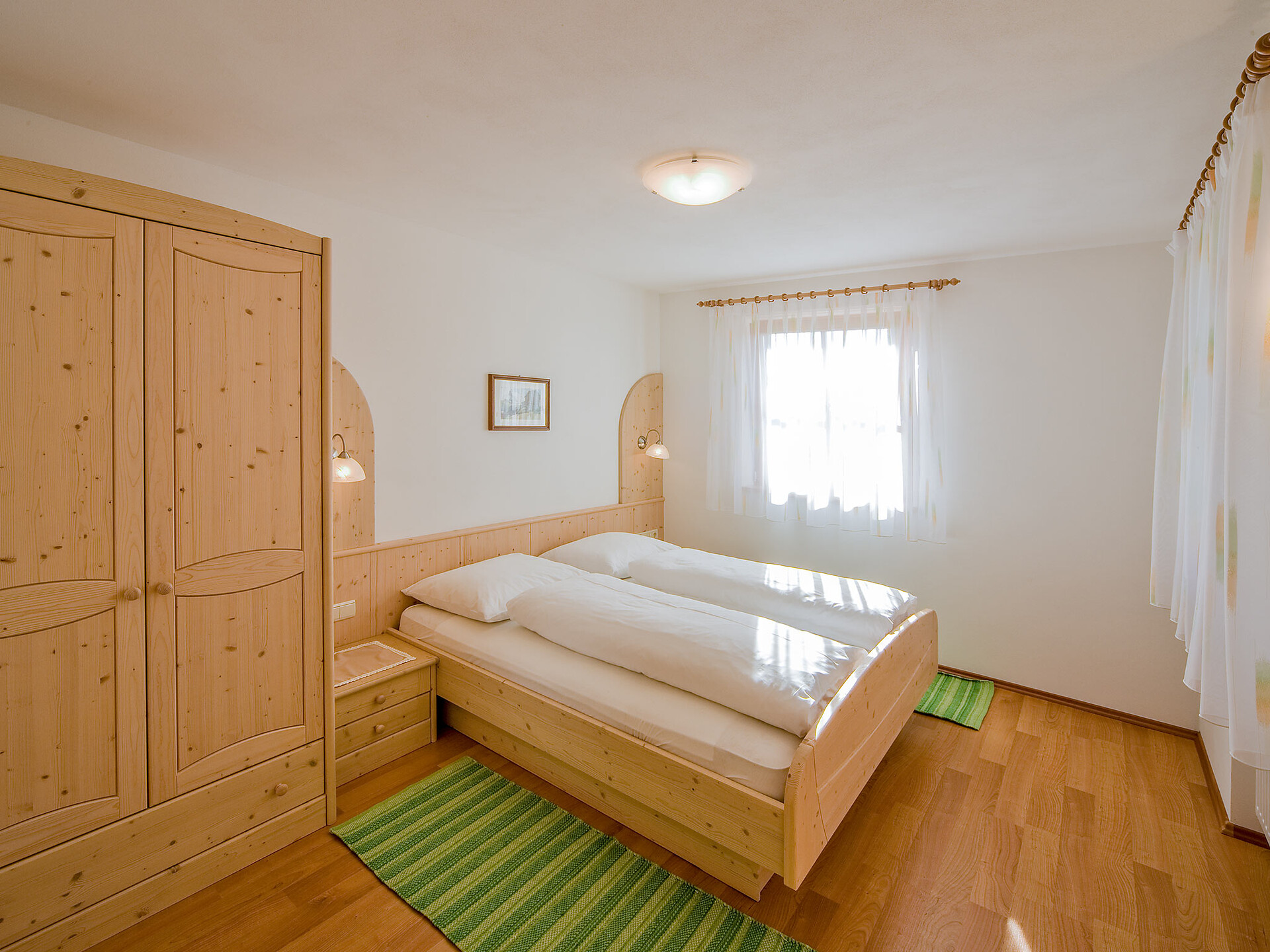 The spacious vacation apartment “Fichte” (Fir) with 50 m² floor space offers lots of space for 2 to 6 guests. The vacation apartment is located in the attic of the Birkenhof farm, its wooden ceilings provide a cozy atmosphere. Two separate bedrooms and a sunny kitchen/living room combo offers plenty of space for families. The kitchen is equipped with a fridge with icebox, ceramic stove top with four burners, oven, extractor hood, electric kettle, coffee maker (mocha), dishwasher, as well as tableware, cutlery and cookware. There is also a private balcony with a wonderful view of the Eisacktal (Valle Isarco), Pustertal (Valle Pusteria) and, weather conditions permitting, the Dolomites, too.
