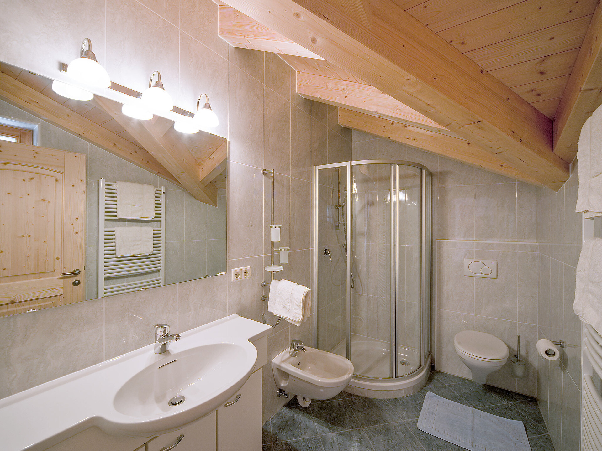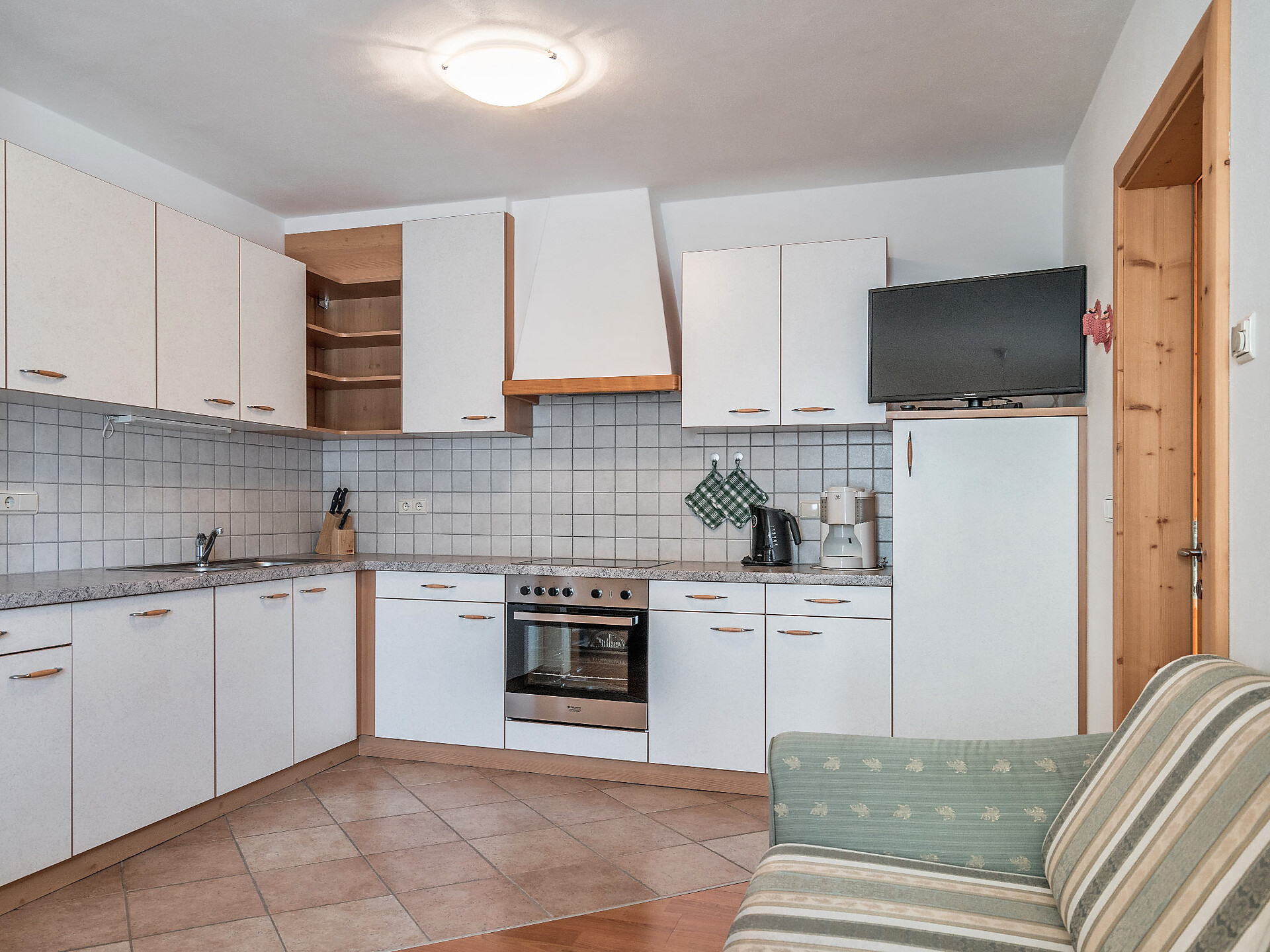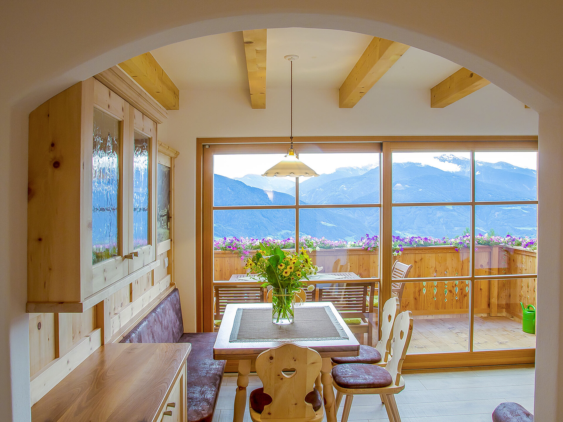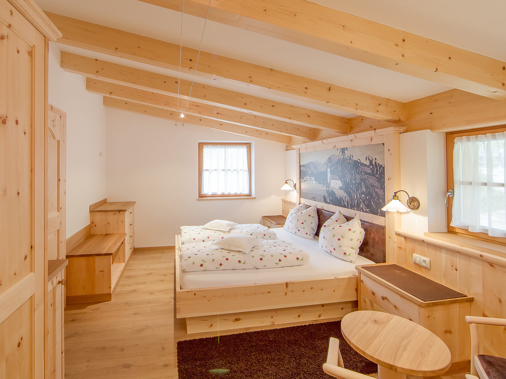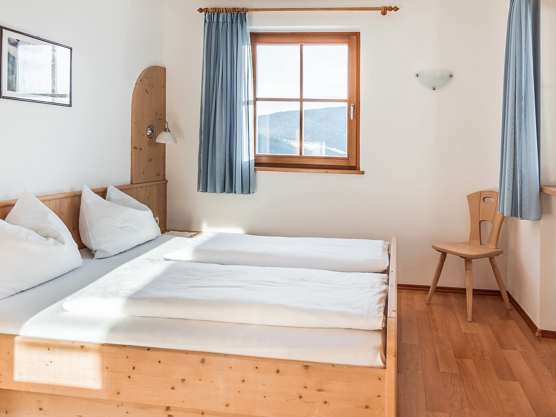 The spacious vacation apartment “Fichte” (Fir) with 50 m² floor space offers lots of space for 2 to 6 guests. The vacation apartment is located in the attic of the Birkenhof farm, its wooden ceilings provide a cozy atmosphere. Two separate bedrooms and a sunny kitchen/living room combo offers plenty of space for families. The kitchen is equipped with a fridge with icebox, ceramic stove top with four burners, oven, extractor hood, electric kettle, coffee maker (mocha), dishwasher, as well as tableware, cutlery and cookware. There is also a private balcony with a wonderful view of the Eisacktal (Valle Isarco), Pustertal (Valle Pusteria) and, weather conditions permitting, the Dolomites, too.