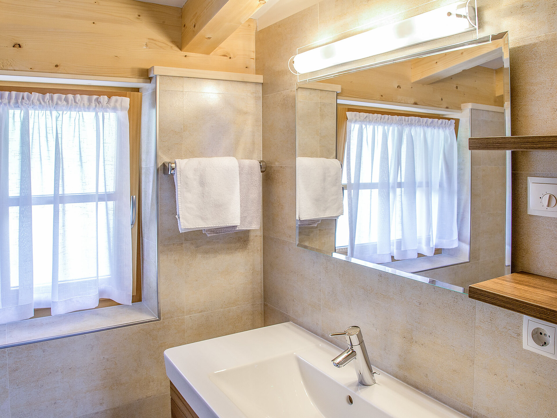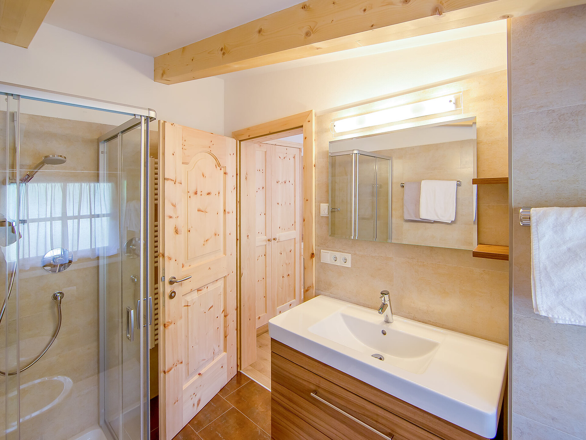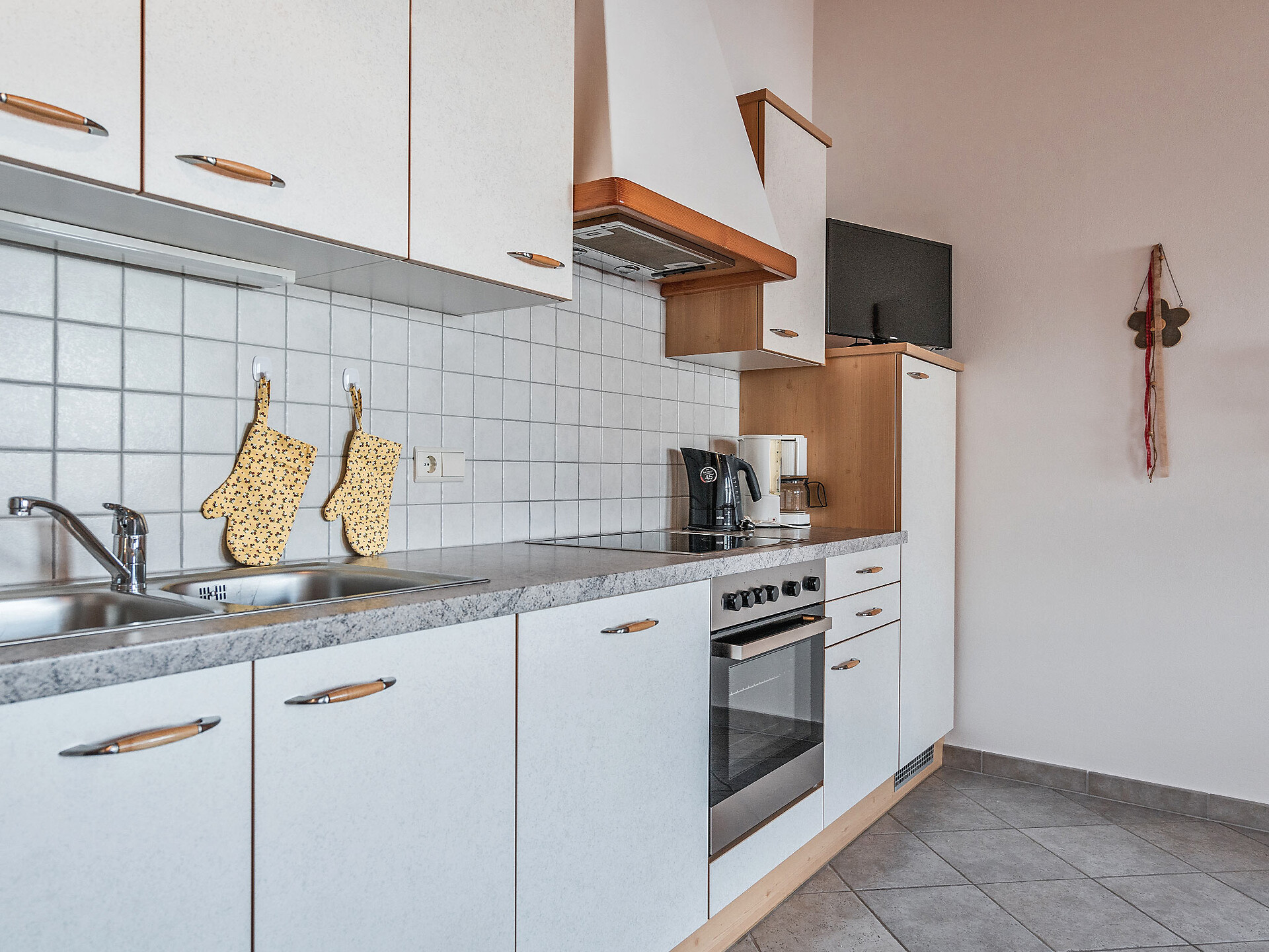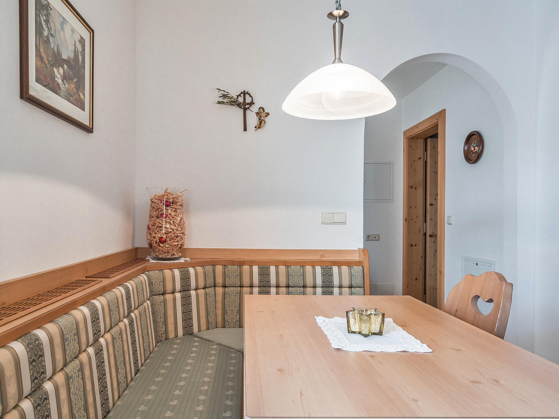 The spacious vacation apartment “Fichte” (Fir) with 50 m² floor space offers lots of space for 2 to 6 guests. The vacation apartment is located in the attic of the Birkenhof farm, its wooden ceilings provide a cozy atmosphere. Two separate bedrooms and a sunny kitchen/living room combo offers plenty of space for families. The kitchen is equipped with a fridge with icebox, ceramic stove top with four burners, oven, extractor hood, electric kettle, coffee maker (mocha), dishwasher, as well as tableware, cutlery and cookware. There is also a private balcony with a wonderful view of the Eisacktal (Valle Isarco), Pustertal (Valle Pusteria) and, weather conditions permitting, the Dolomites, too.