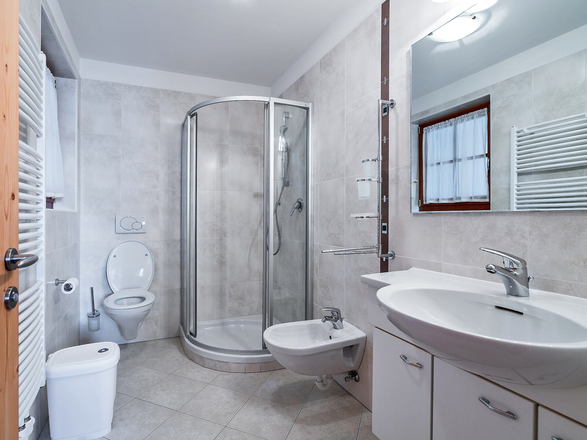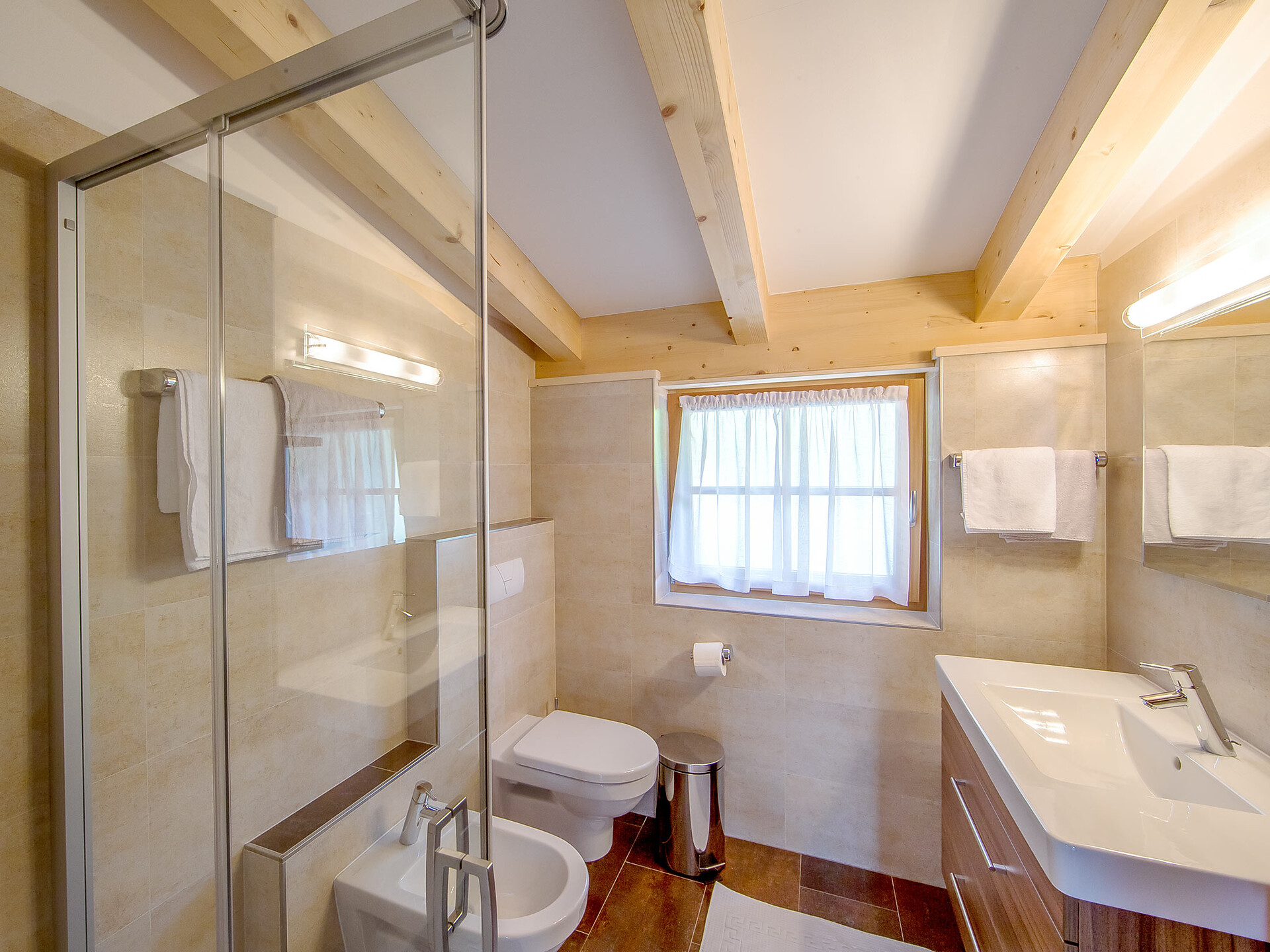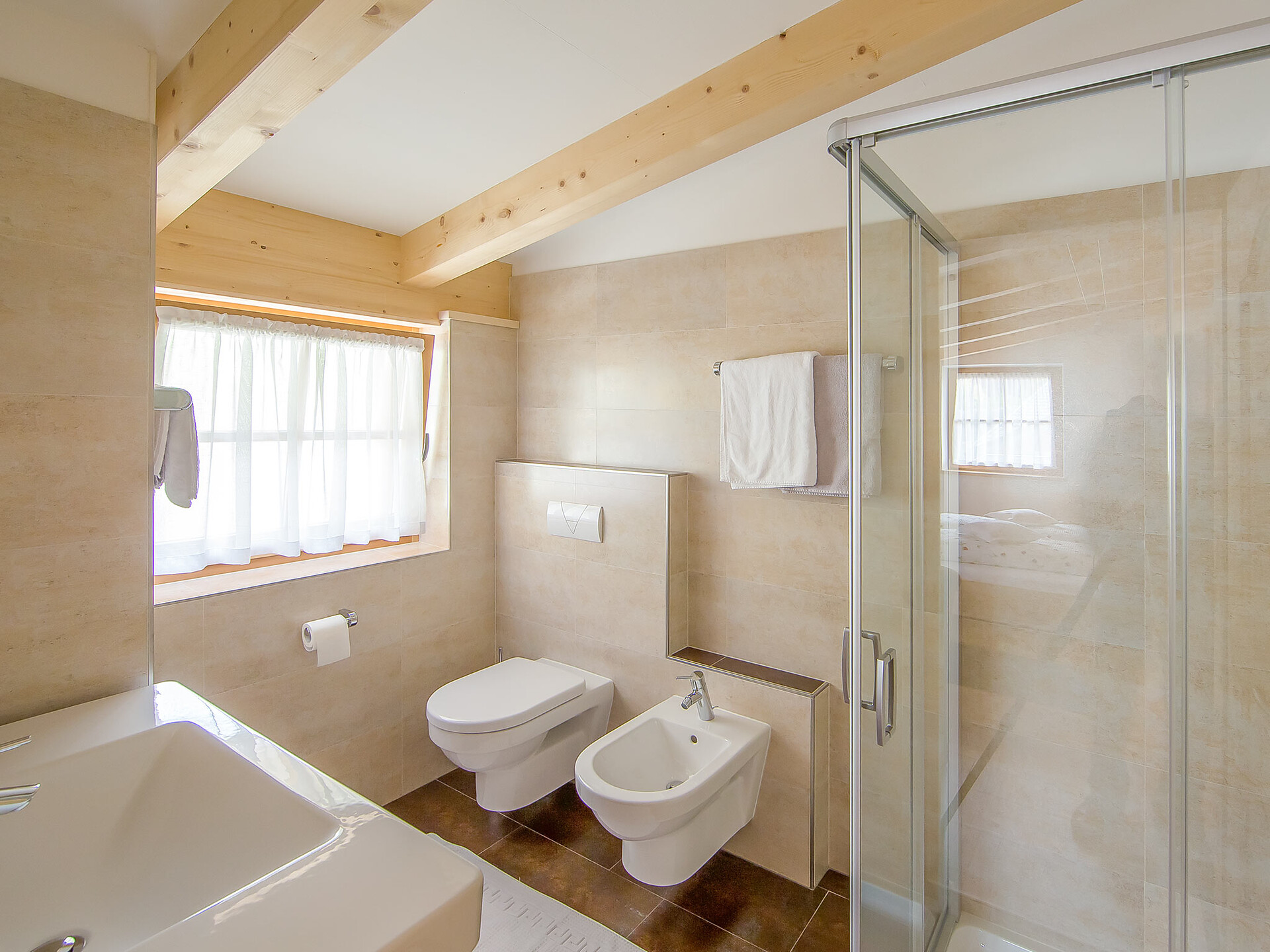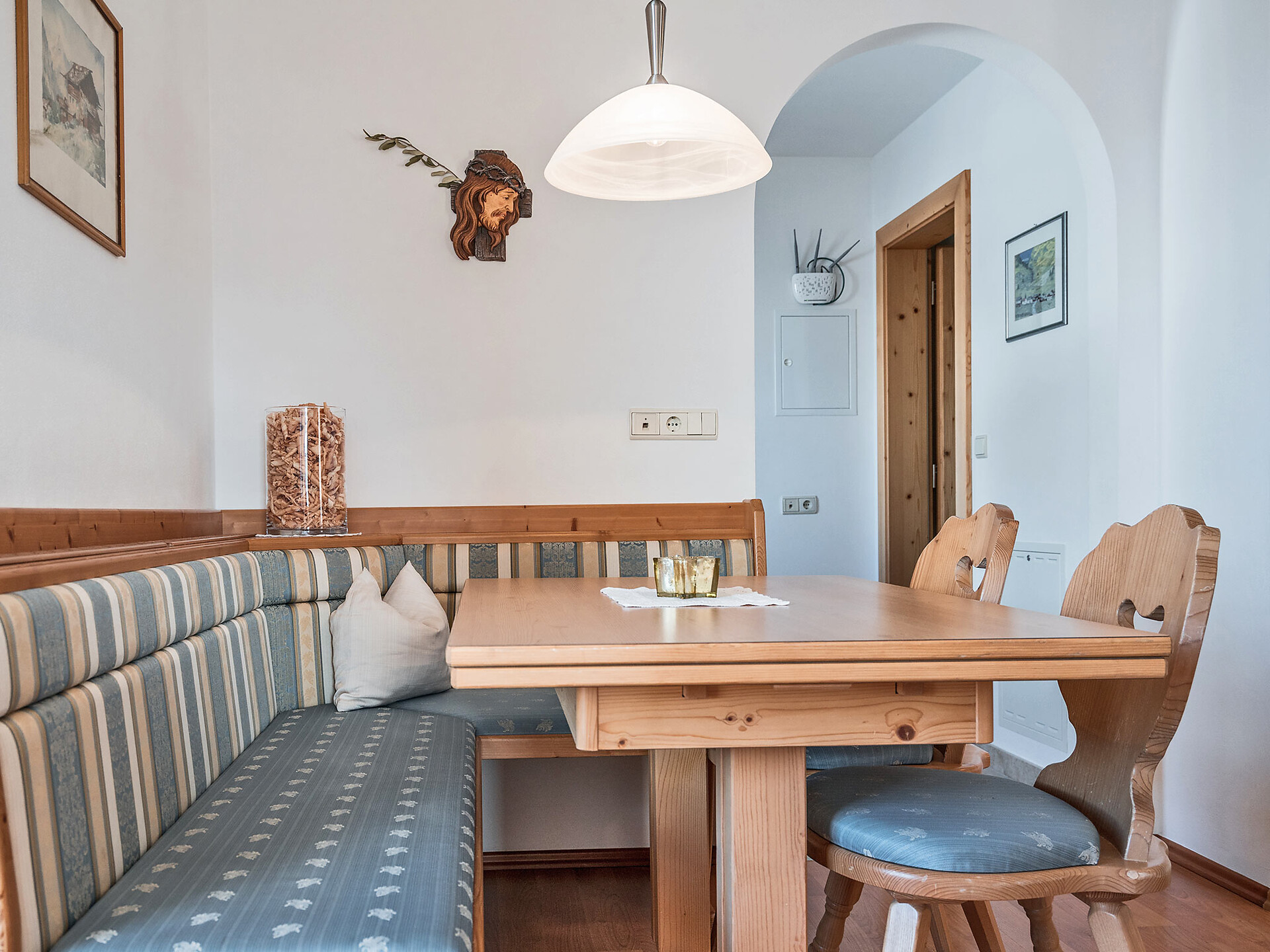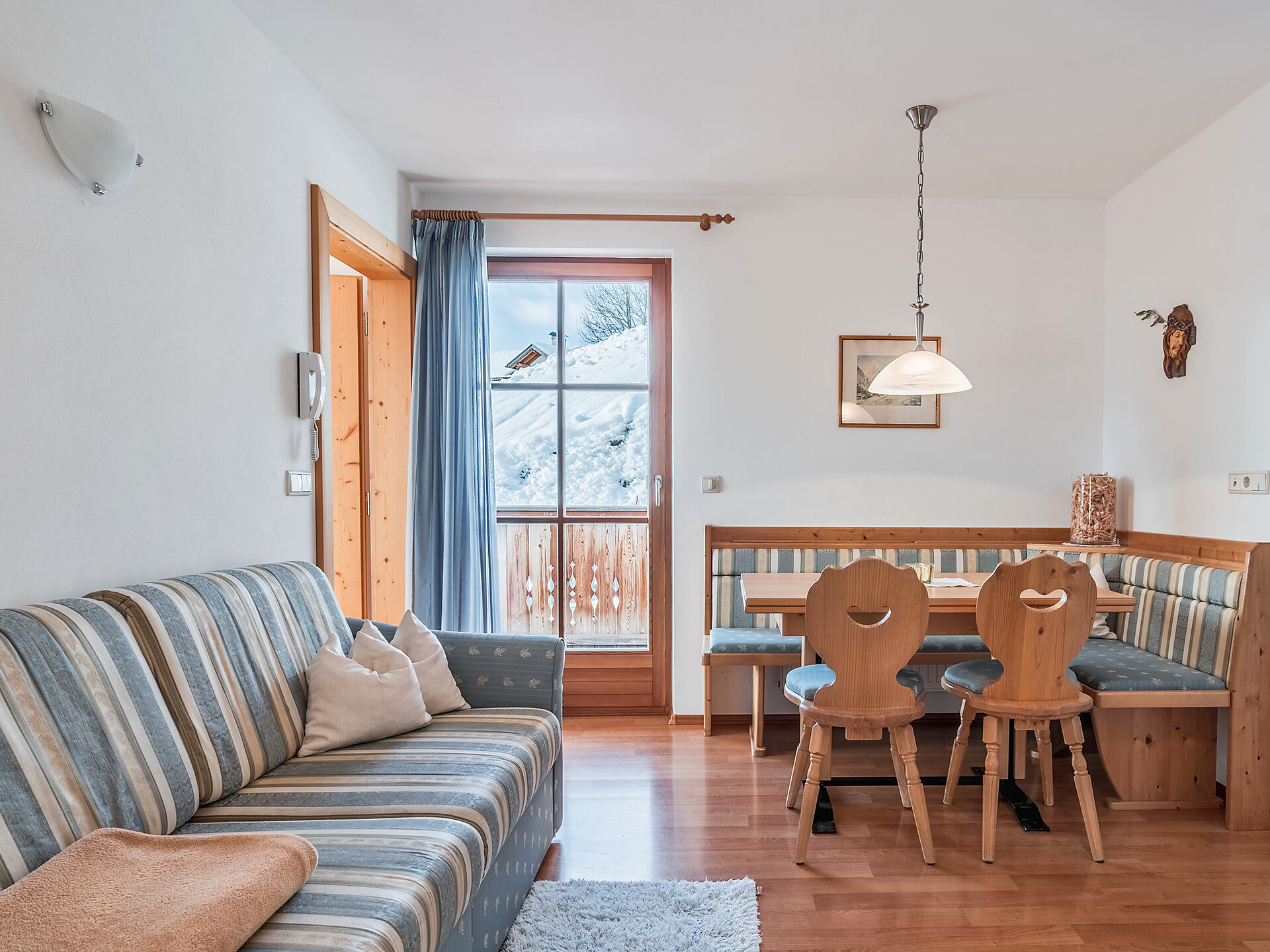 The spacious vacation apartment “Fichte” (Fir) with 50 m² floor space offers lots of space for 2 to 6 guests. The vacation apartment is located in the attic of the Birkenhof farm, its wooden ceilings provide a cozy atmosphere. Two separate bedrooms and a sunny kitchen/living room combo offers plenty of space for families. The kitchen is equipped with a fridge with icebox, ceramic stove top with four burners, oven, extractor hood, electric kettle, coffee maker (mocha), dishwasher, as well as tableware, cutlery and cookware. There is also a private balcony with a wonderful view of the Eisacktal (Valle Isarco), Pustertal (Valle Pusteria) and, weather conditions permitting, the Dolomites, too.