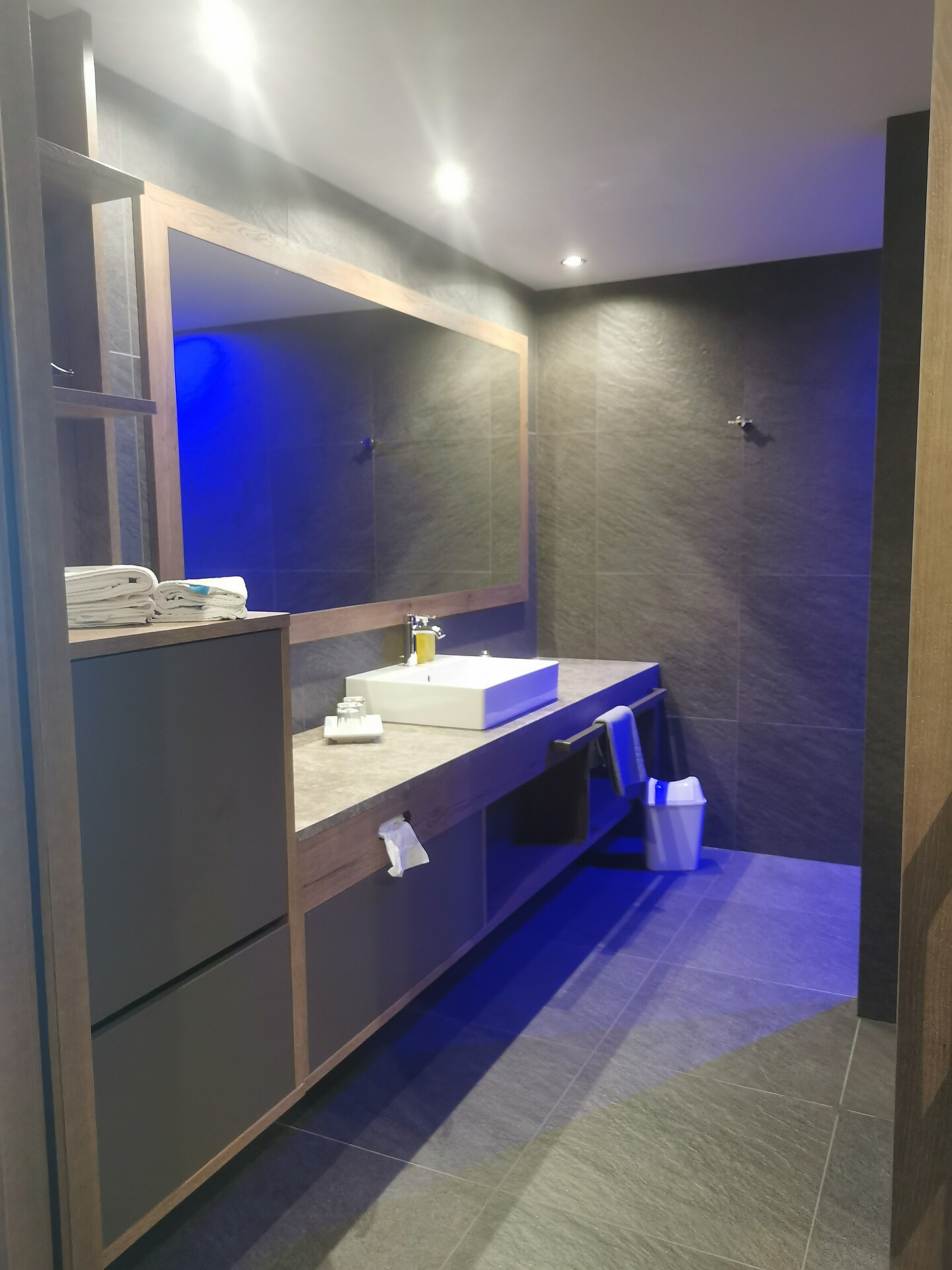 Walk-in shower, toilet, wash basin, hairdryer, makeup mirror, bathroom necessities