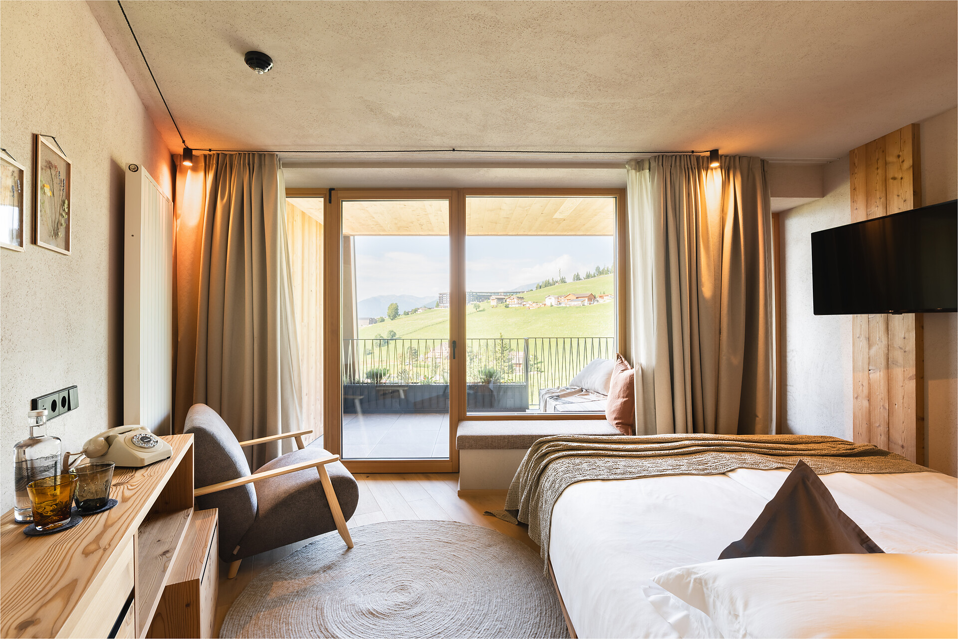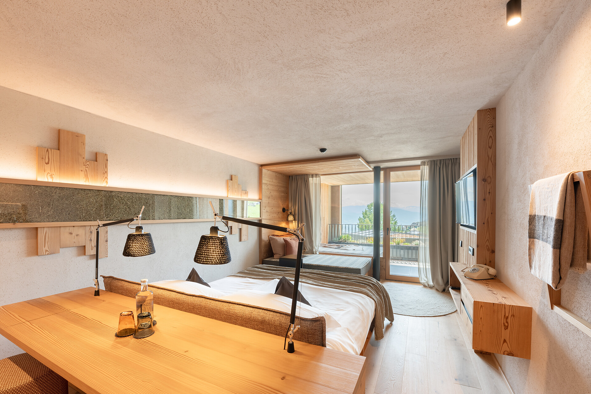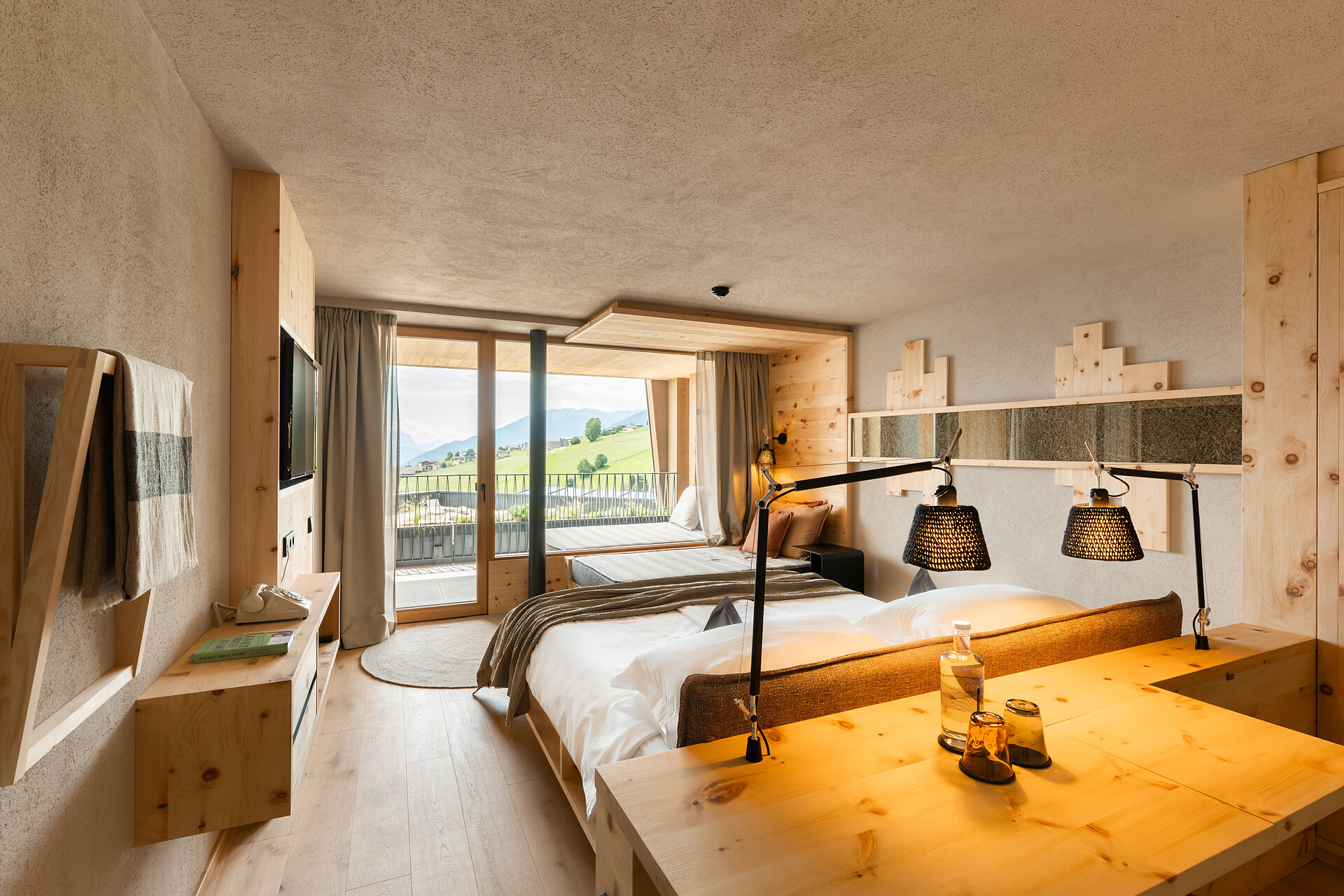 Stylish, bright panoramic room. South-facing relaxation loggia (9m2) with sunny sweeping view of the Dolomites. High-quality orthopaedic bioenergetic sleep system.
