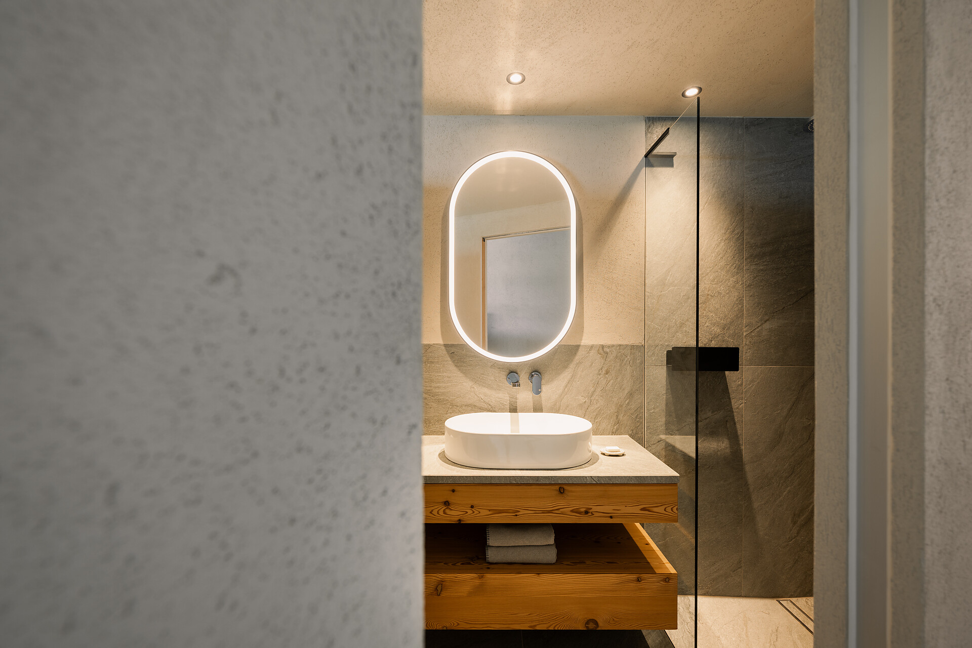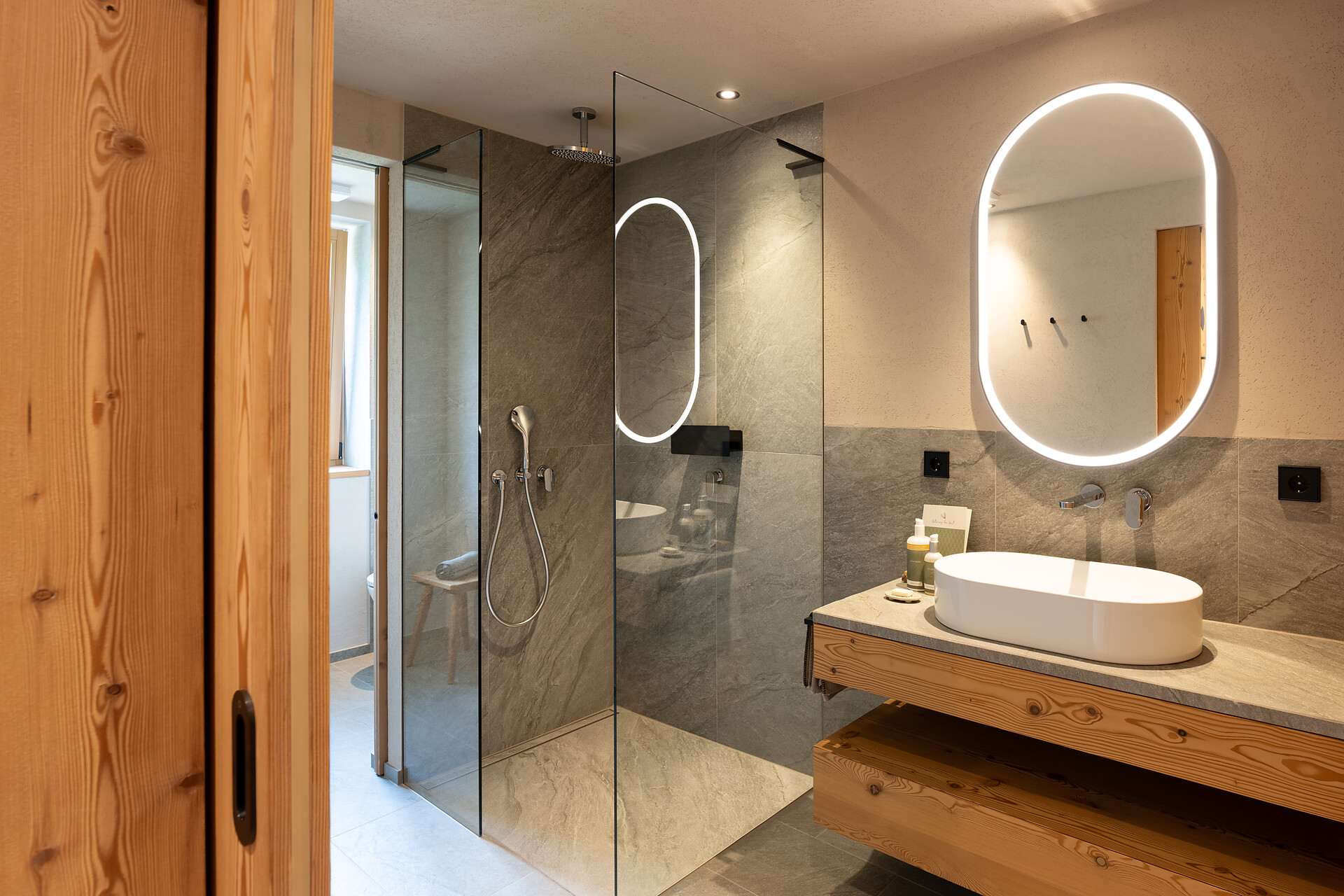 Exclusive natural design with warm larch wood and elegant silver quartzite. North orientation with a view to the Alpine meadows, for nest-like cosiness and complete privacy. Private lounge area with tea bar, spring water fountain and library. Wellness bathroom with large shower, bath with a selection of bath salts and separate WC with bidet. Large spa loggia (14m2) with private stone pine sauna, choice of sauna fragrances and barefoot course.