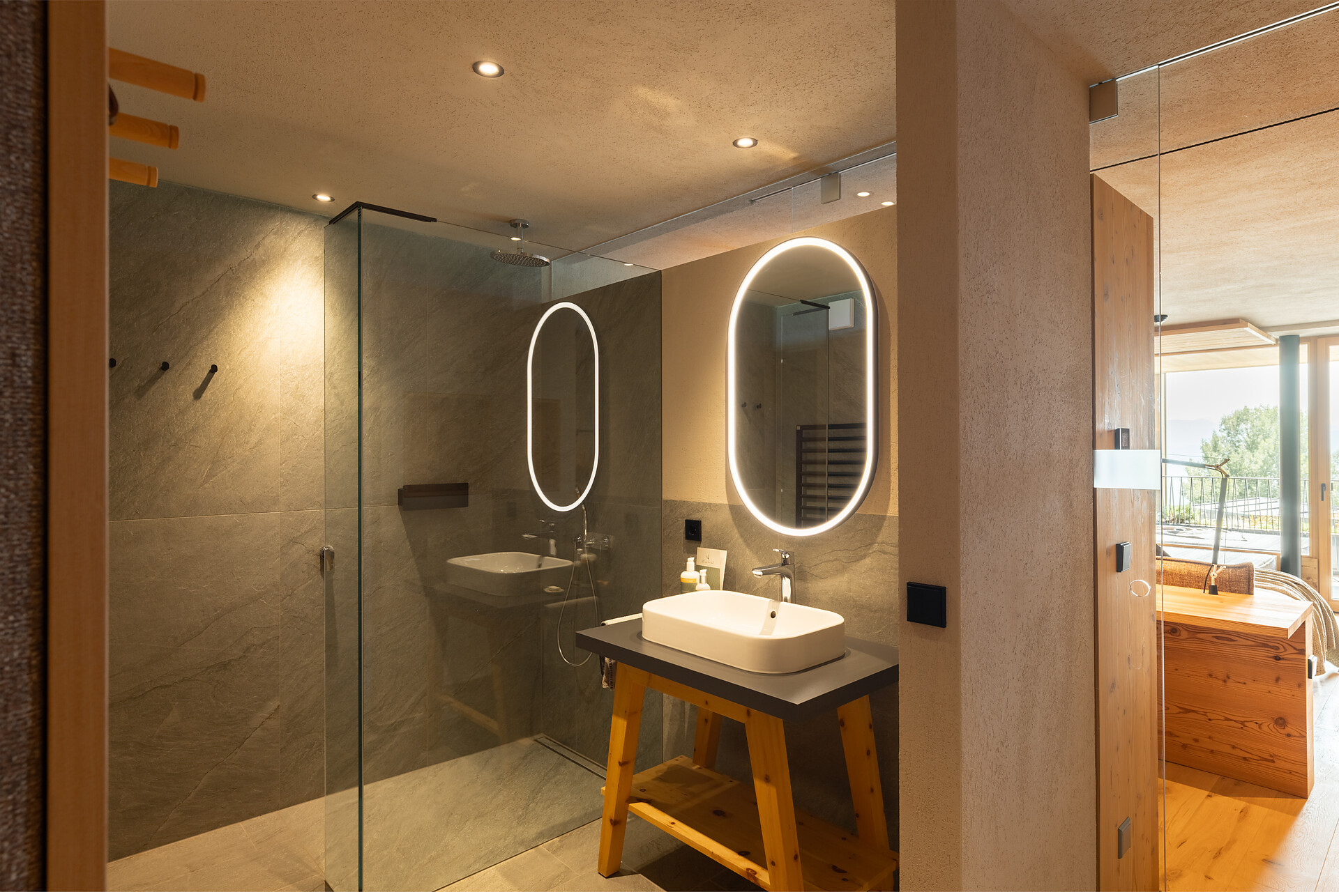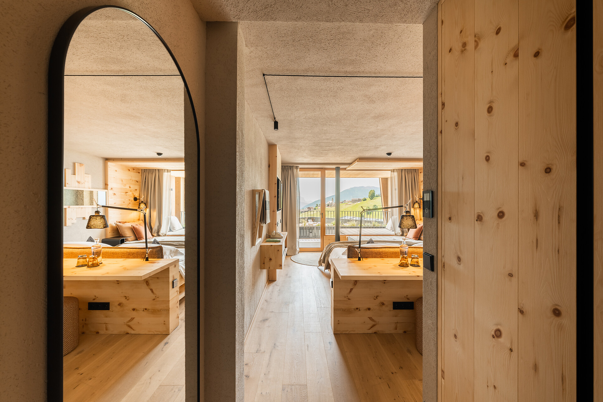 Designer rooms with health-promoting, locally sourced stone pine. South-facing relaxation loggia (23m2) with rocking loungers, a panoramic view of the Dolomites and impressive sunsets to the west. Power Sleeping Room®:: equipped with the bioenergetic earth-grounding bed system by Samina for improved sleep. Wellness bathroom with separate WC and bidet. Highlight: a private Finnish stone-pine sauna with choice of fragrances and herbal tea bar.