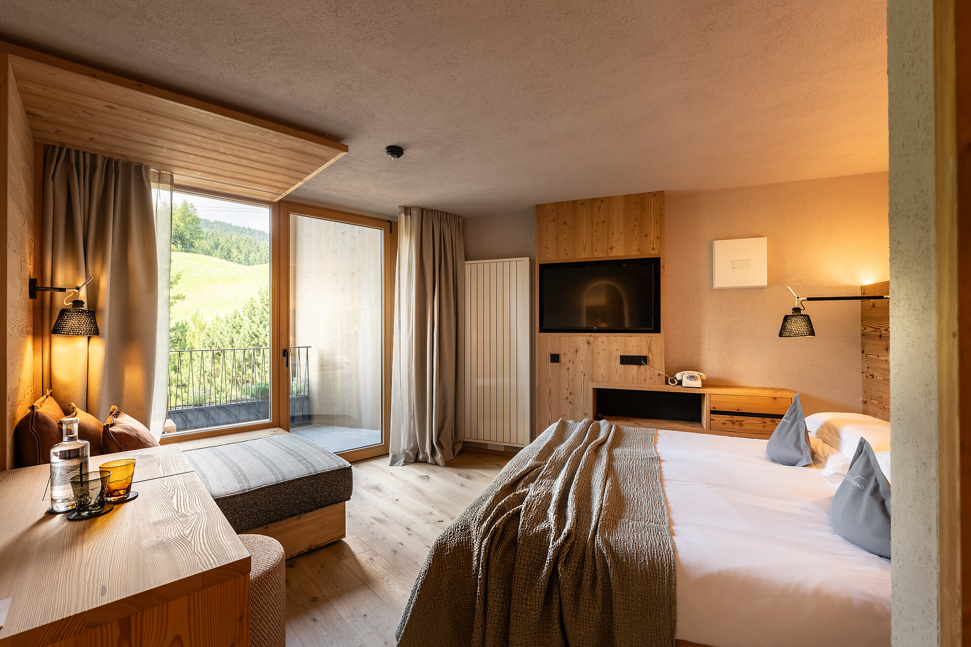 Stylish panoramic room with plenty of space and sunlight. South-facing relaxation loggia (15m2) with sunny, sweeping view of the Dolomites. Power Sleeping Room®: equipped with the bioenergetic earth-grounding bed system by Samina for improved sleep.
