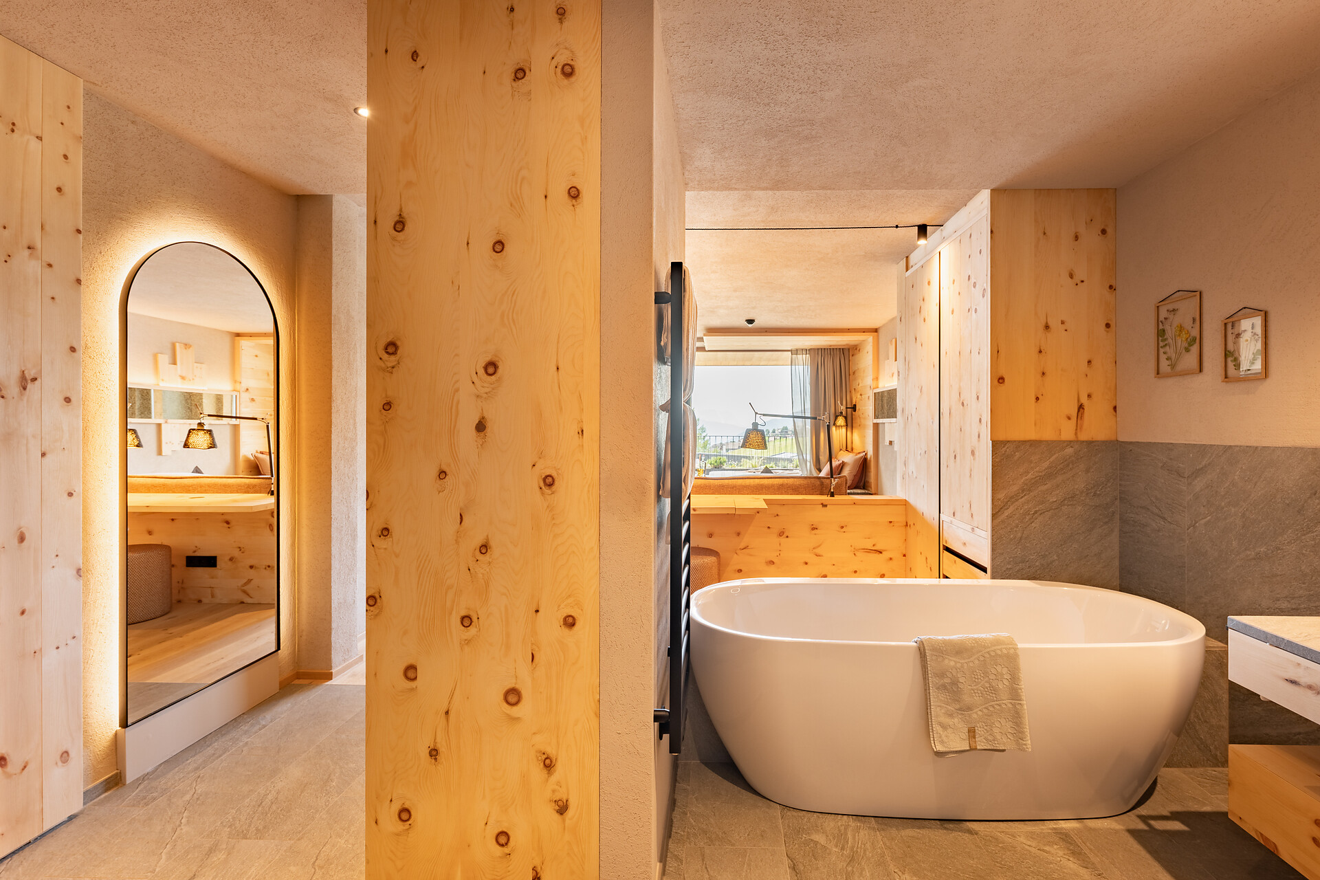 New designer room with health-promoting, locally sourced stone pine. South-facing relaxation loggia (9m2) with sunny, sweeping view of the Dolomites. Power Sleeping Room®: equipped with the bioenergetic earth-grounding bed system by Samina for improved sleep. Open-plan wellness bathroom with shower and freestanding bath, and a separate WC and bidet.