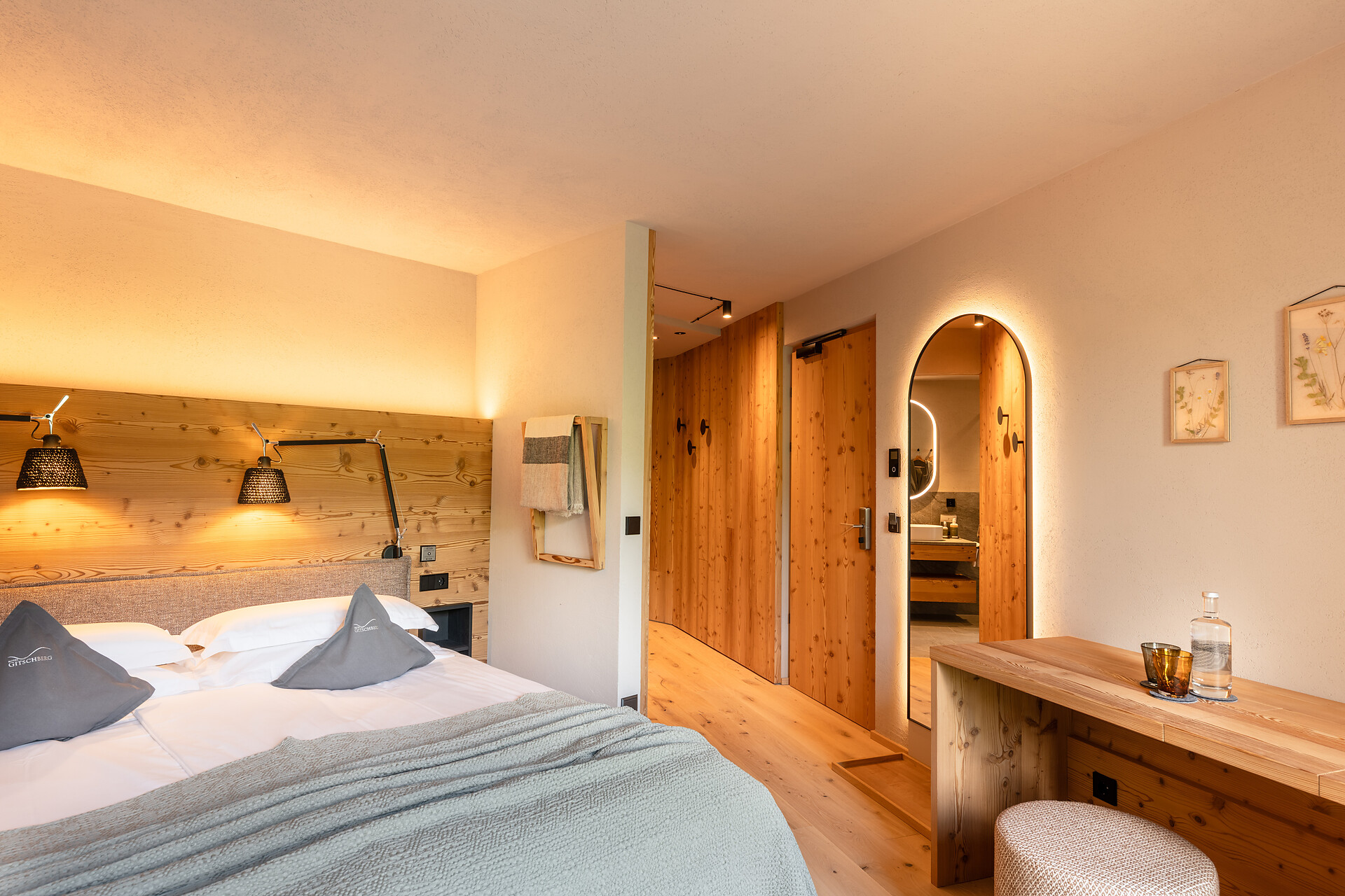Designer room, natural and wonderfully bright, with cosy larch wood furnishings. South-facing relaxation loggia (8m2) with sunny view of the Dolomites. High-quality orthopaedic bioenergetic sleep system. Closed-plan bathroom with separate WC and bidet.